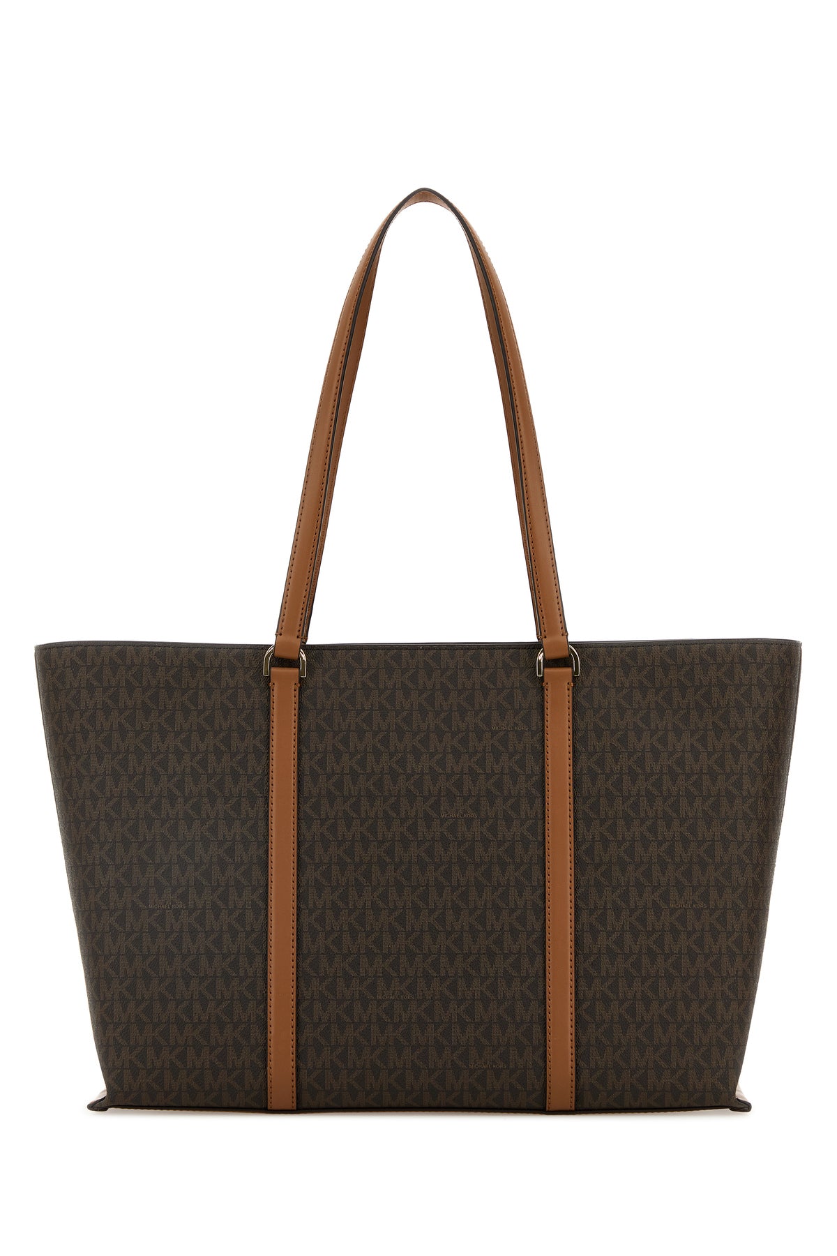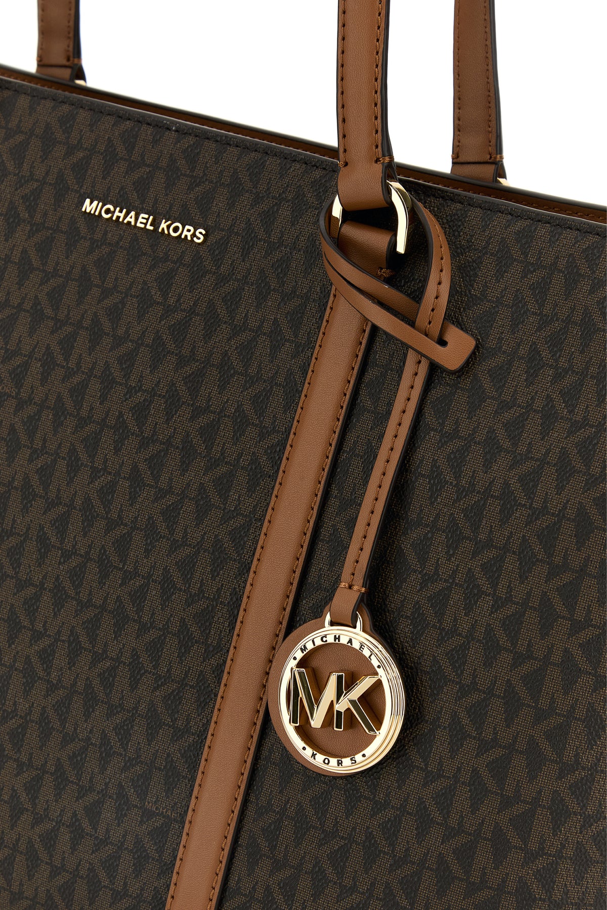 Shopping bag realized in grained canvas characterized by logoed print on the entire surface enriched by metal lettering logo at the front and detachable logoed accessory.