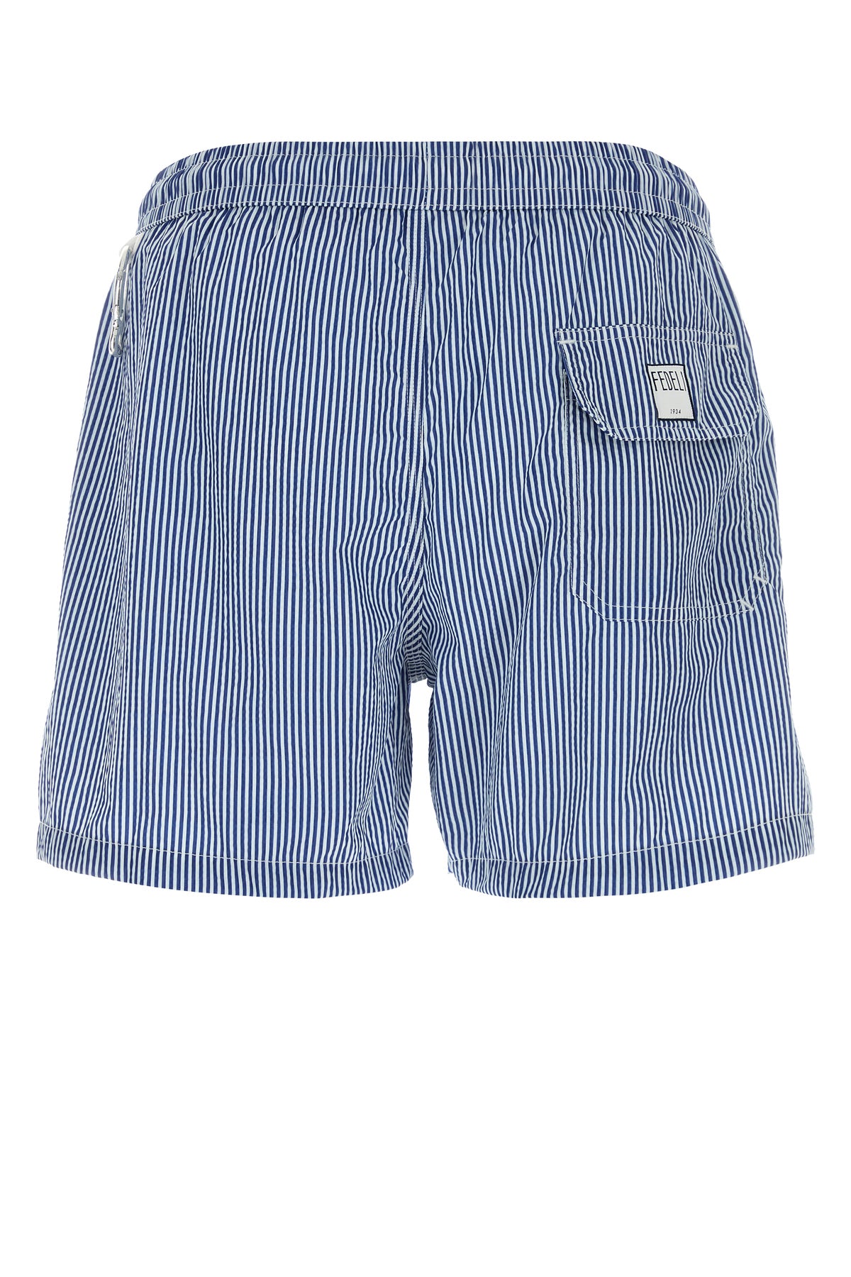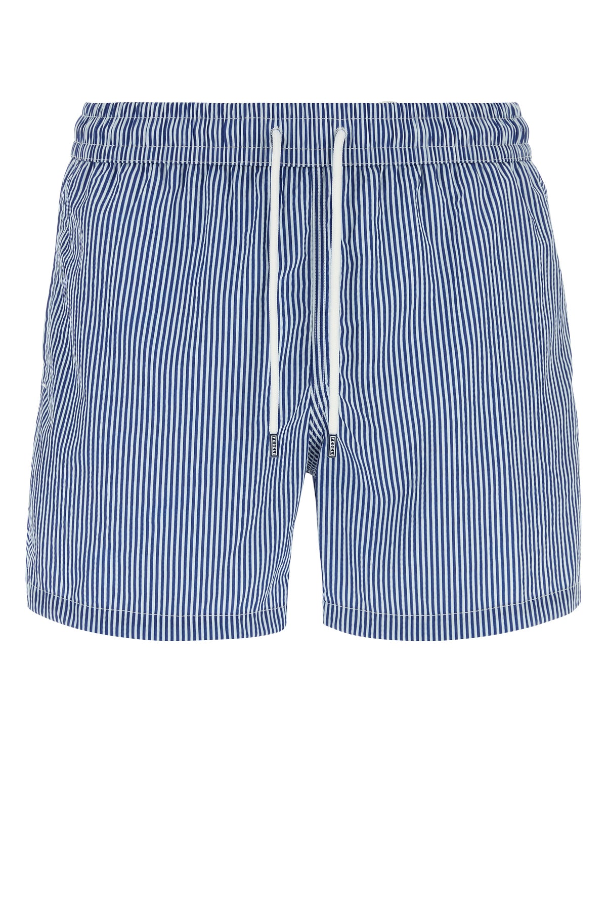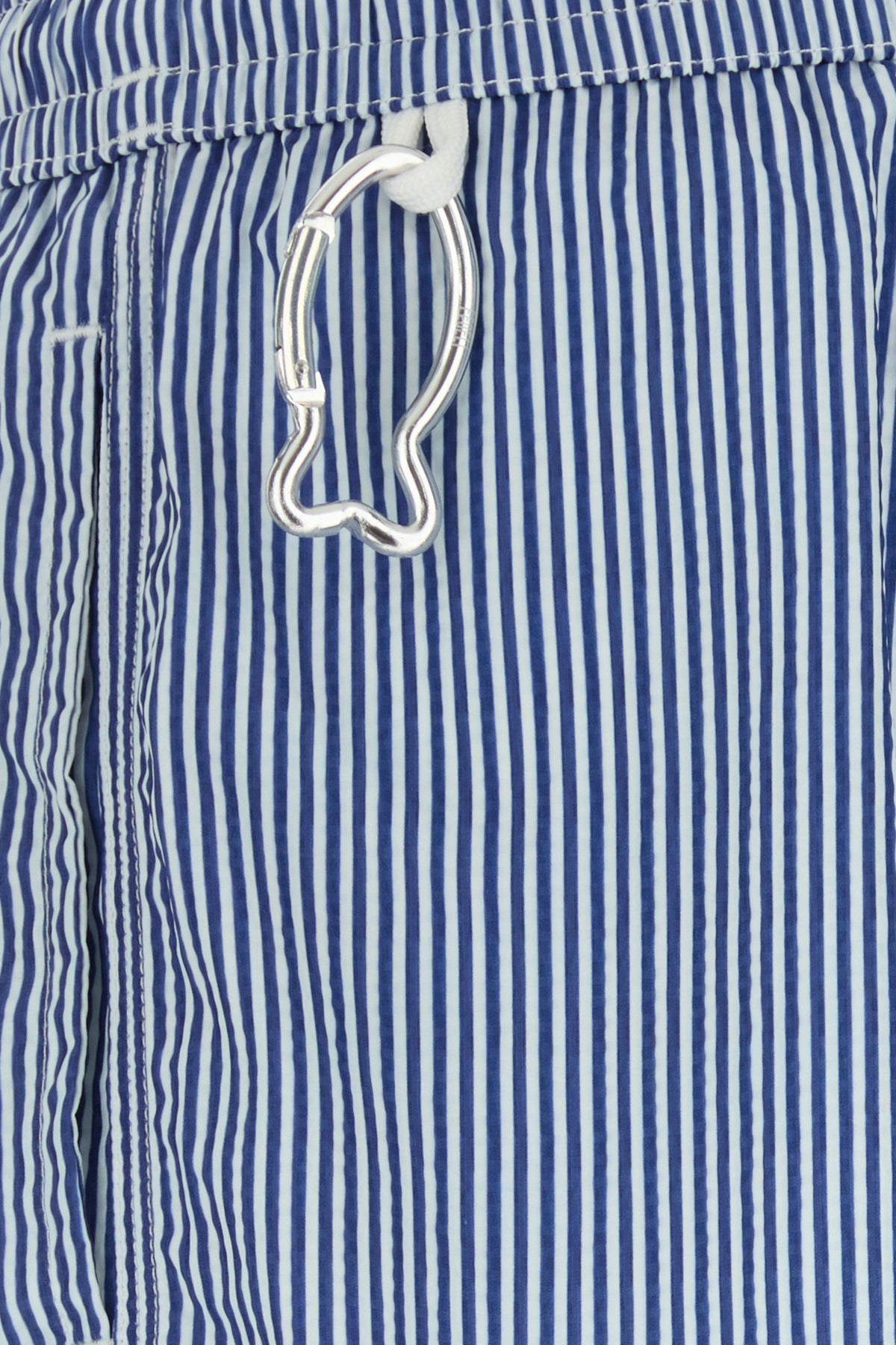 Swimming shorts realized in polyester blend characterized by striped print on the entire surface enriched by logoed label at the back.
