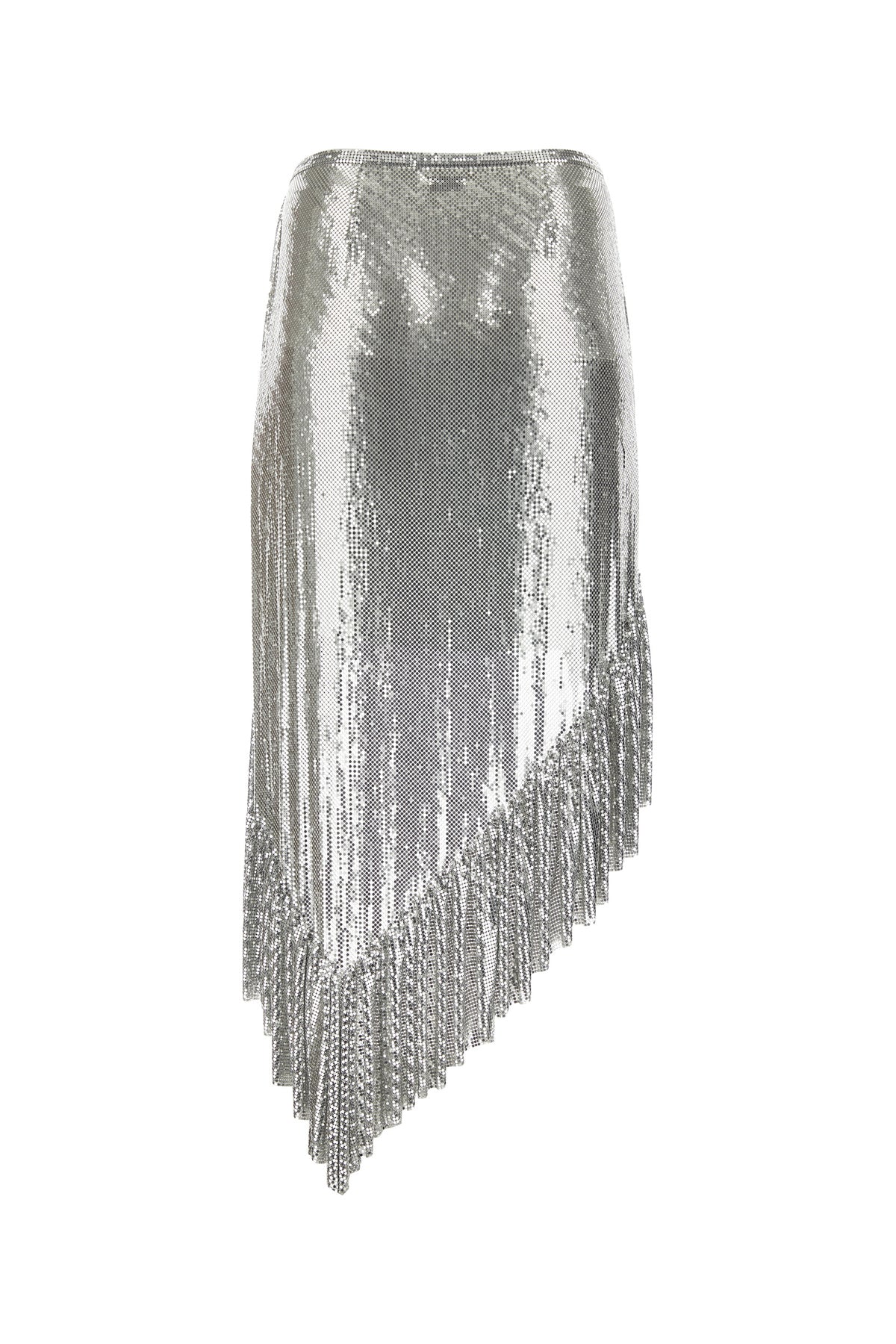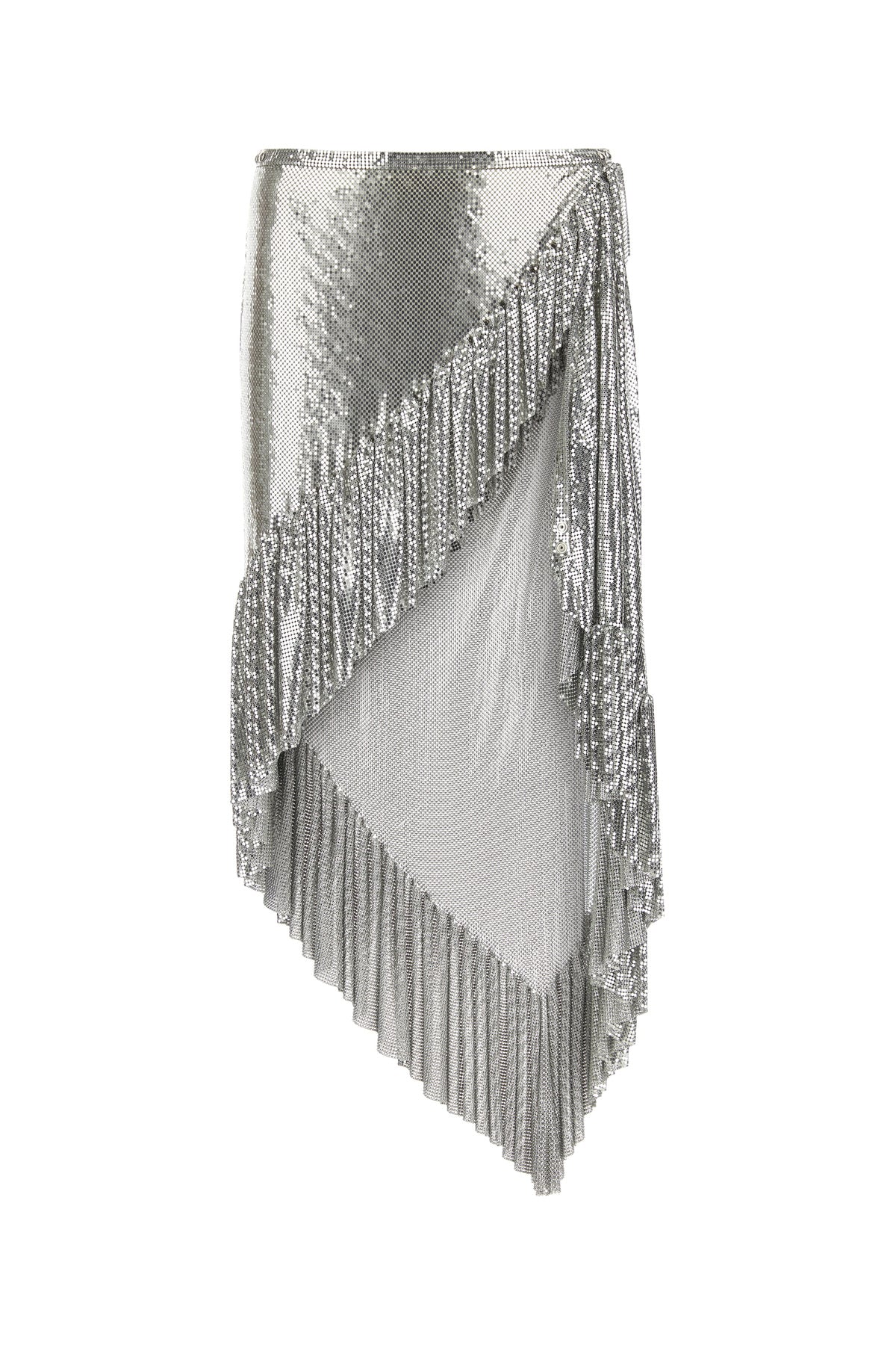 Skirt realized in chain mail characterized by flounces at the front and on the hemline.