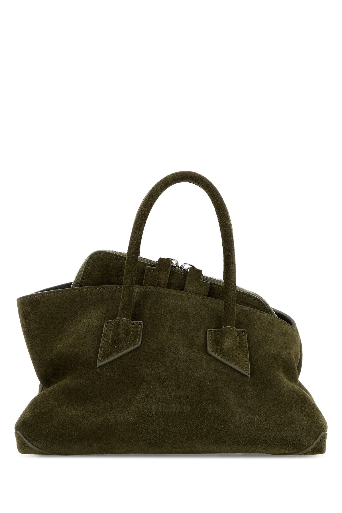 Handbag realized in suede characterized by embossed logo at the front.
