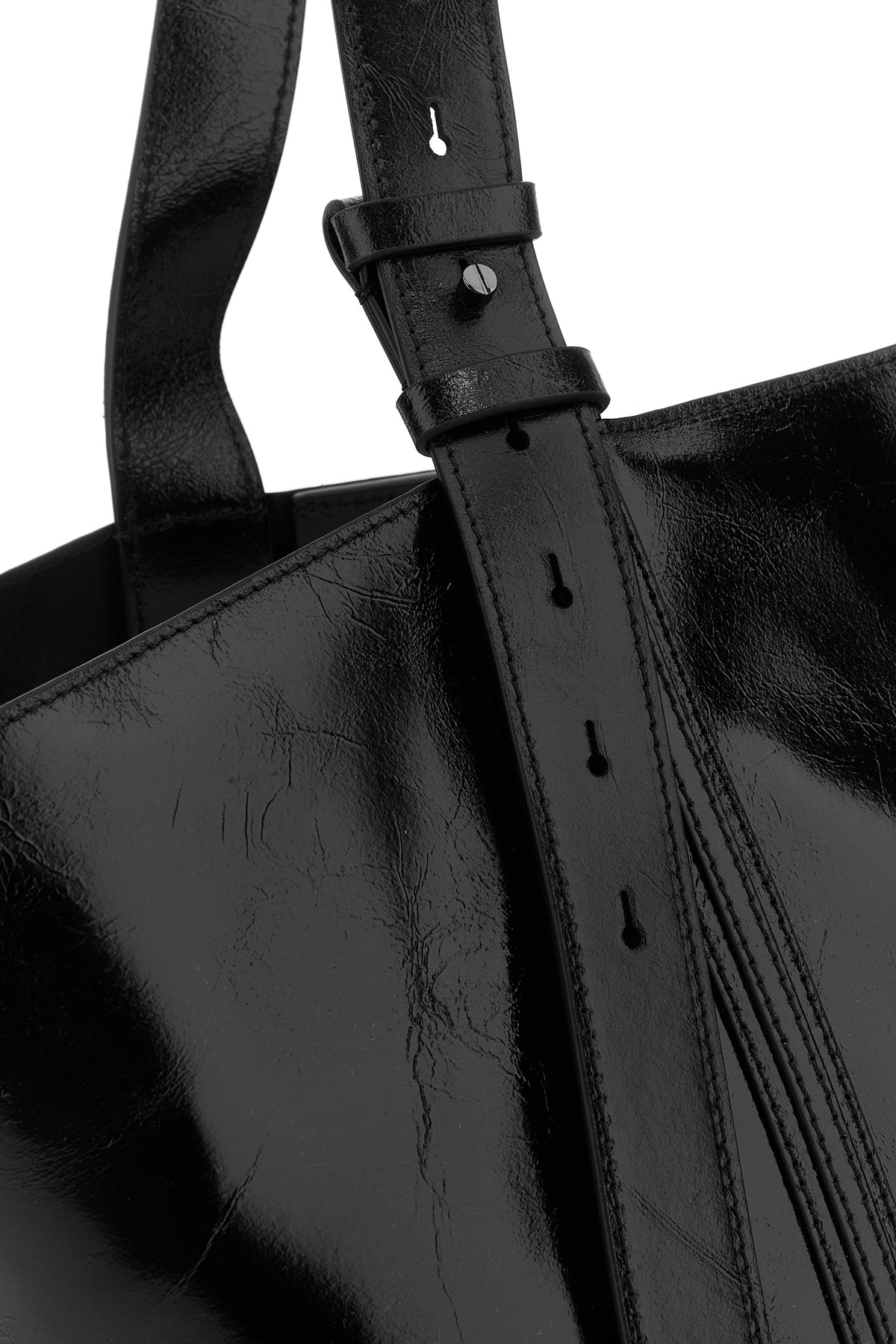 Shopping bag realized in polished finish leather characterized by laminated printed logo at the front.