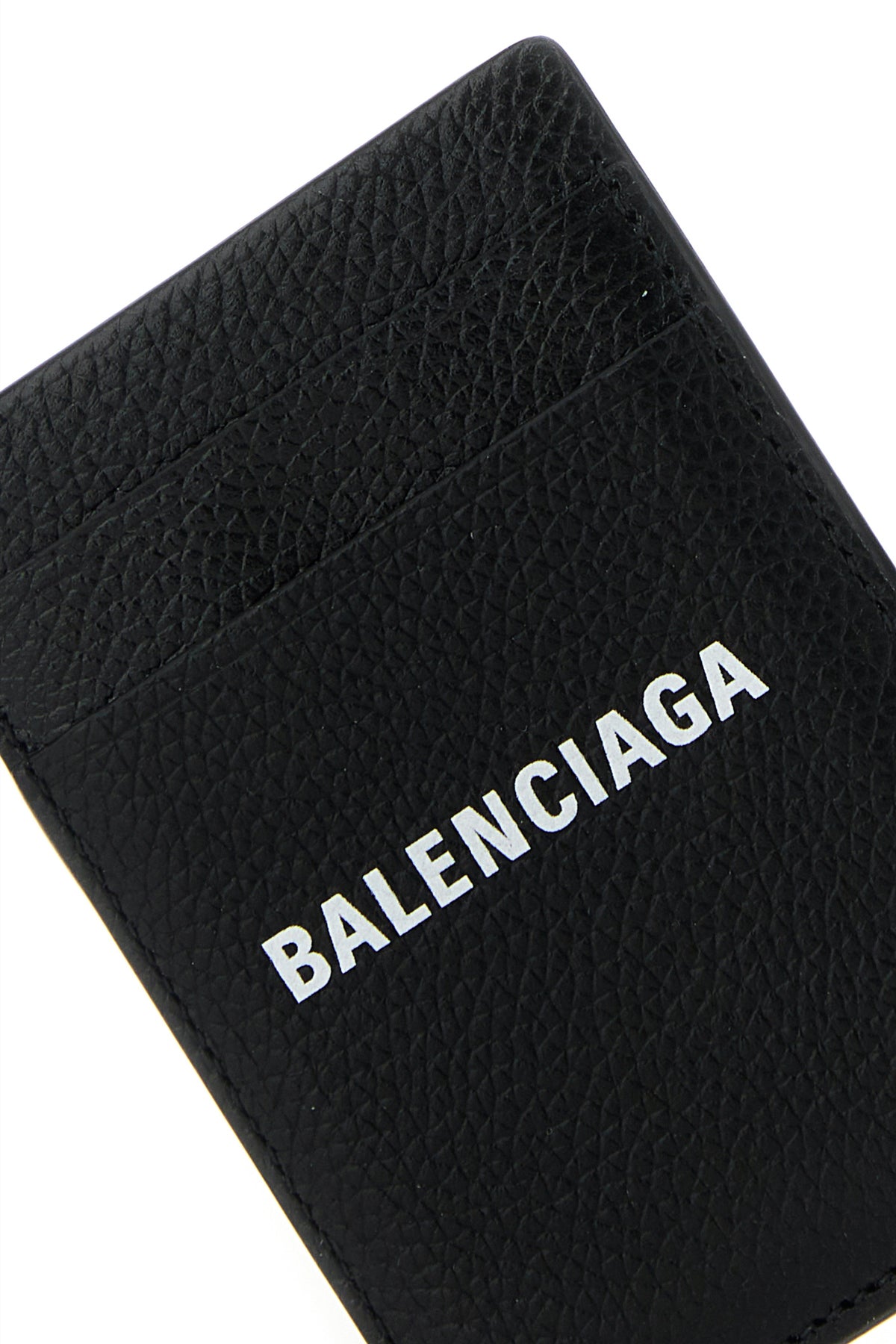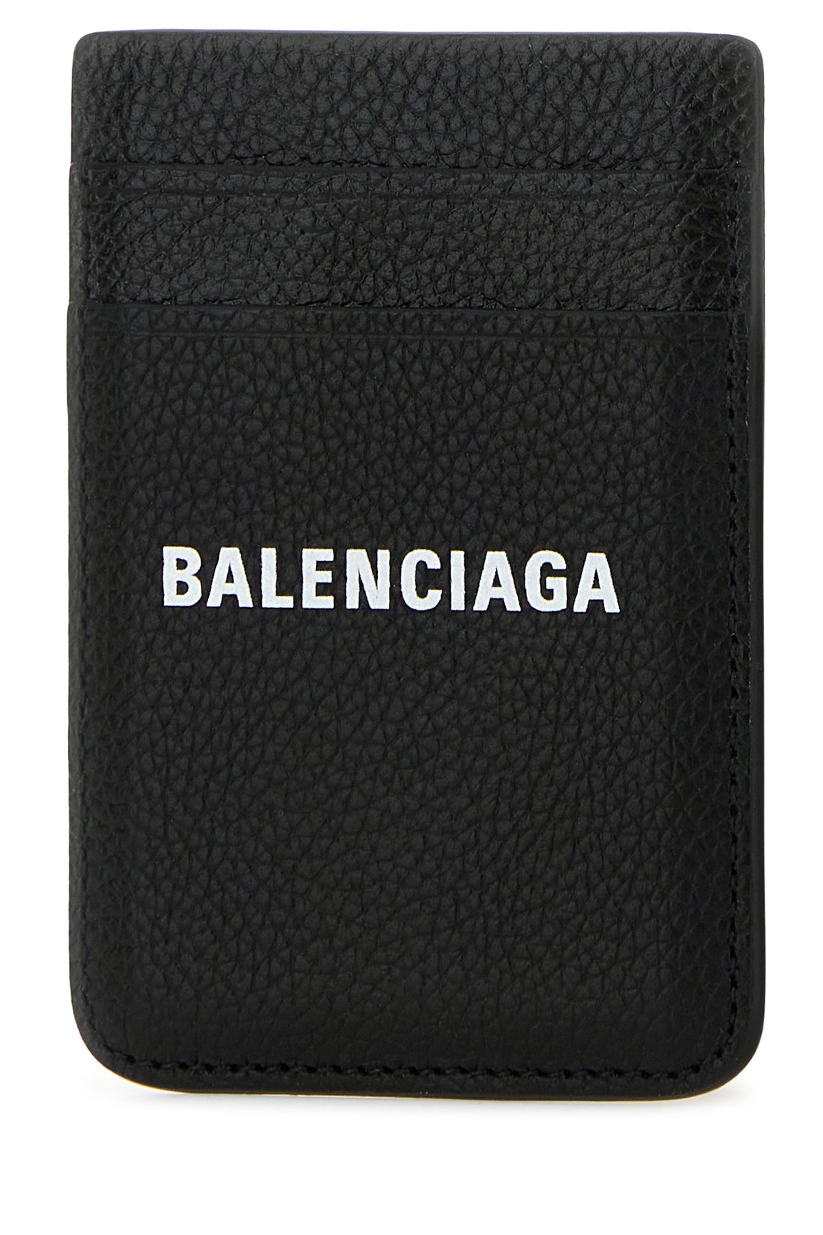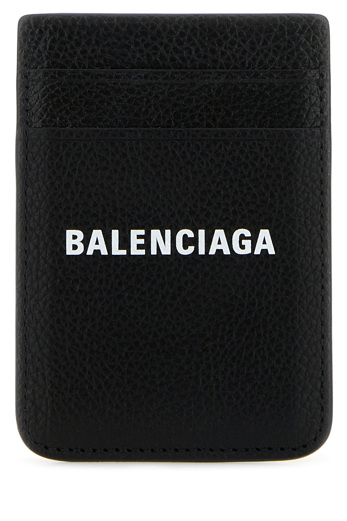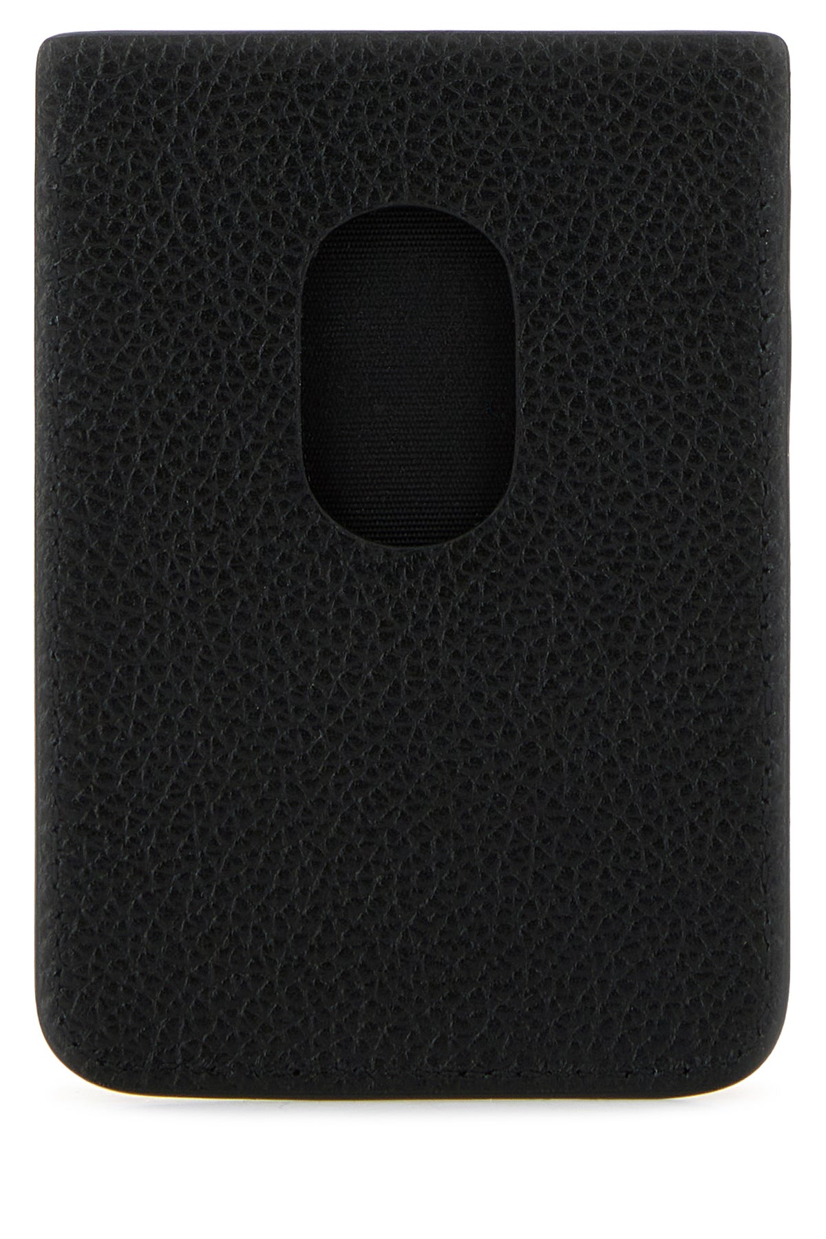 Magnetic card holder realized in pebble clad leather characterized by contrasting printed logo at the front.