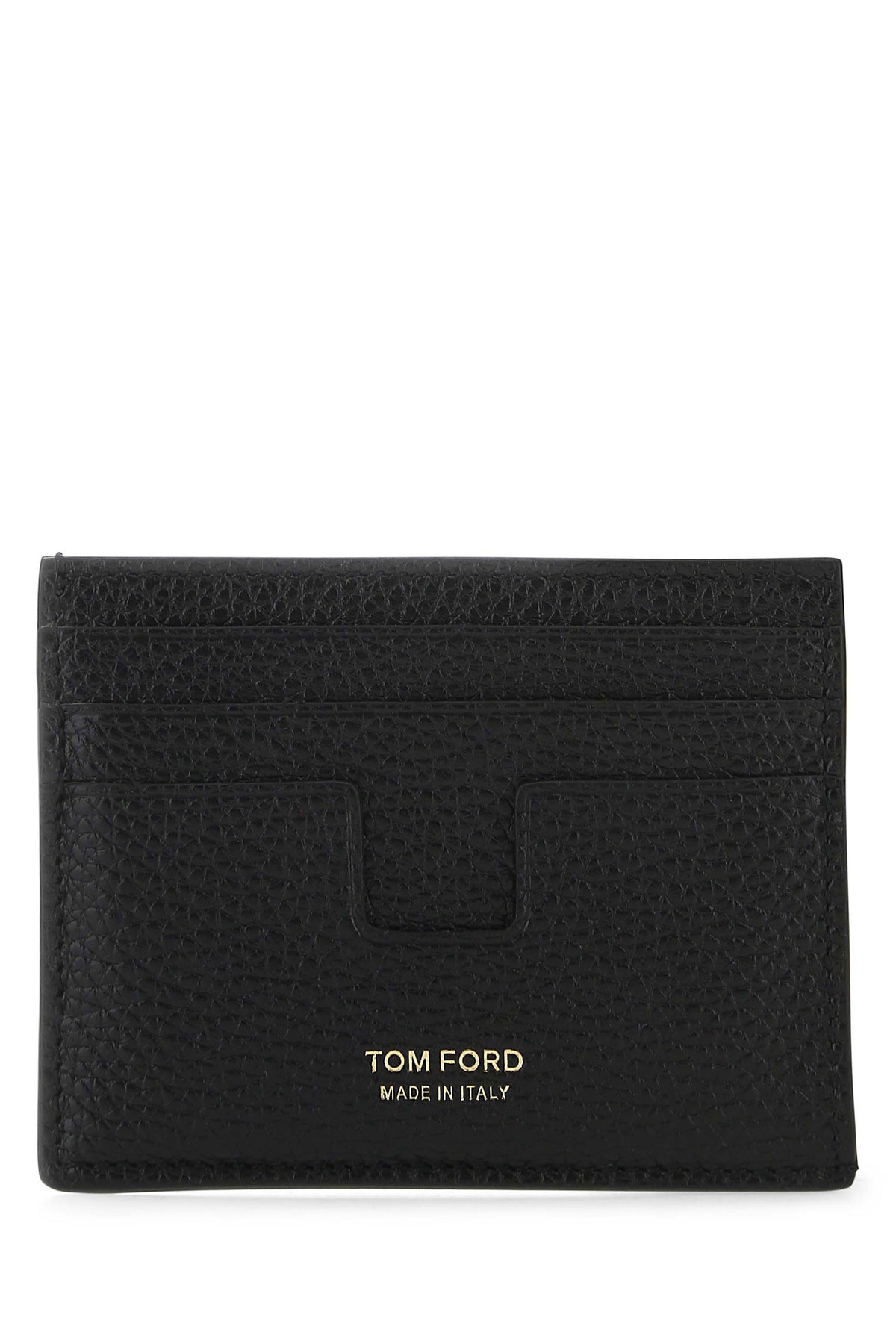 Card holder realized in pebble leather characterized by contrasting printed logo at the front.