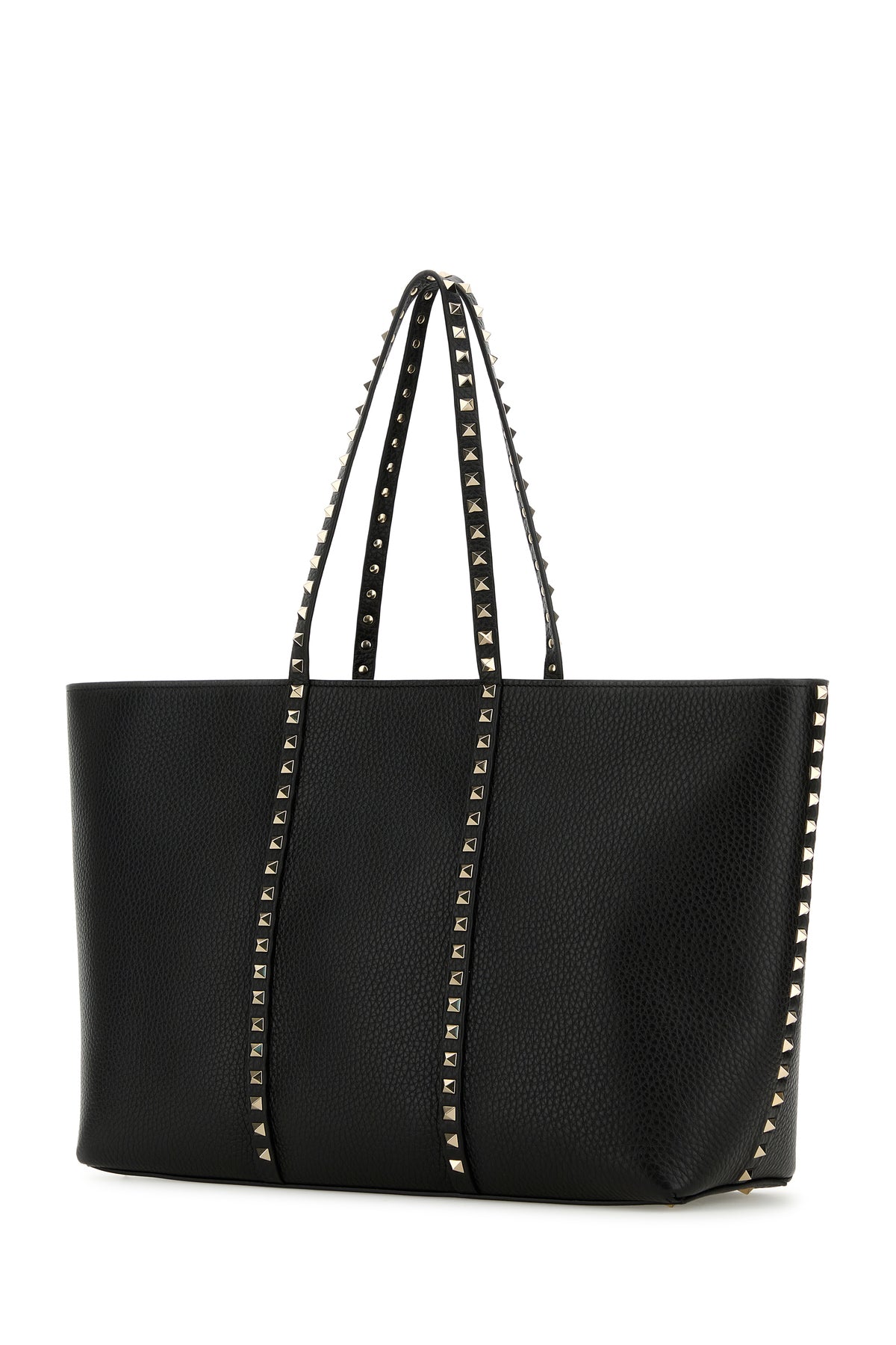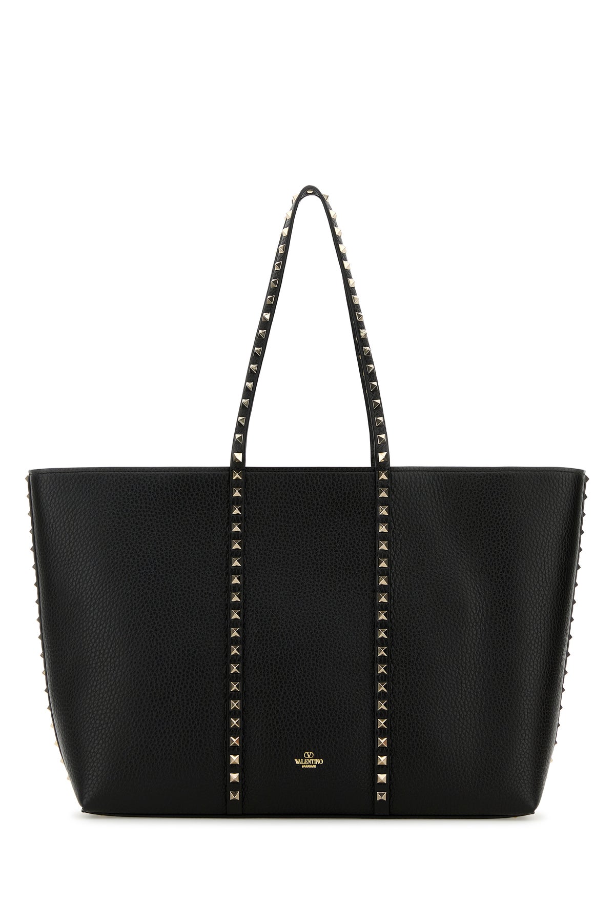 Shopping bag realized in pebble calf leather characterized by laminated printed logo at the back enriched by studs at the front, on the handles, on the sides and at the back.