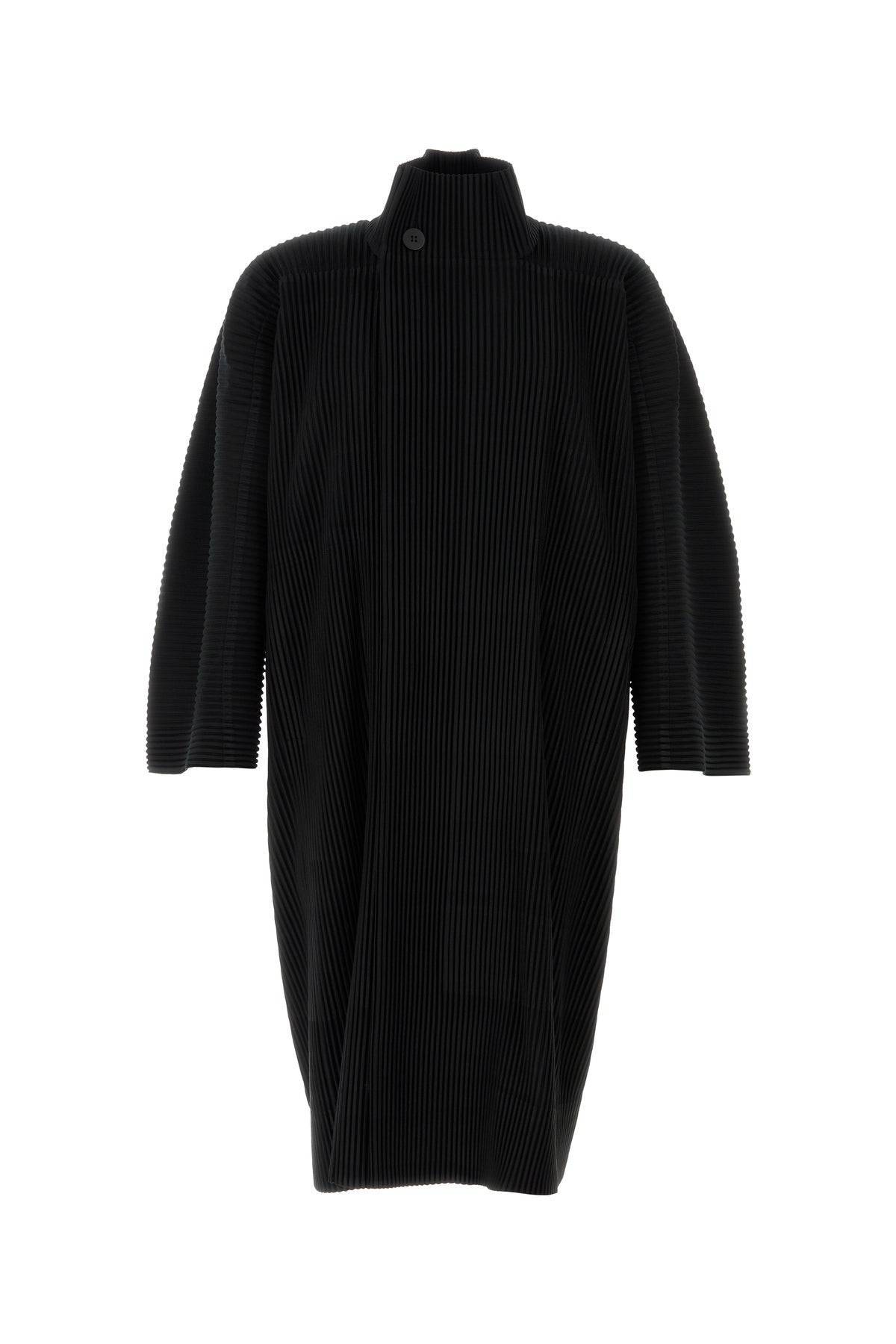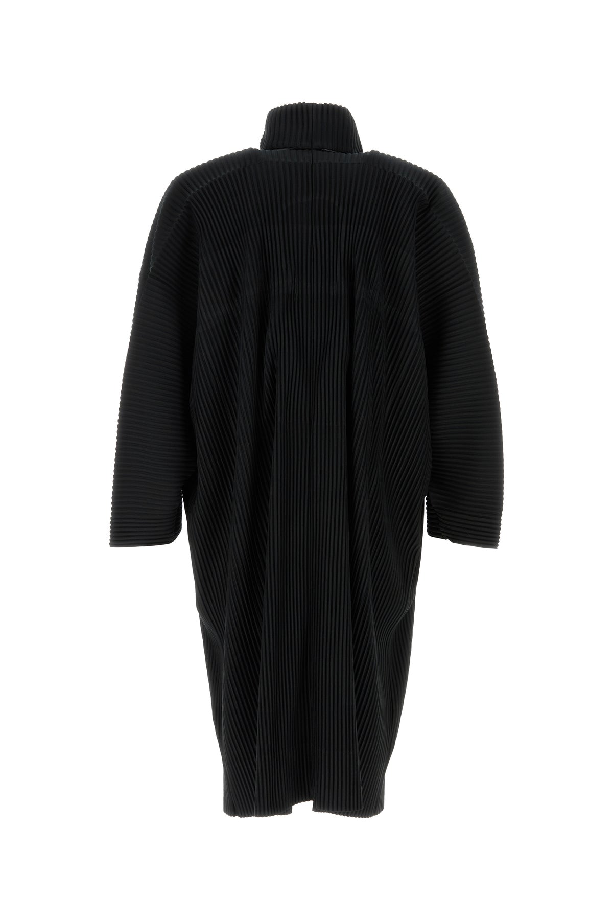 Coat realized in pleated polyester characterized by high collar.