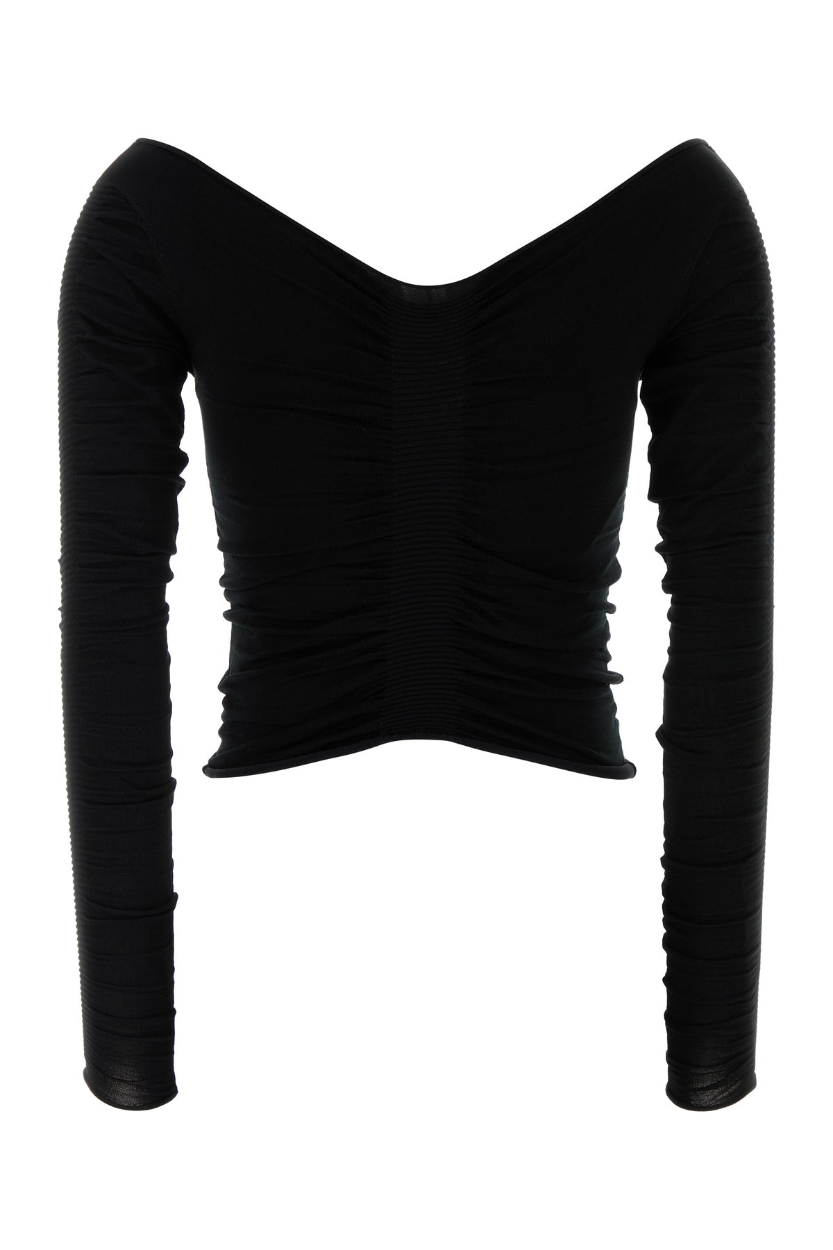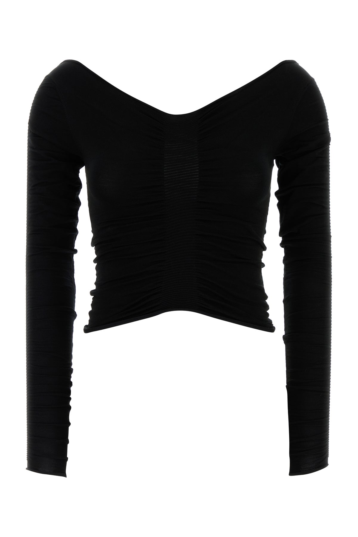 Long-sleeves top realized in stretch cupro blend characterized by peculiar gatherings at the front, on the sleeves and at the back.
