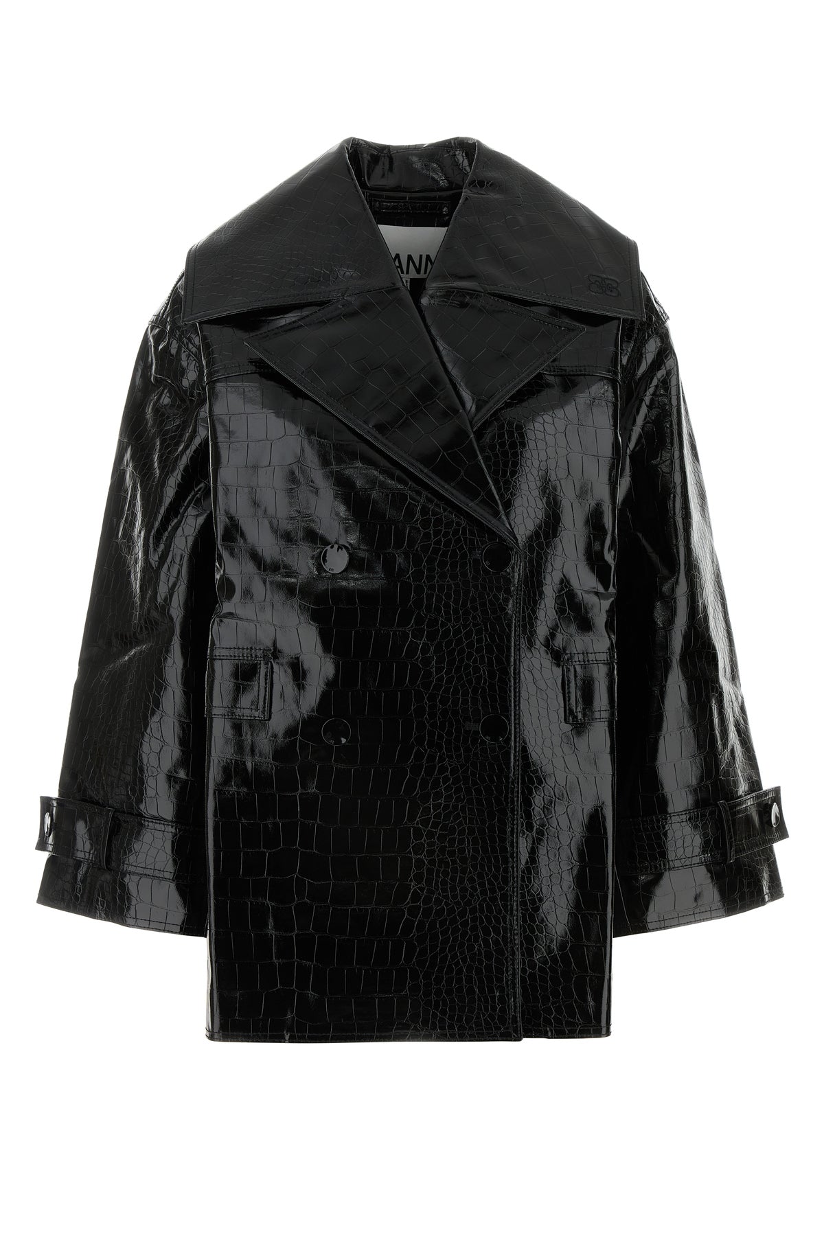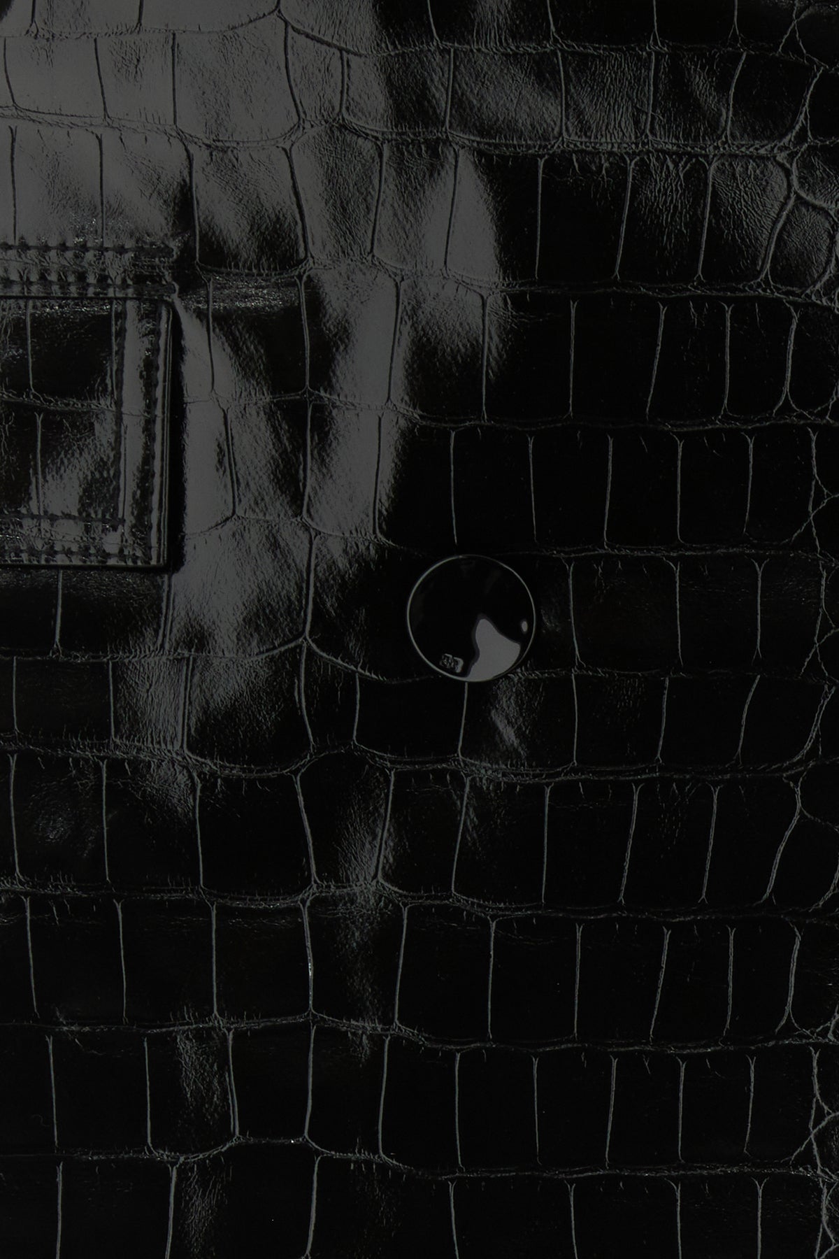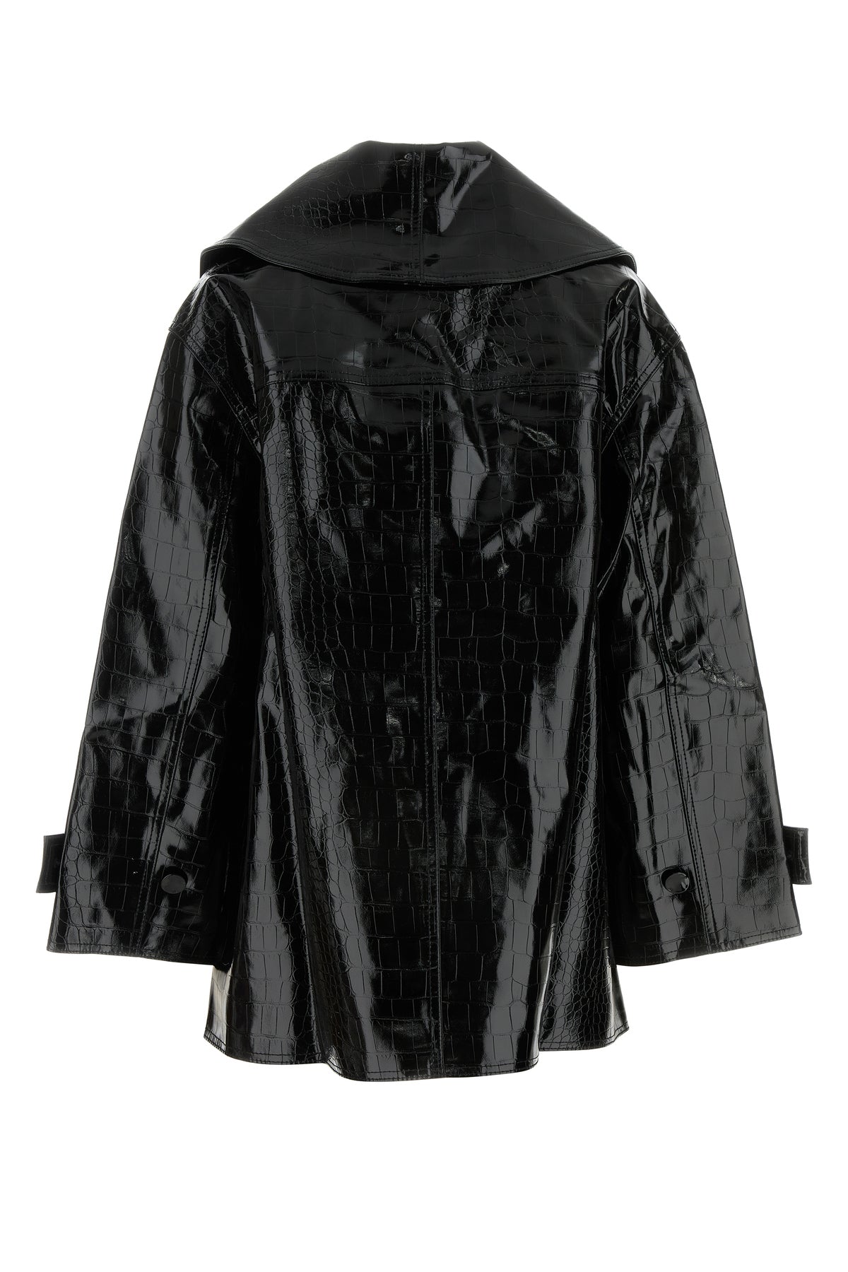 Coat realized in crocodile embossed motif polished-finish synthetic leather characterized by lapels.