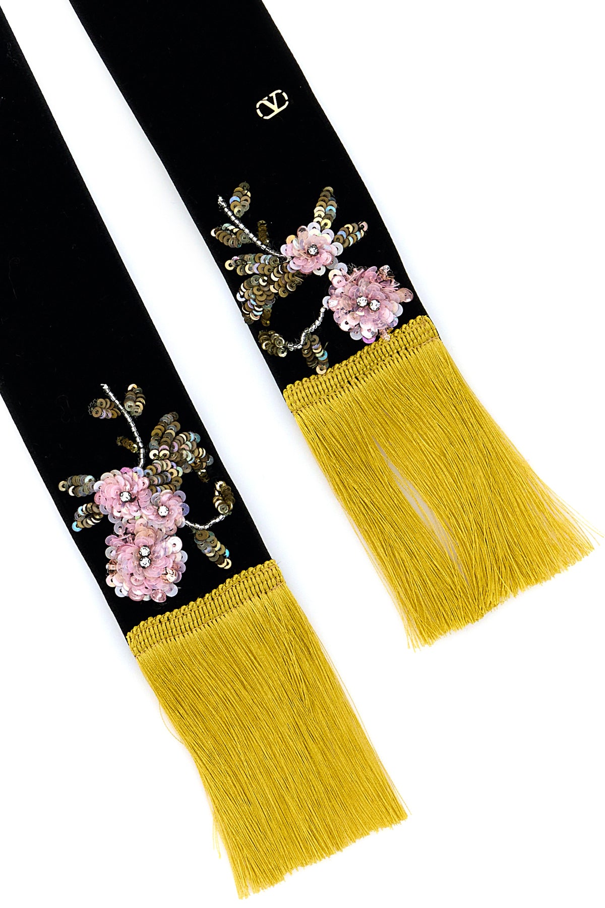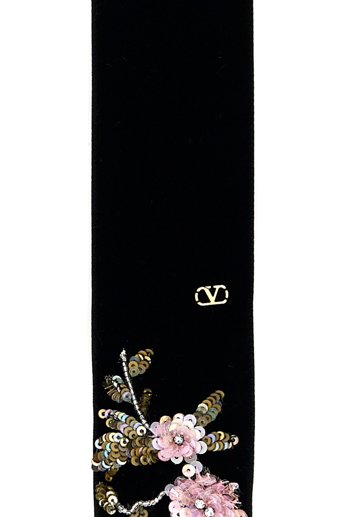 Scarf realized in velvet characterized by floral embroideries with sequins at the front enriched by metal VLogo detail at the front.