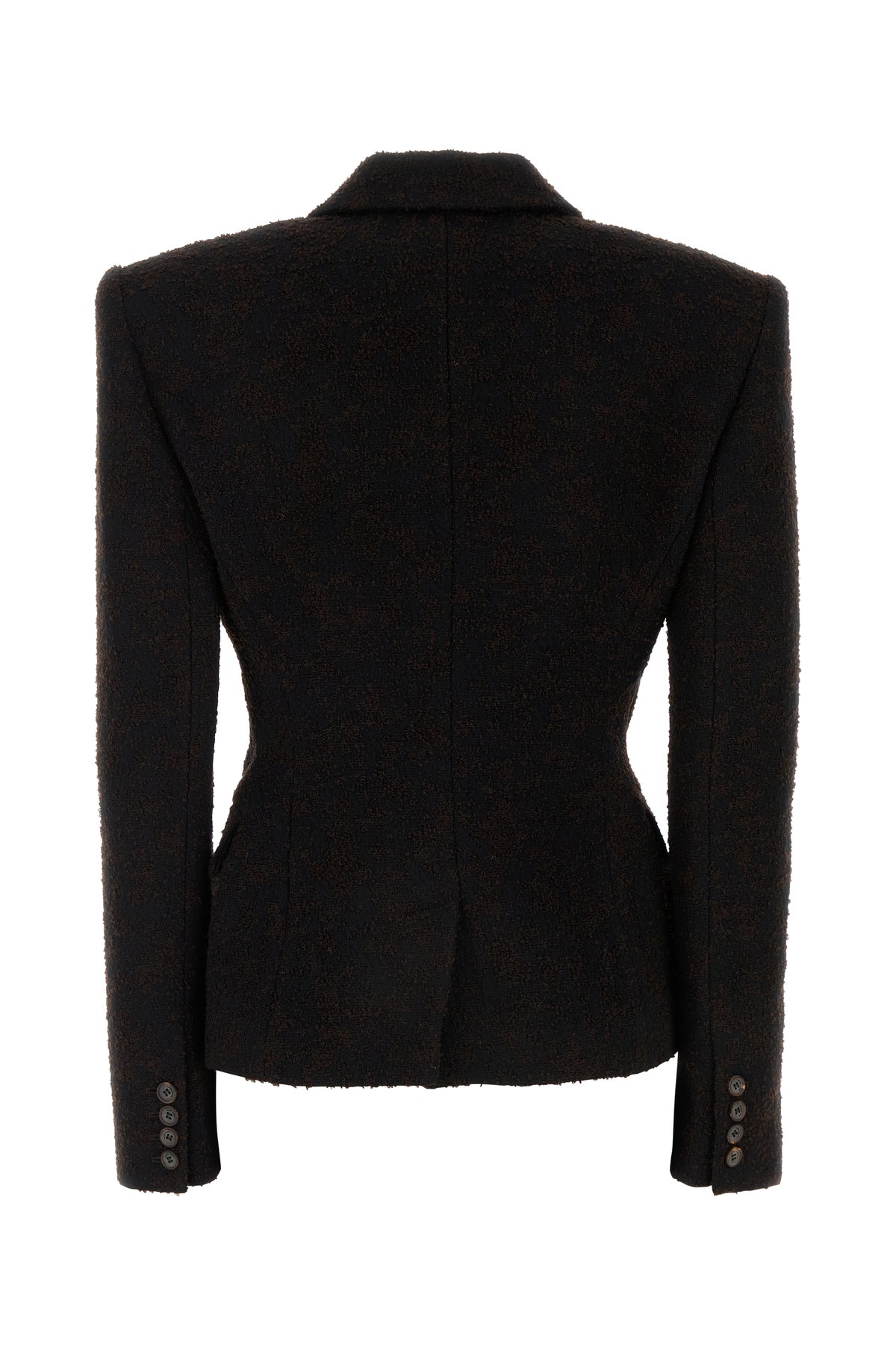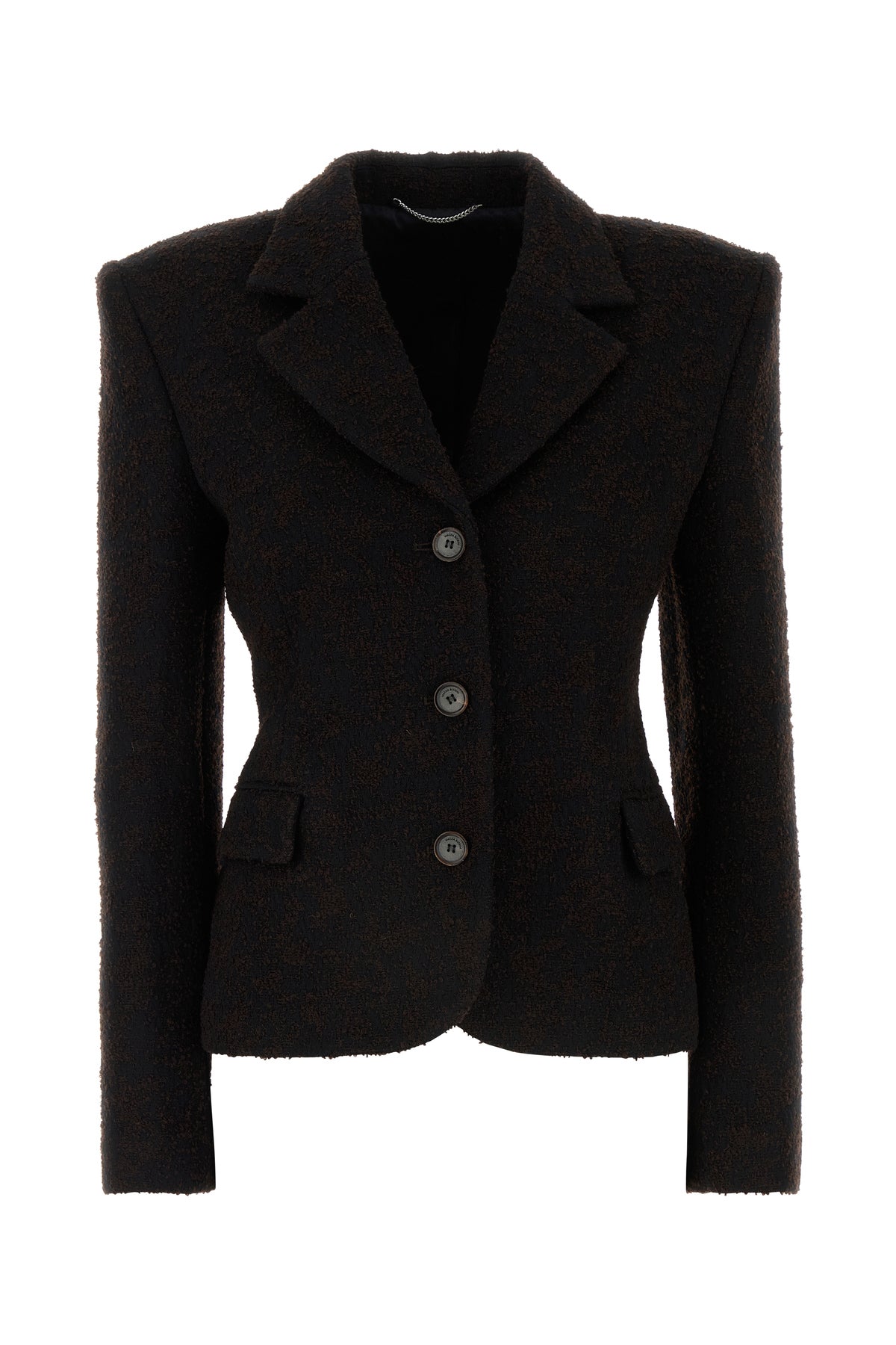 Blazer realized in boucle characterized by padded shoulders.