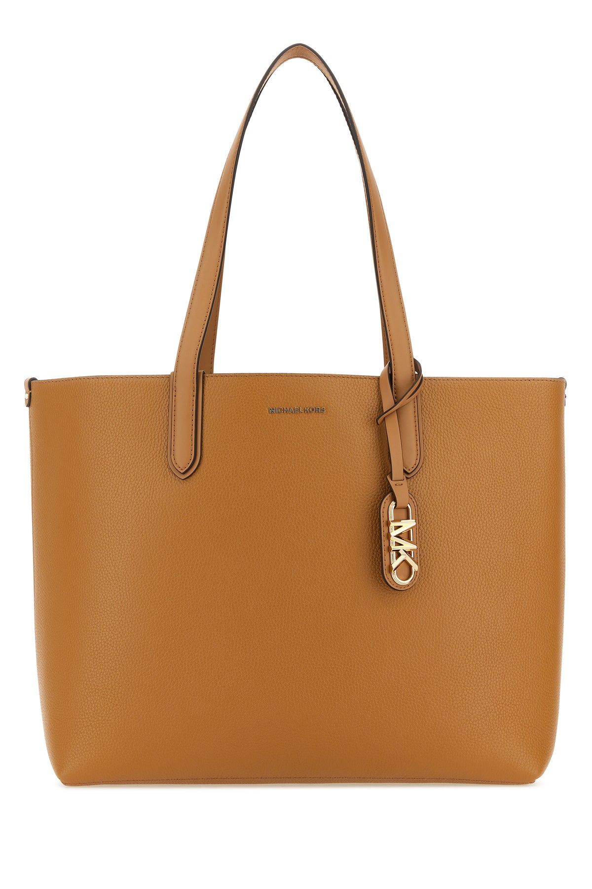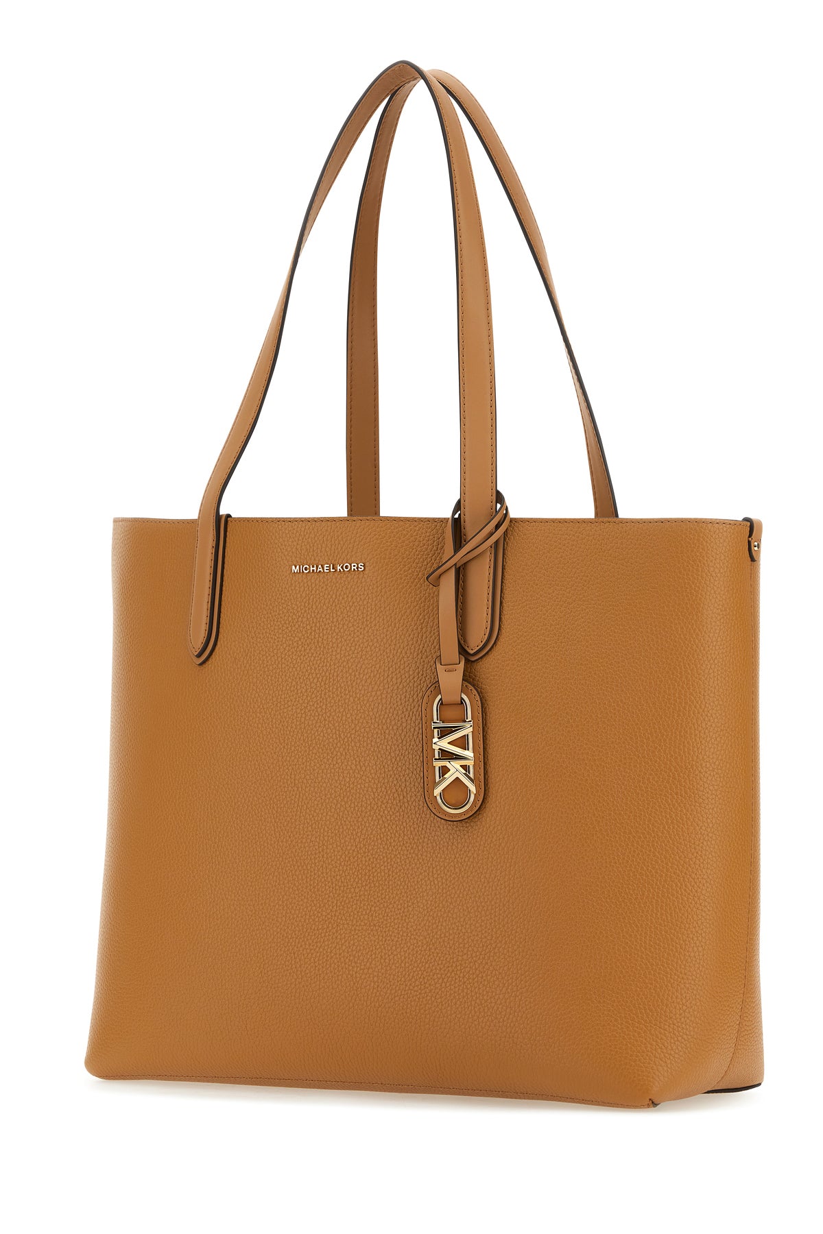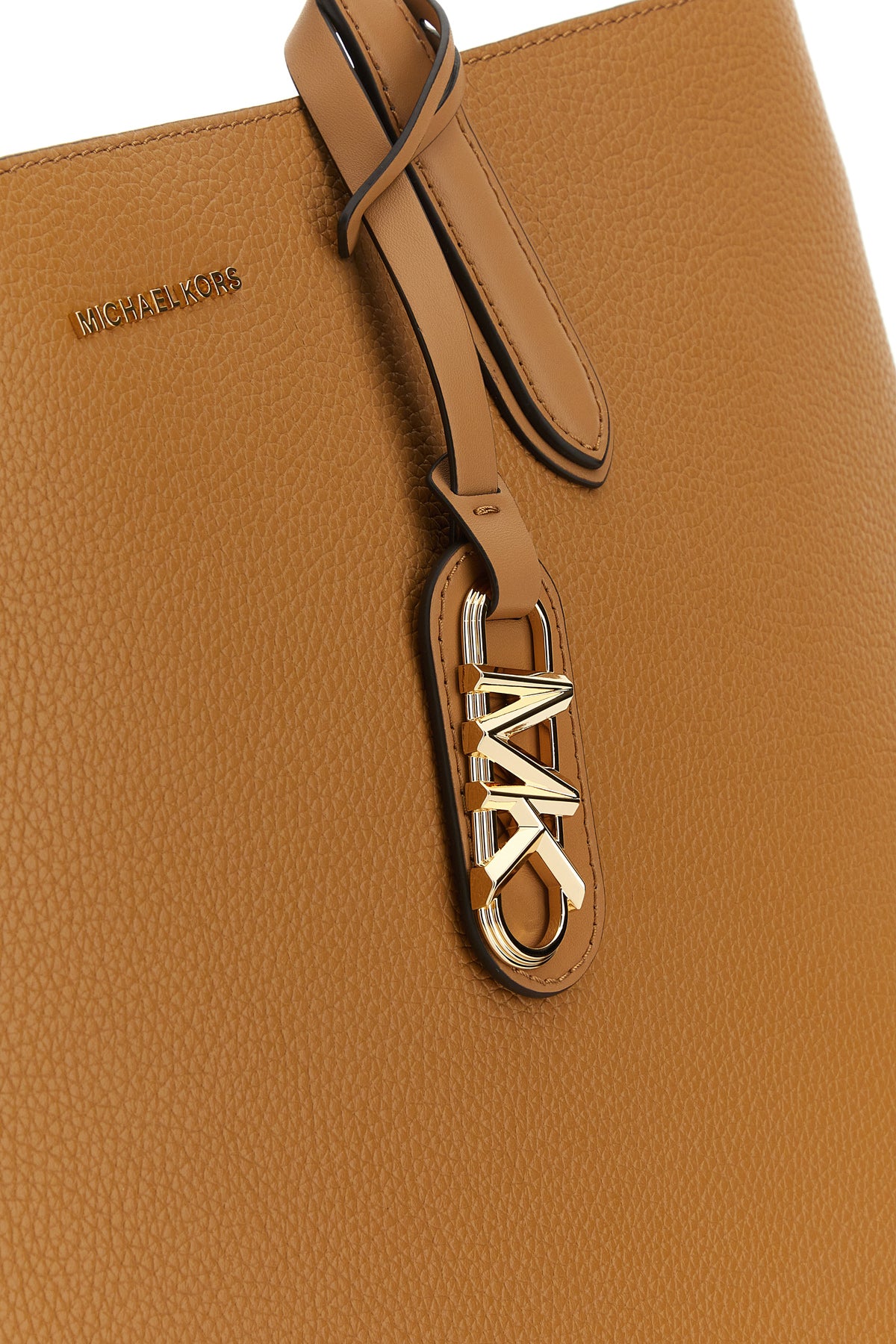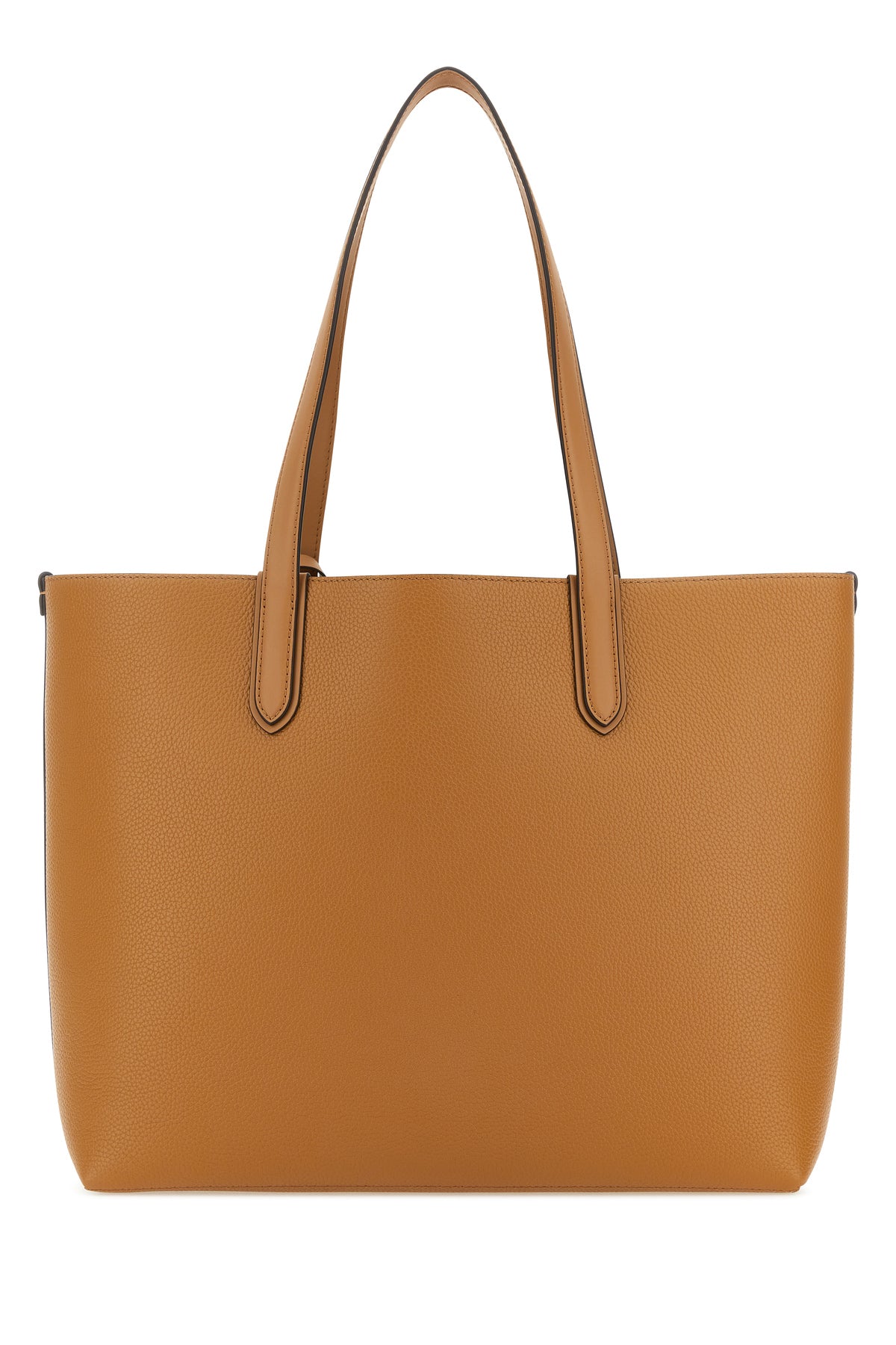 Shopping bag realized in pebble leather enriched by metal lettering logo at the front and detachable logoed accessory.