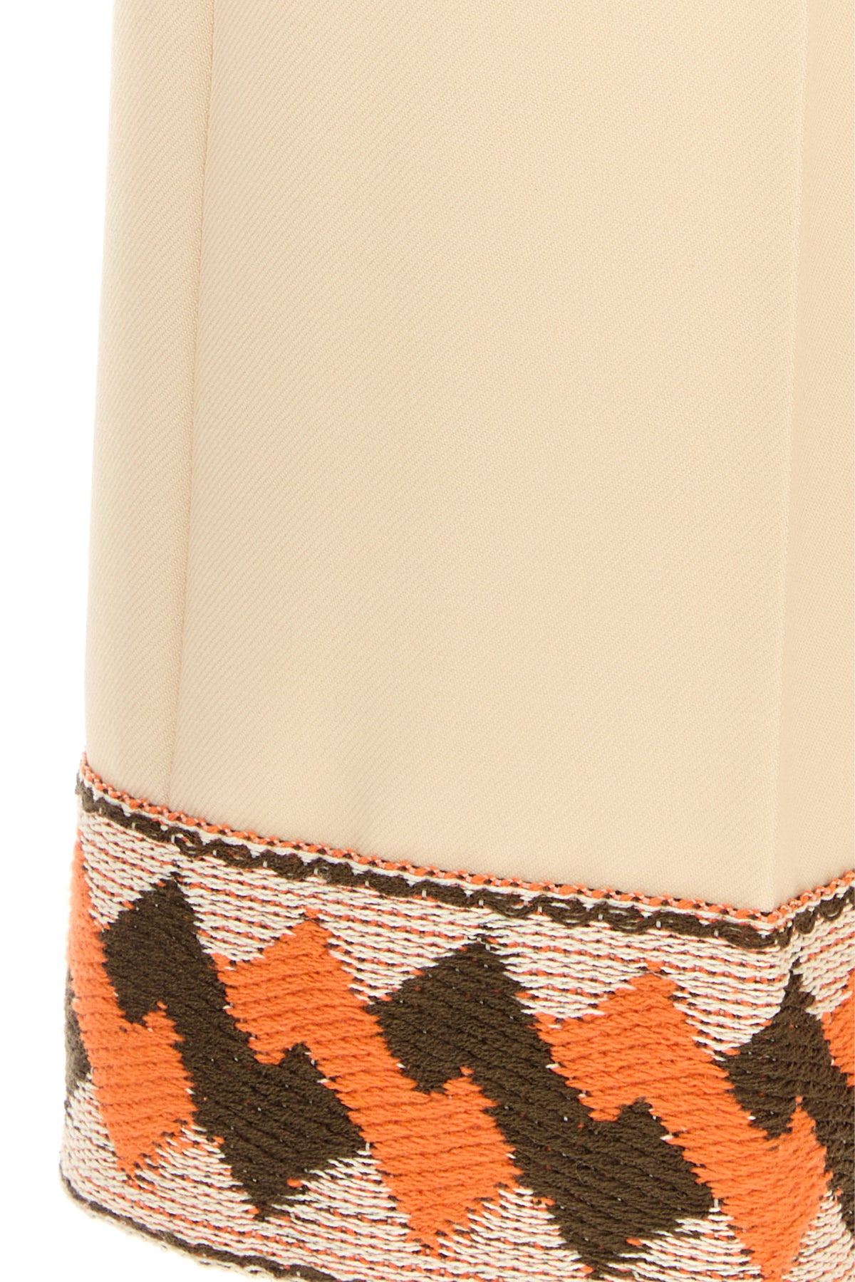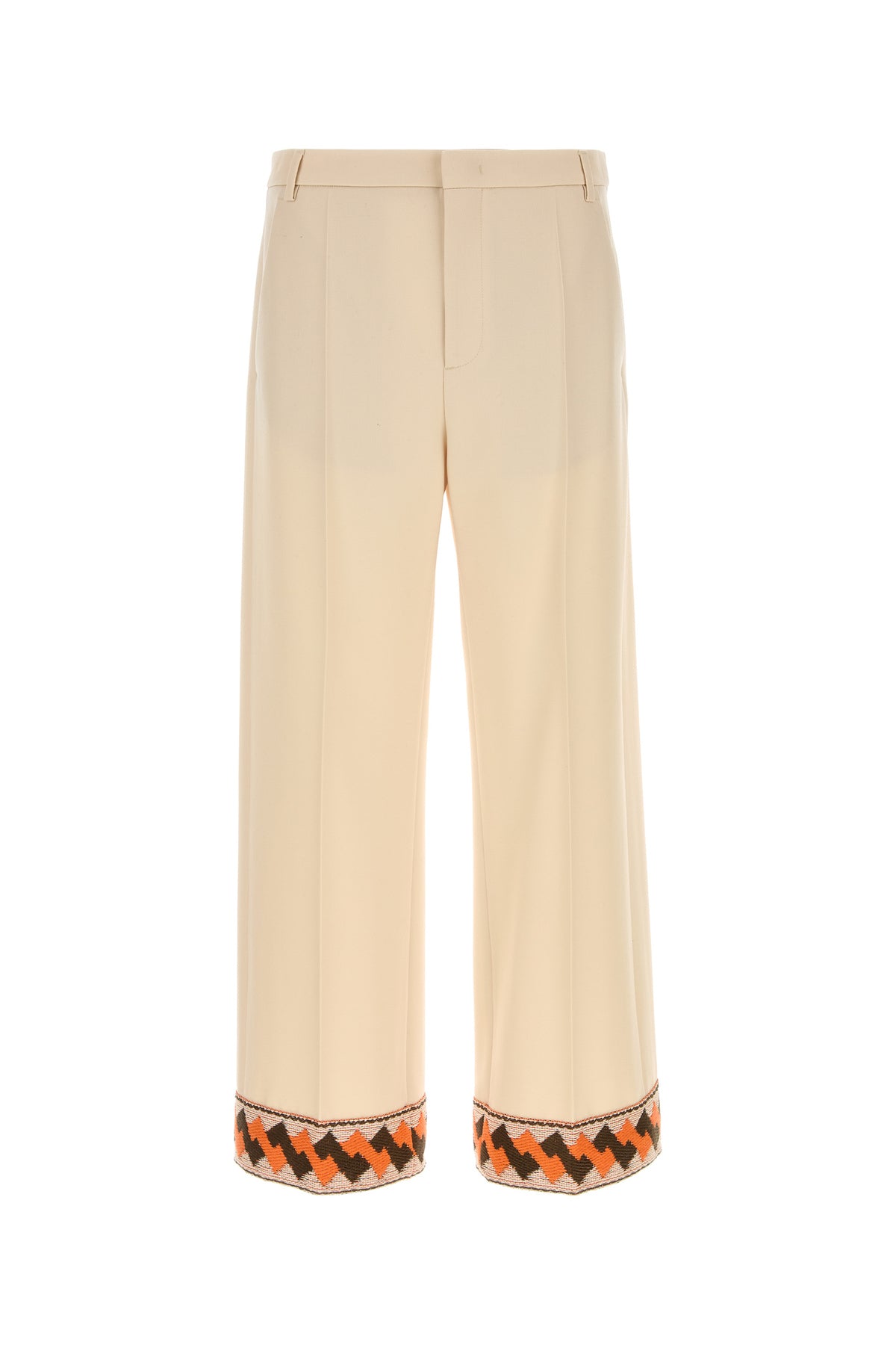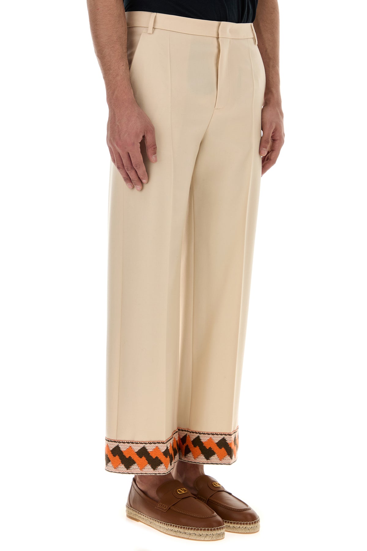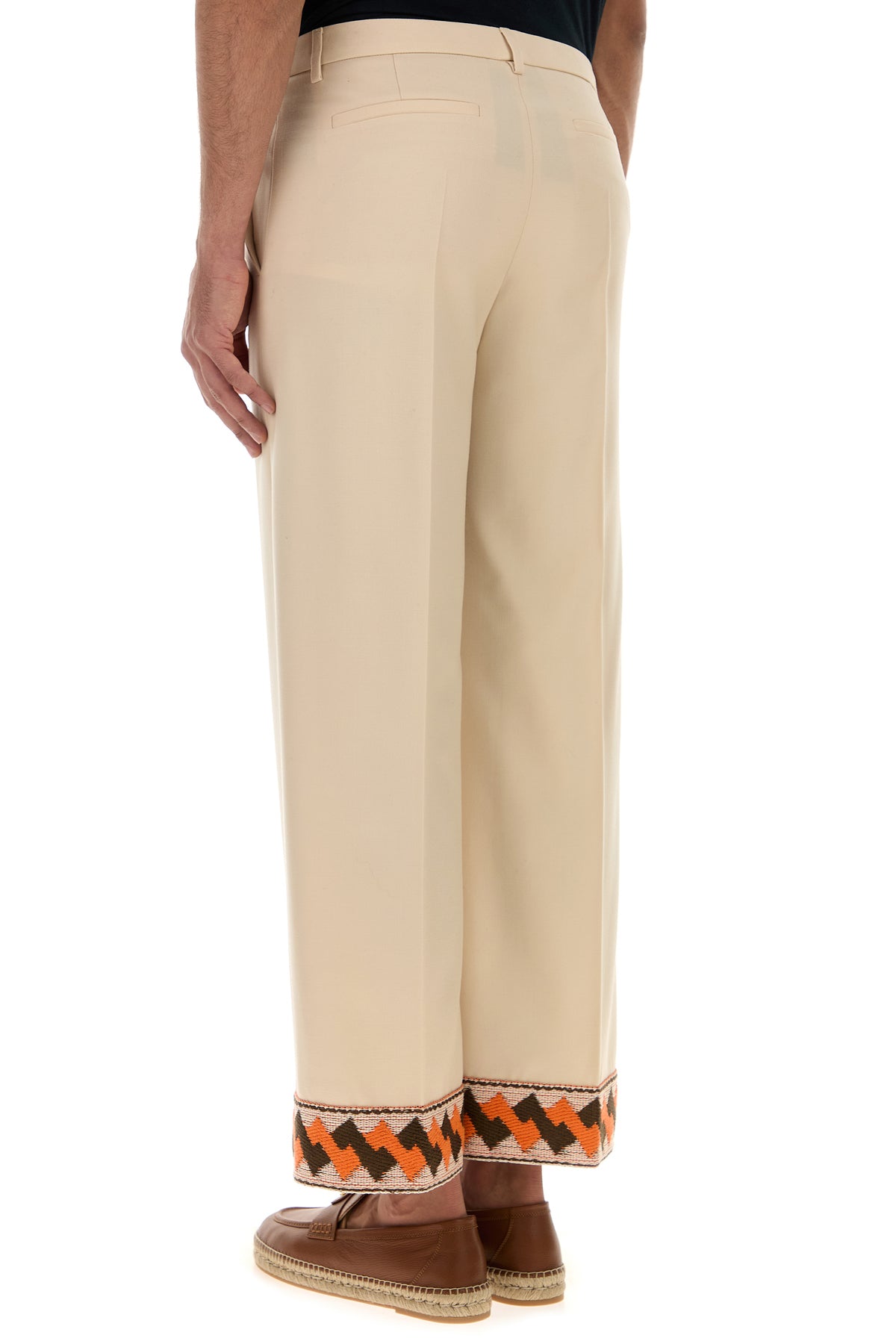 Pant realized in pure virgin wool characterized by peculiar embroidery on the hemline.