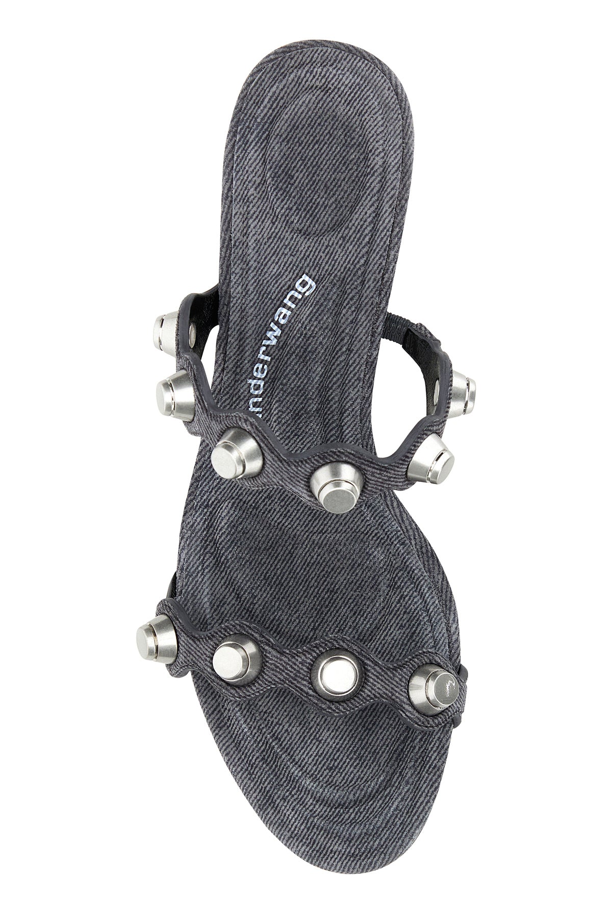 Mules realized in denim-effect leather enriched by metal studs on the instep.