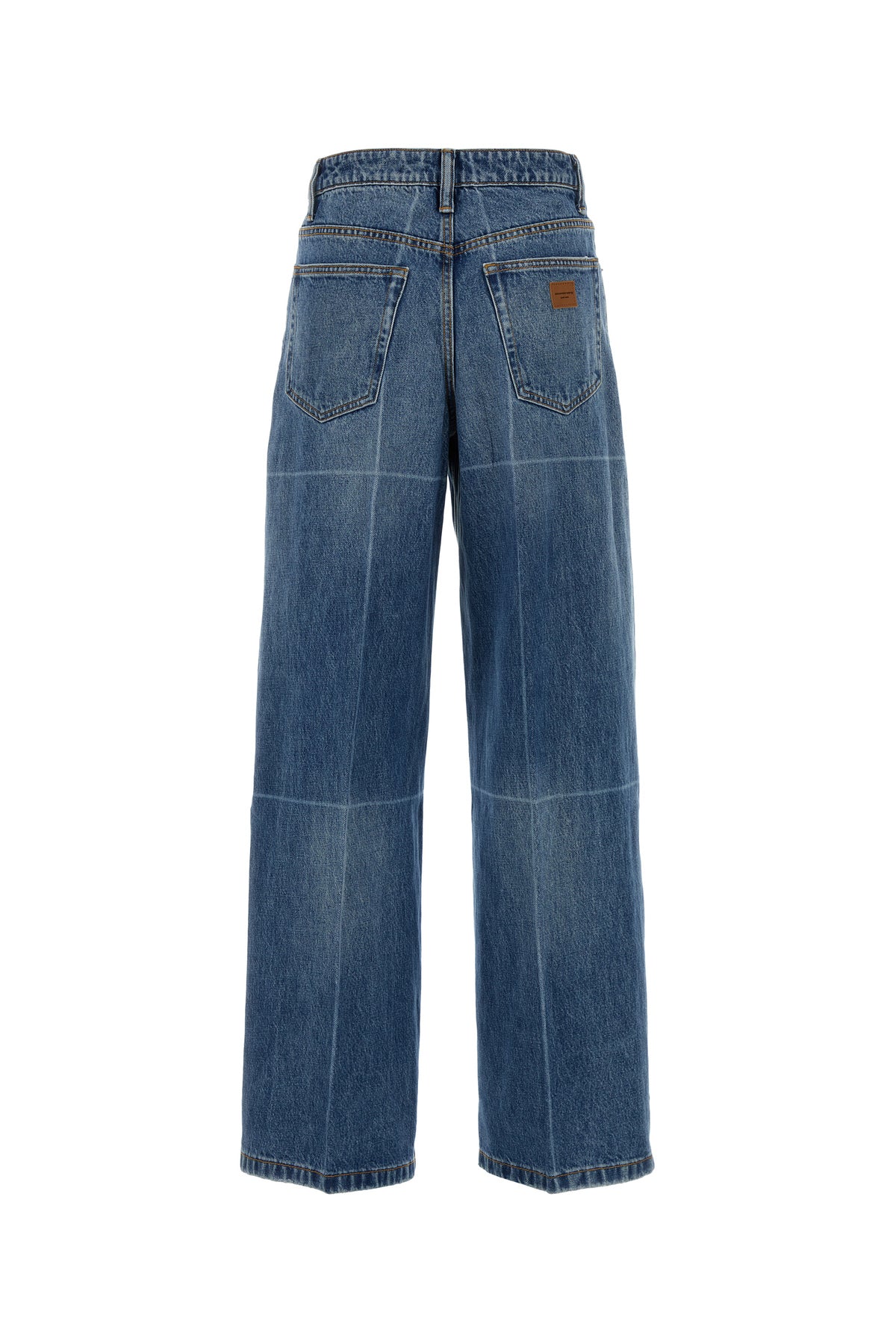 Wide-leg jeans realized in stonewashed pure cotton denim enriched by logoed label at the back.