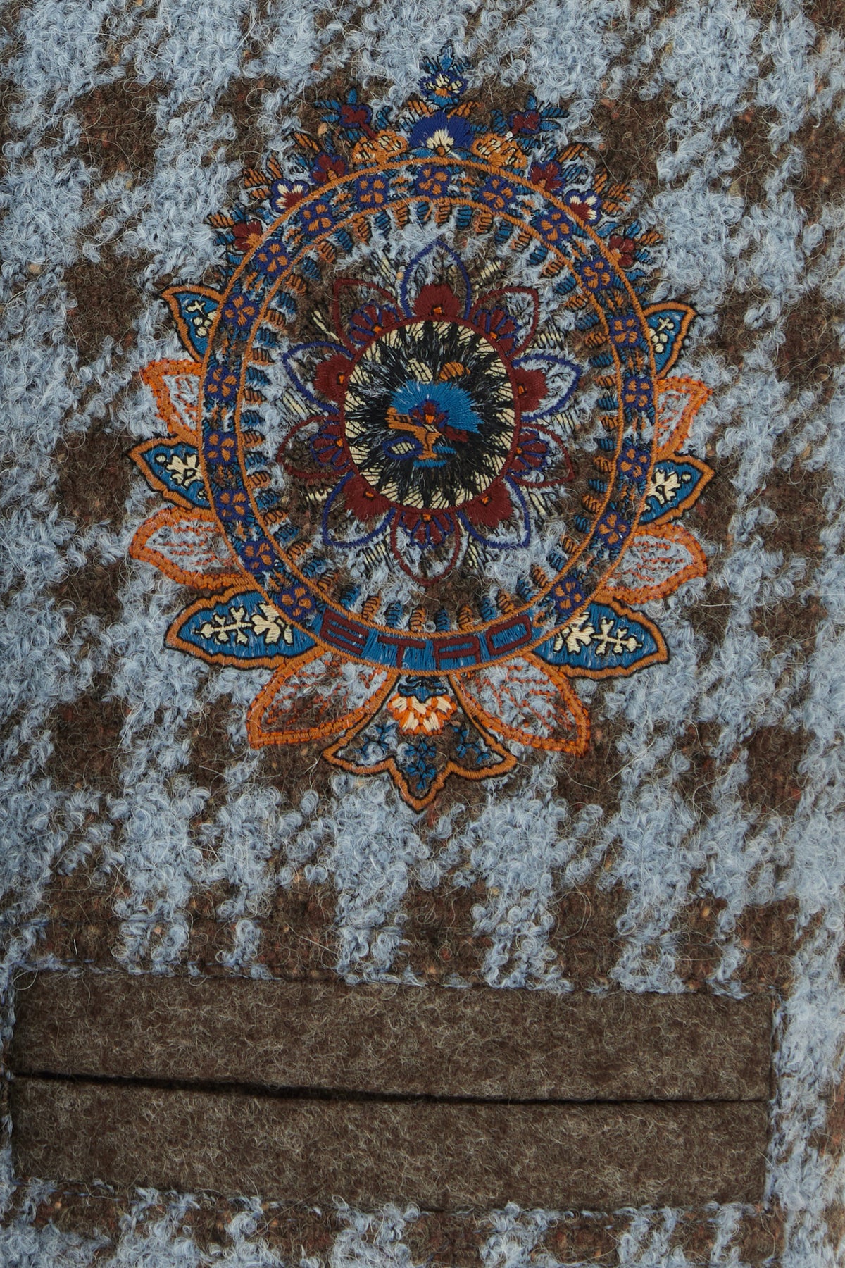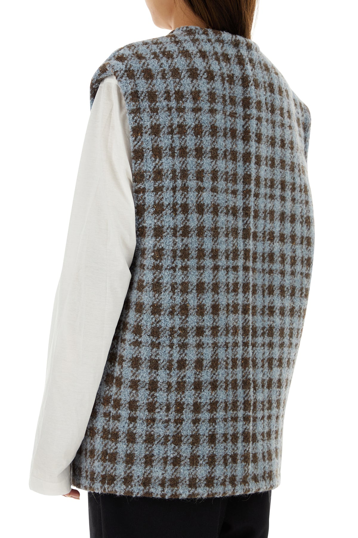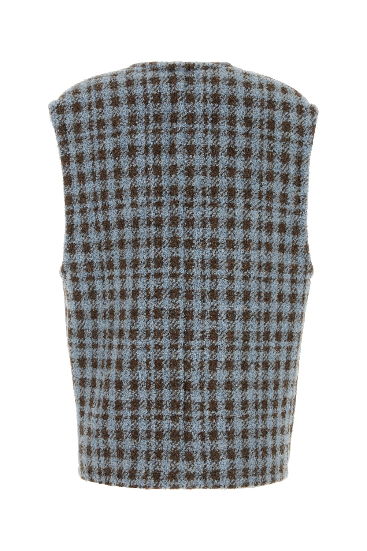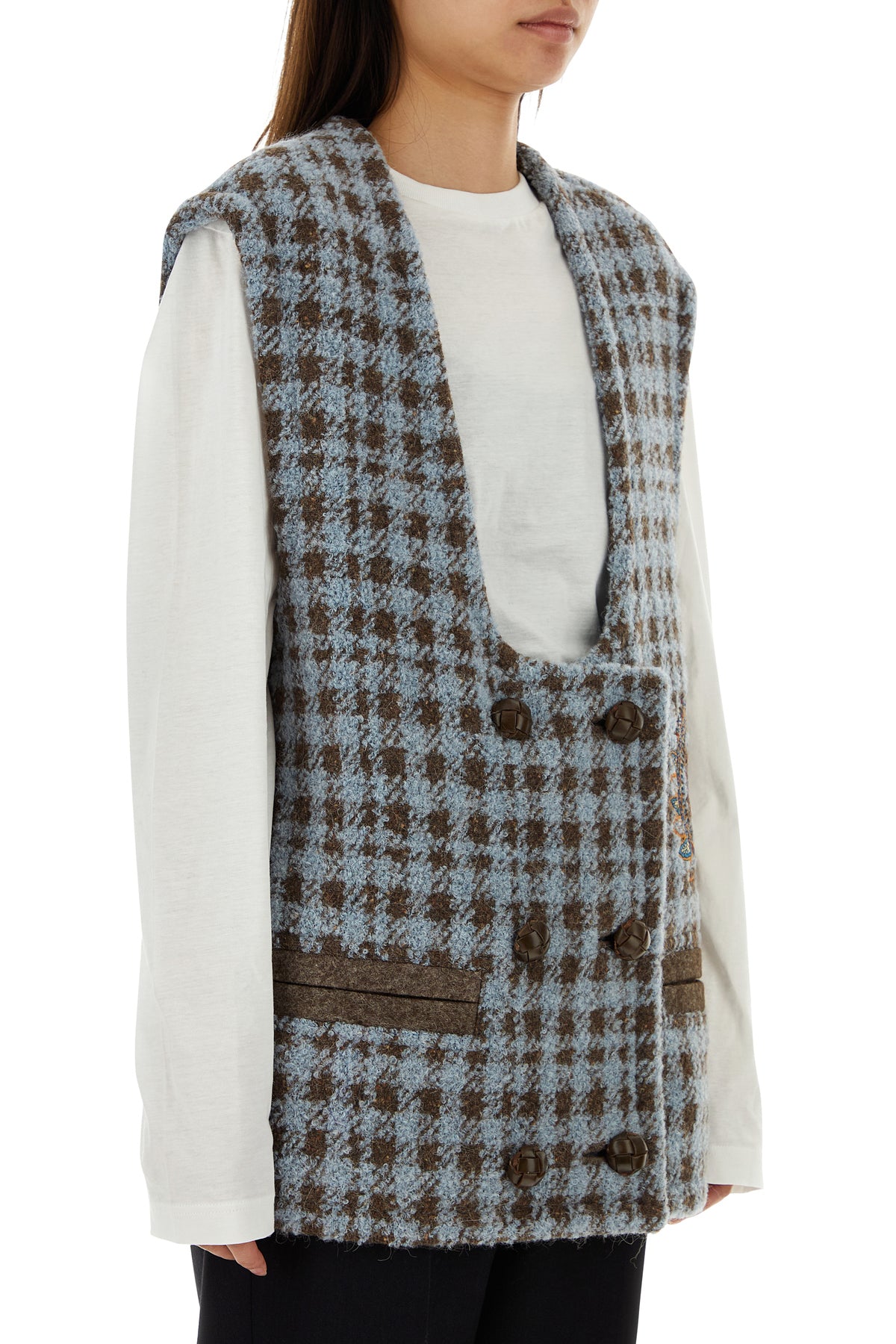 Vest realized in blend virgin wool characterized by pied de poule embroidery on the entire surface enriched by peculiar embroidery at the front.