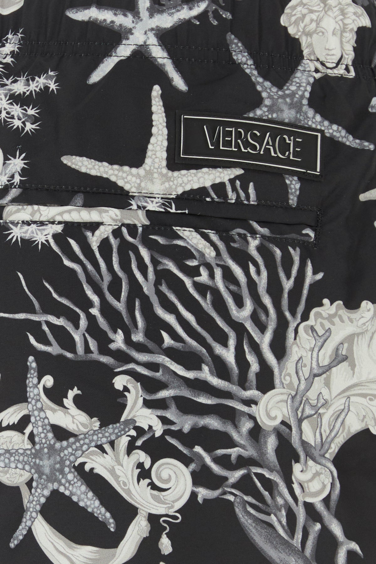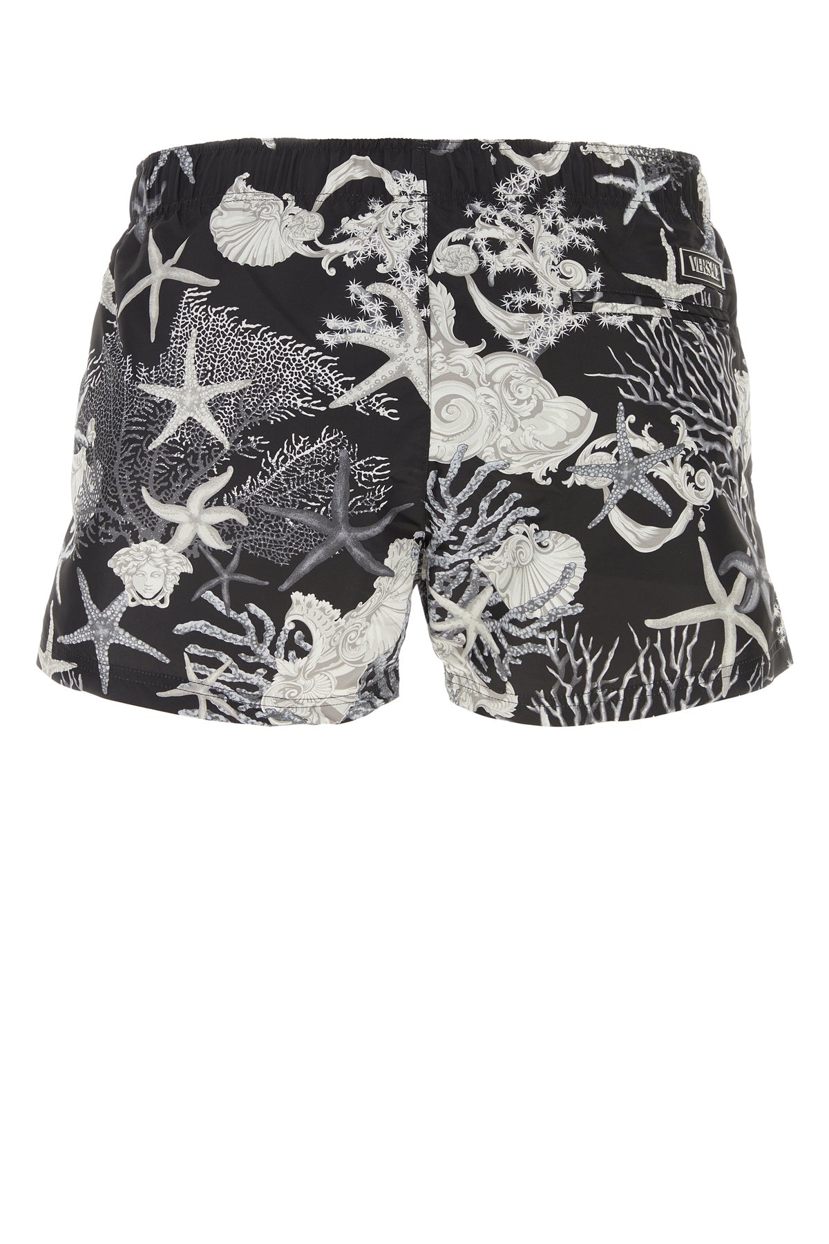 Swimming shorts realized in polyester characterized by Barocco Sea print on the entire surface enriched by logoed rubber patch at the back.