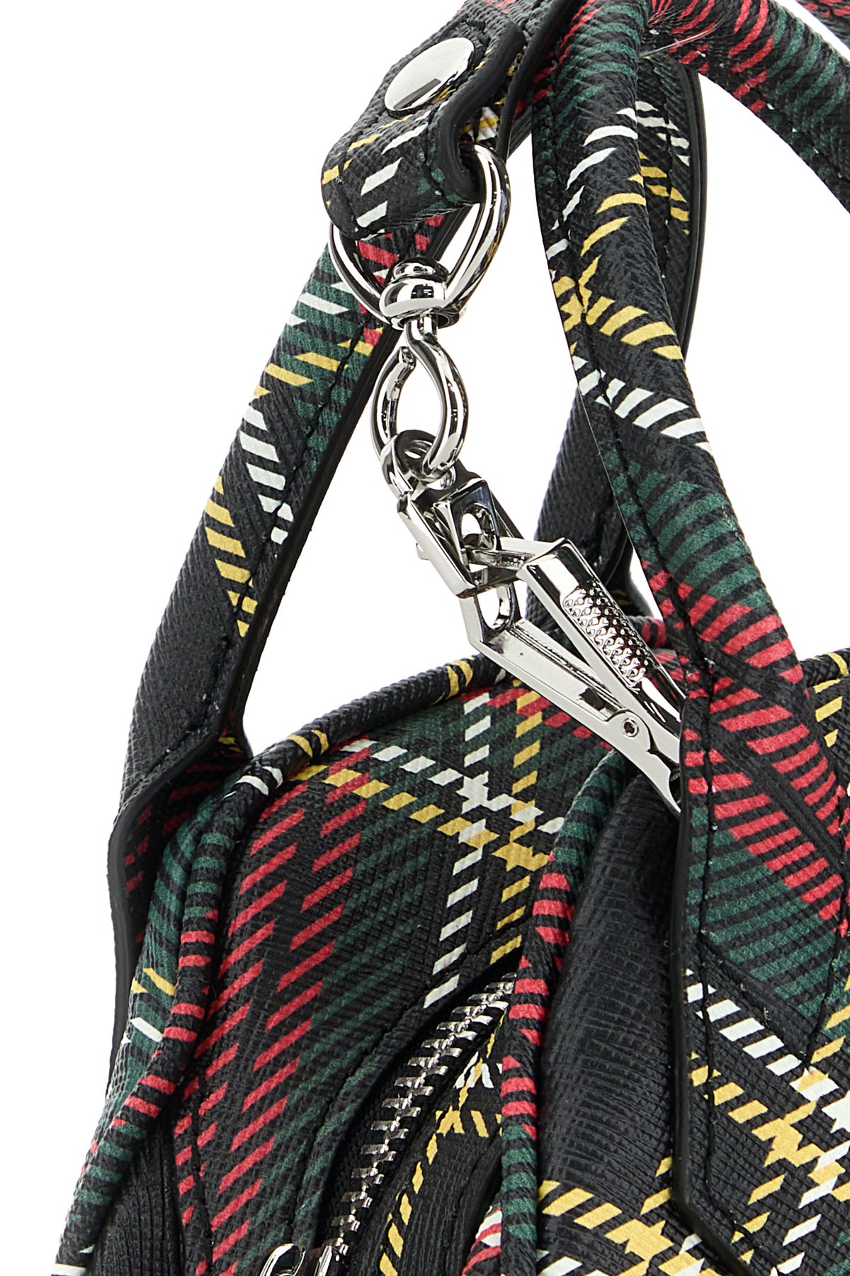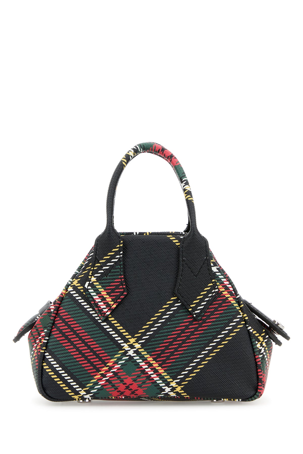 Handbag realized in grained synthetic leather characterized by tartan motif print on the entire surface enriched by metal Orb detail at the front.