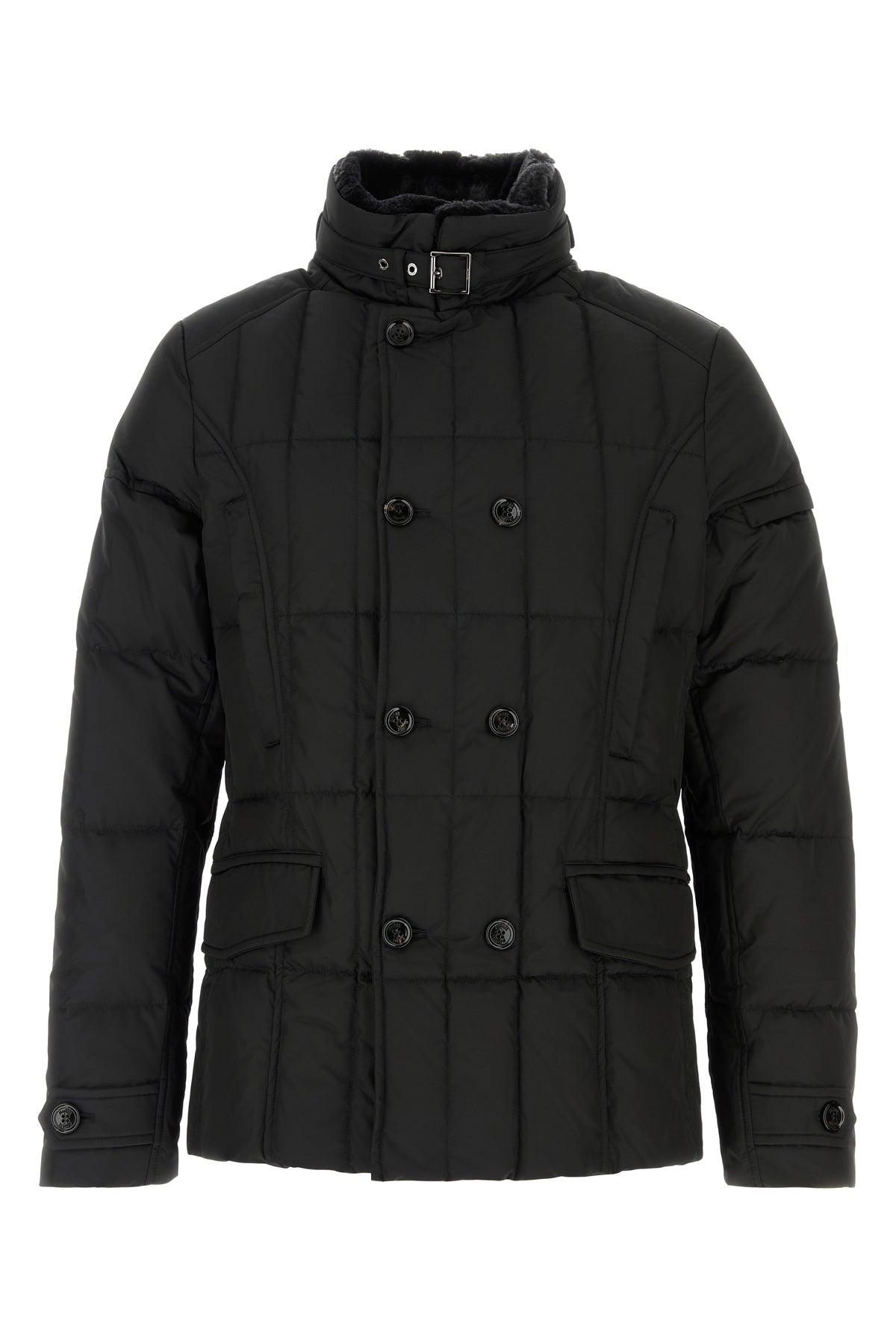 Down jacket realized in quilted polyester characterized by high collar with strap.