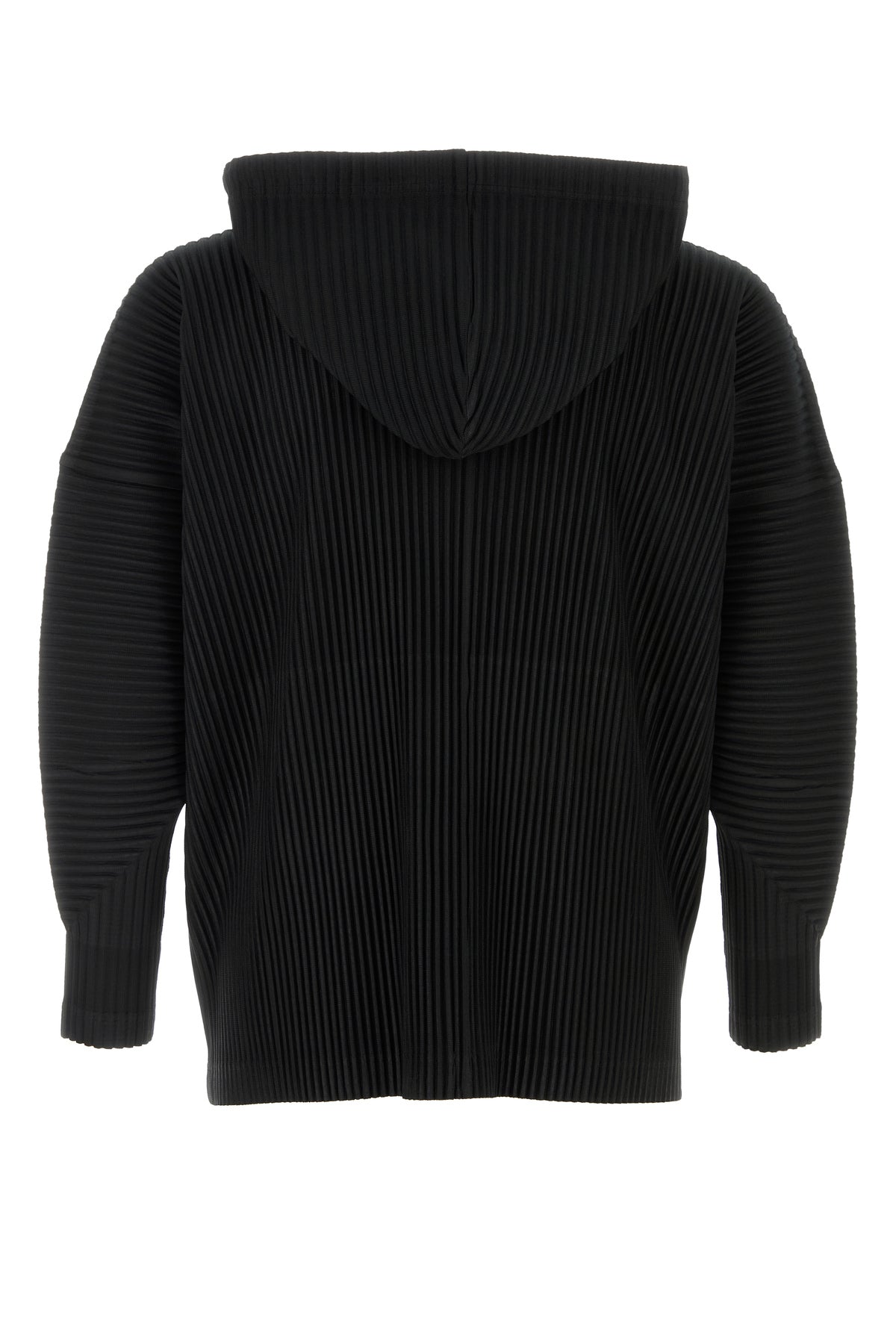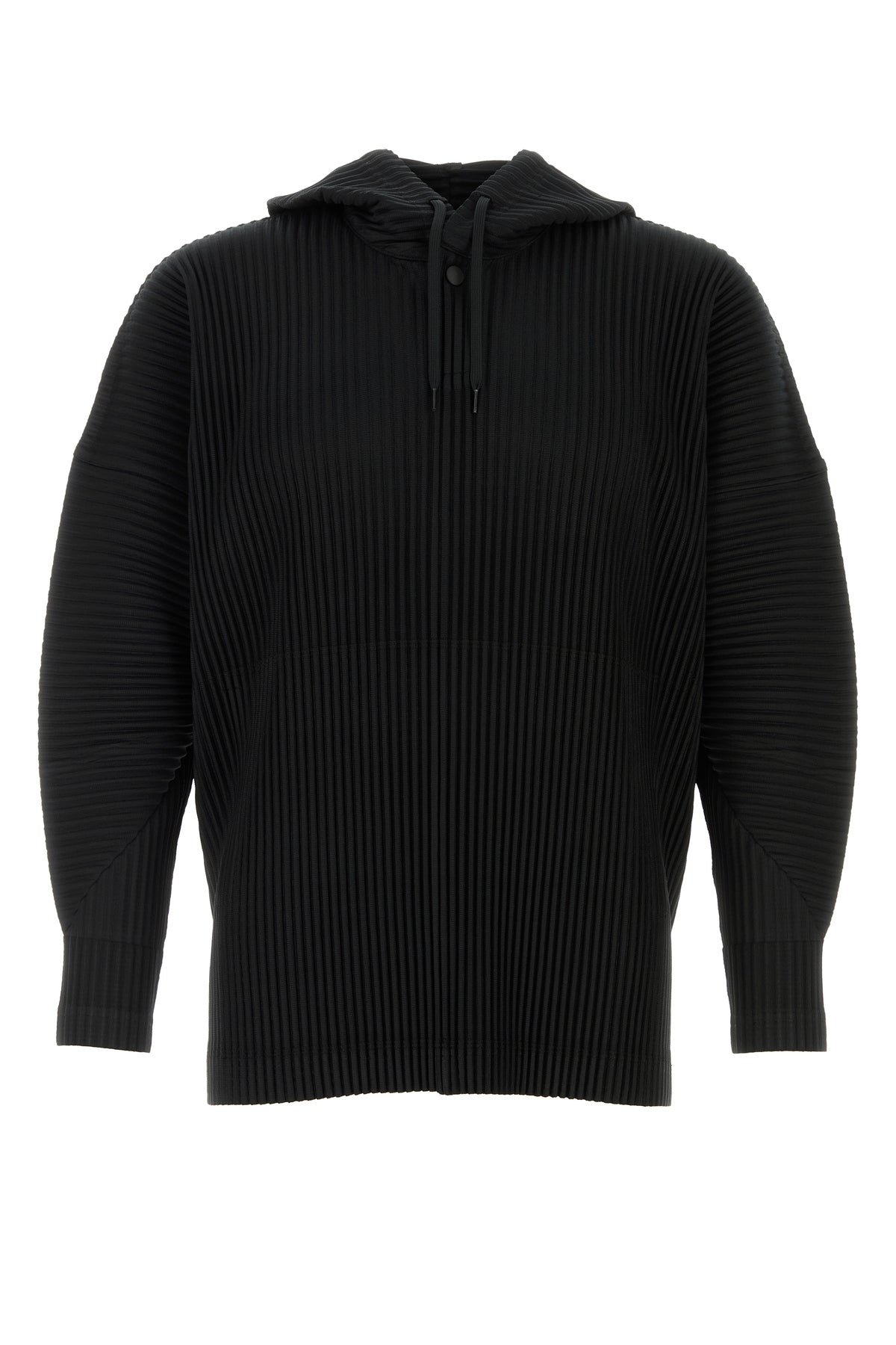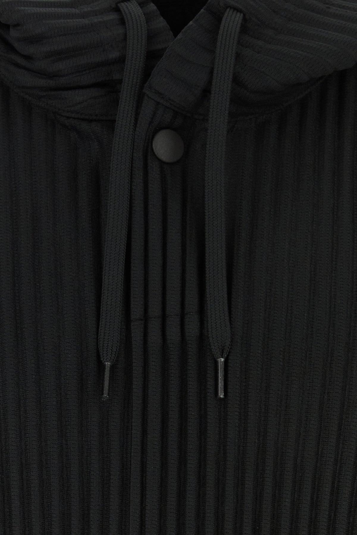 Sweatshirt realized in pleated polyester characterized by drawstring hood.