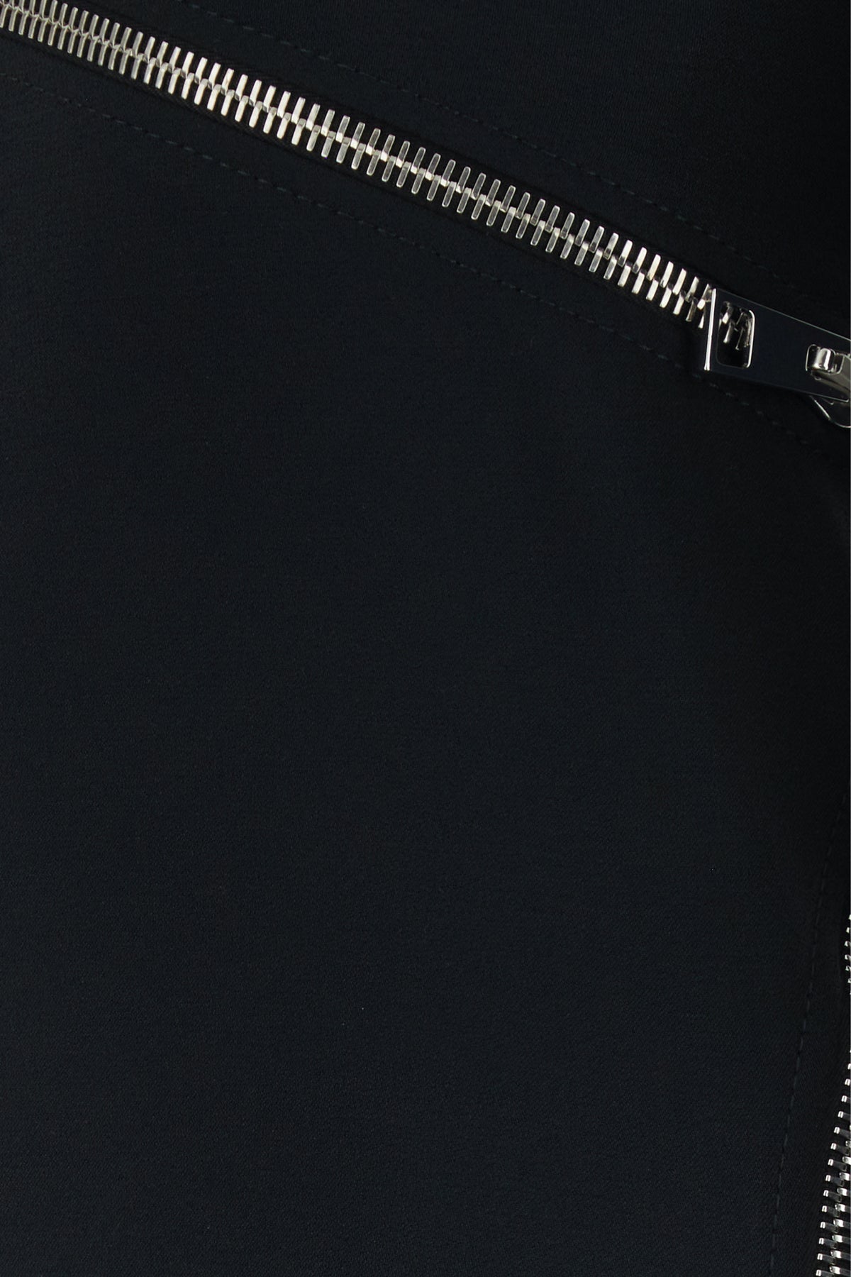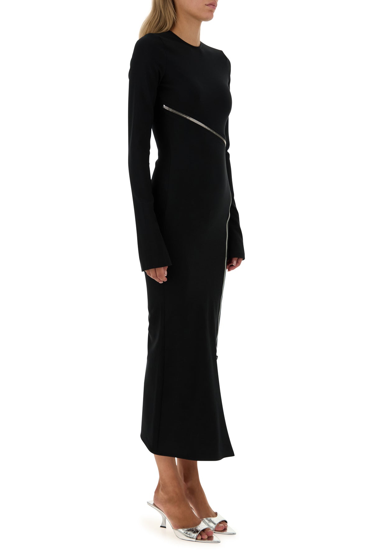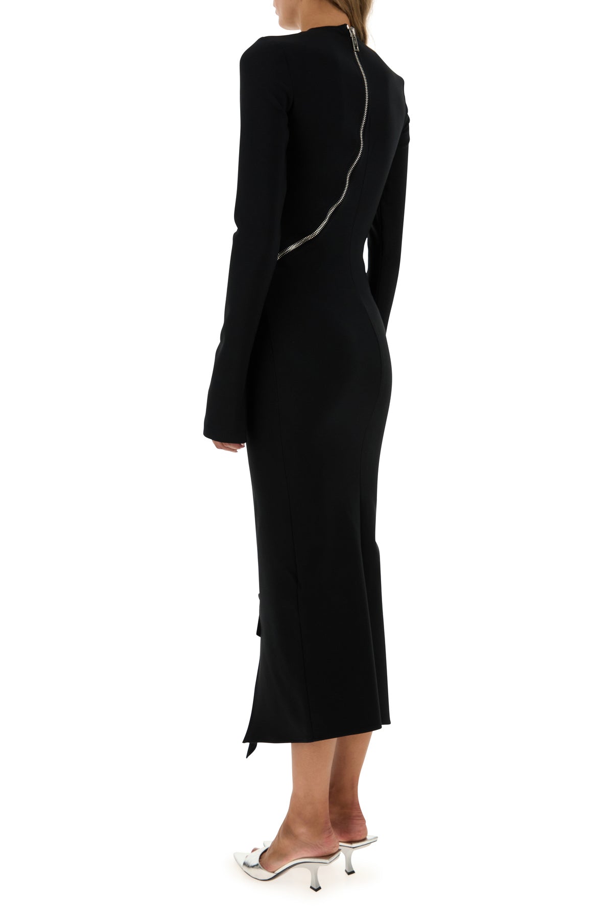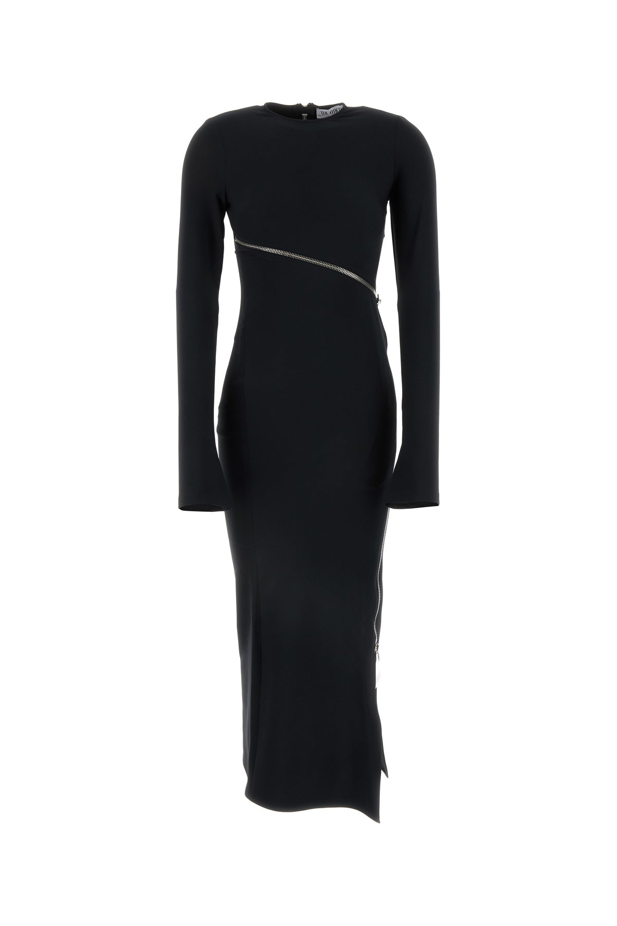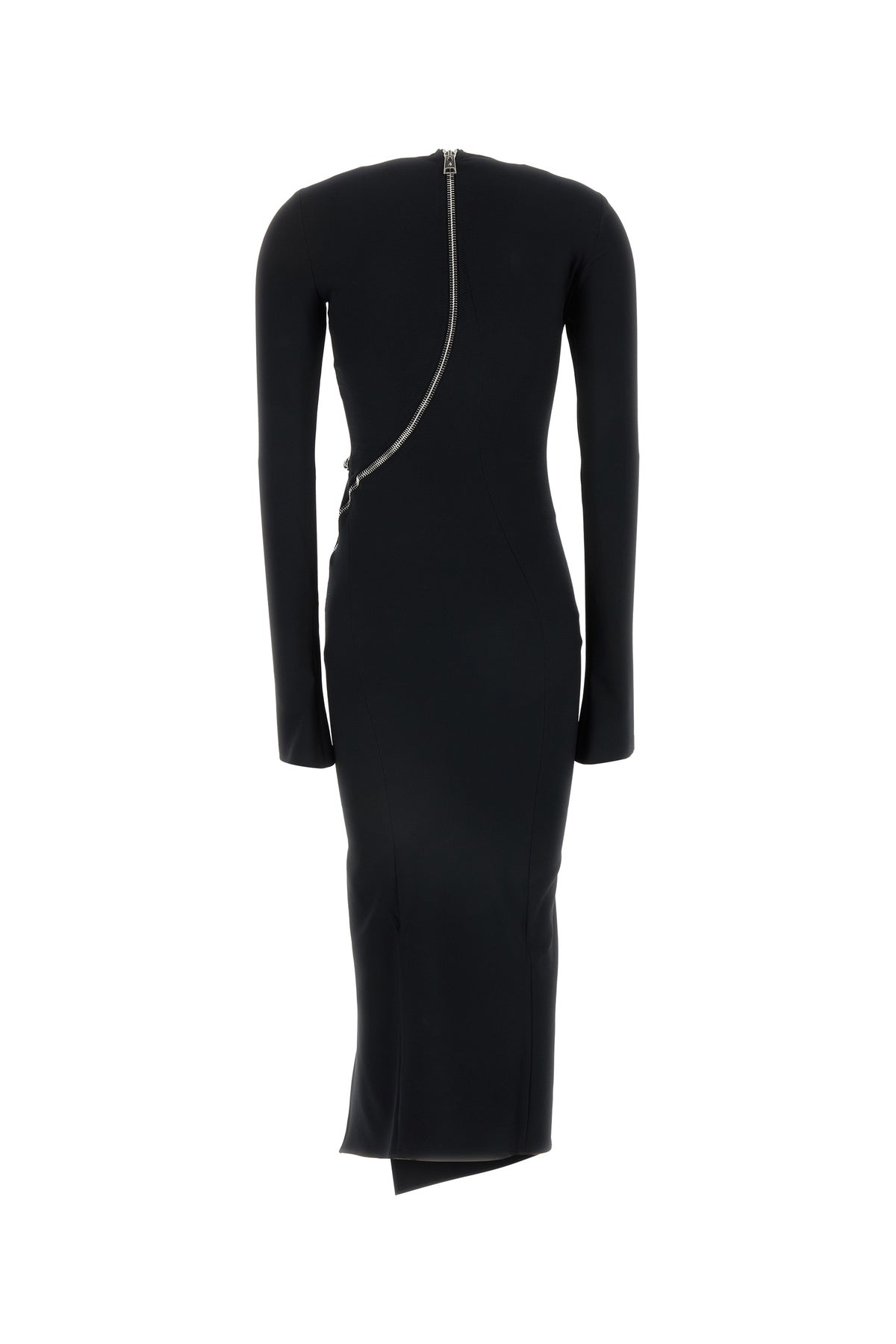 Midi dress realized in stretch polyester enriched by decorative asymmetric zip at the front.