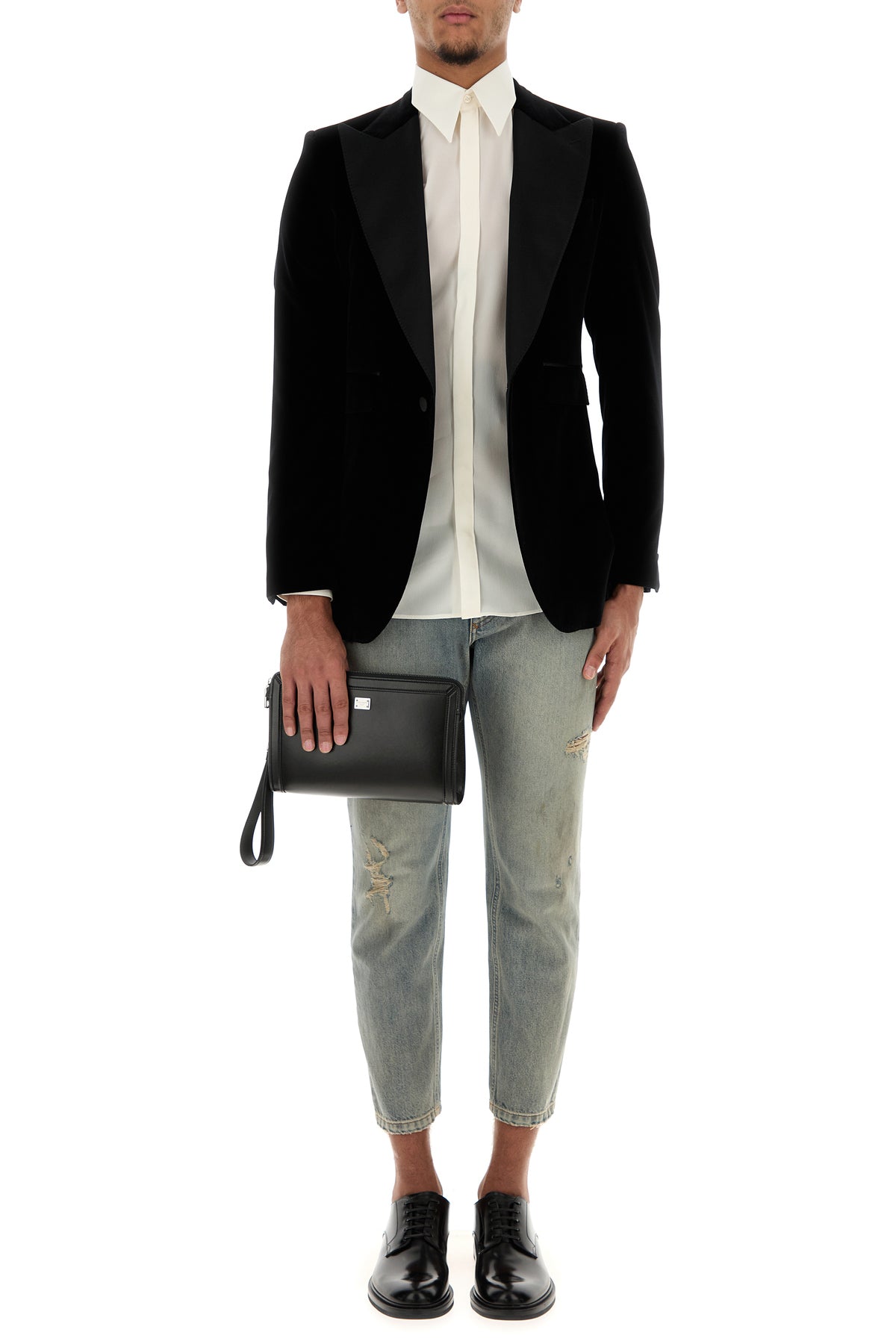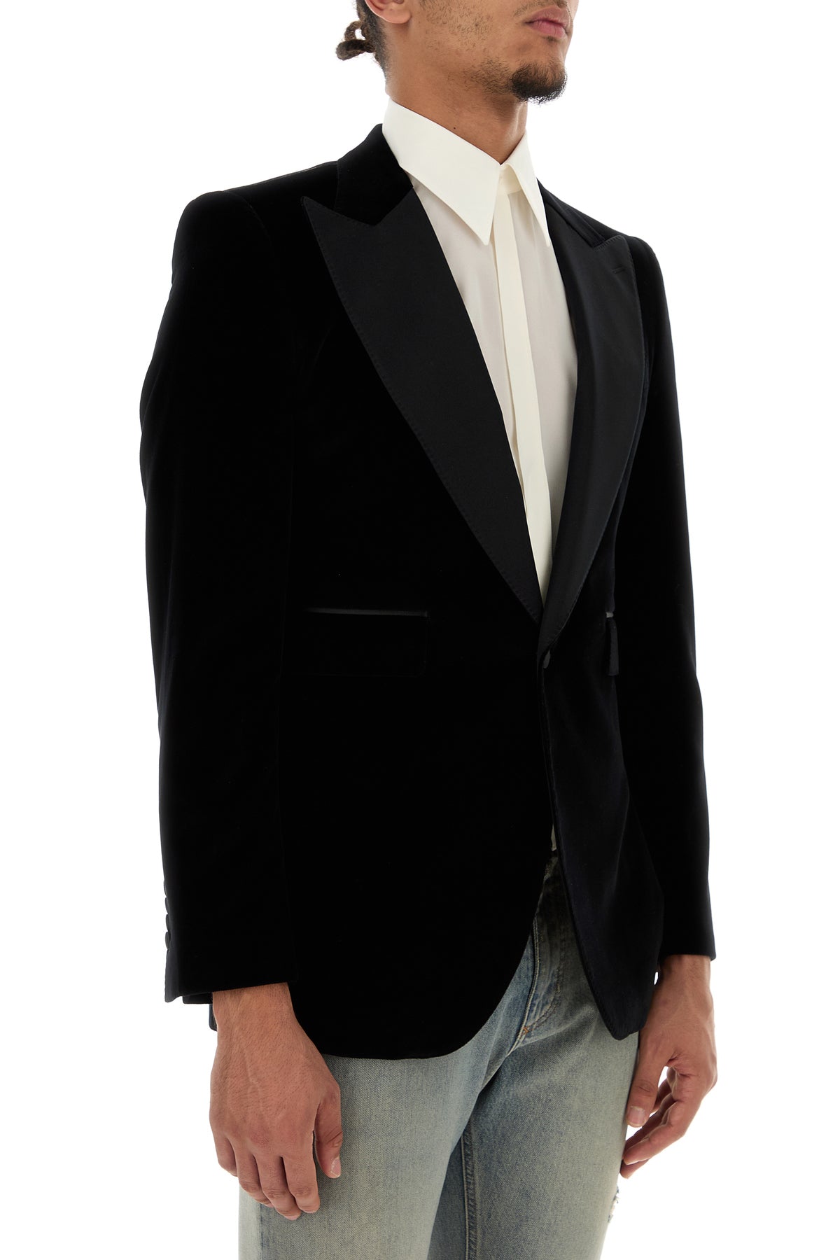 Blazer realized in velvet characterized by peak lapels.