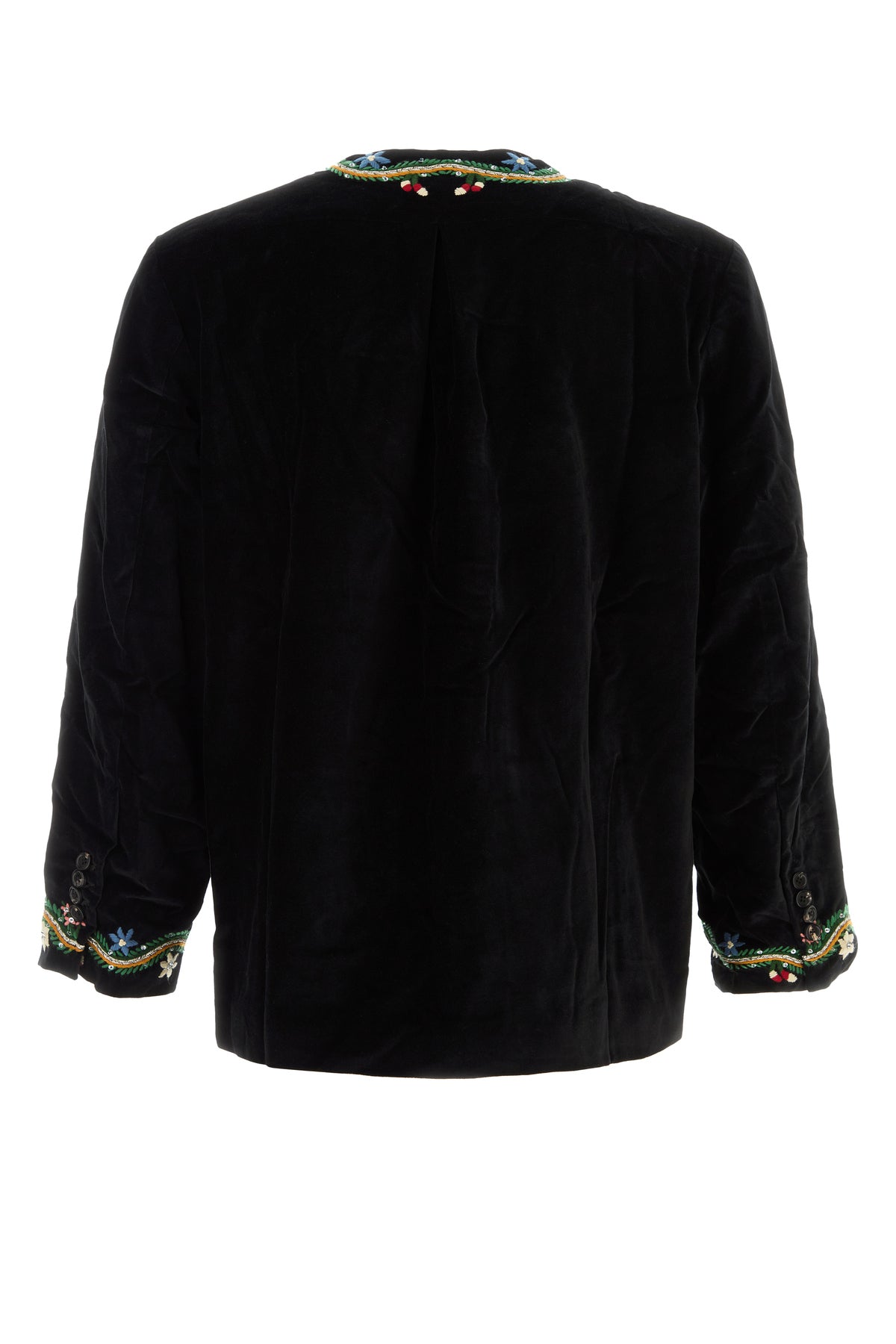 Cardigan realized in velvet characterized by contrasting peculiar floral embroideries on the trimmings.