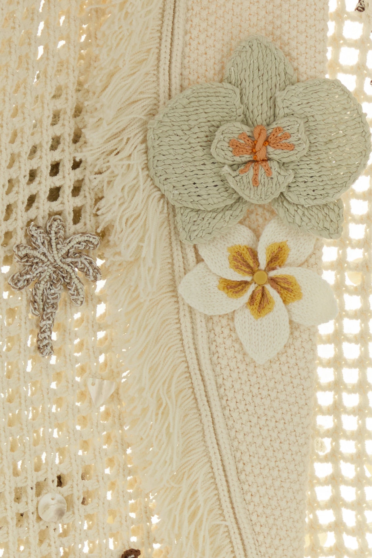 Cardigan realized in crochet enriched by floral patches and peculiar patch on the entire surface.