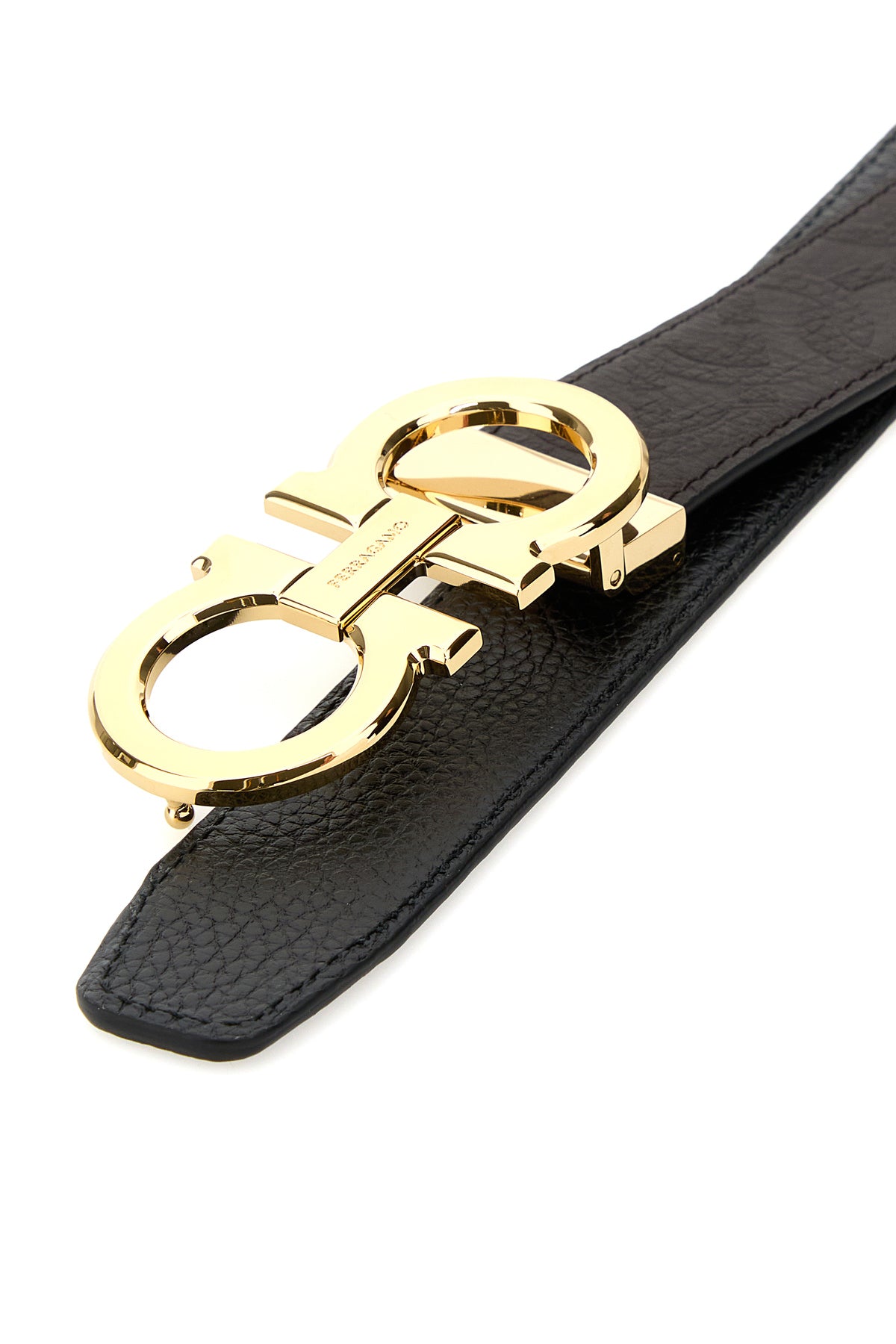 Reversible belt realized in smooth leather characterized by Gancini motif in relief on the entire surface enriched by Gancini metal buckle.