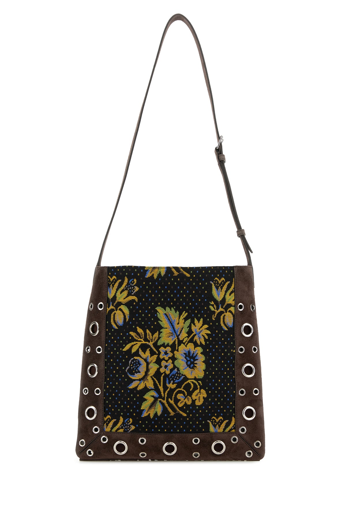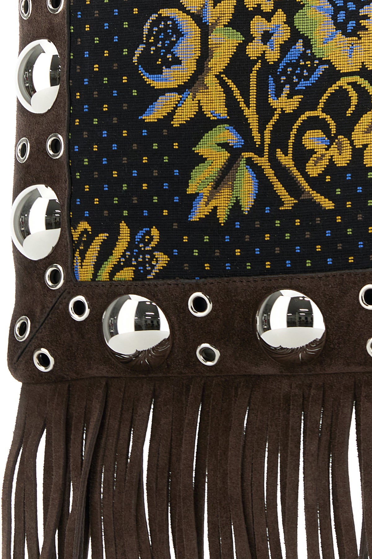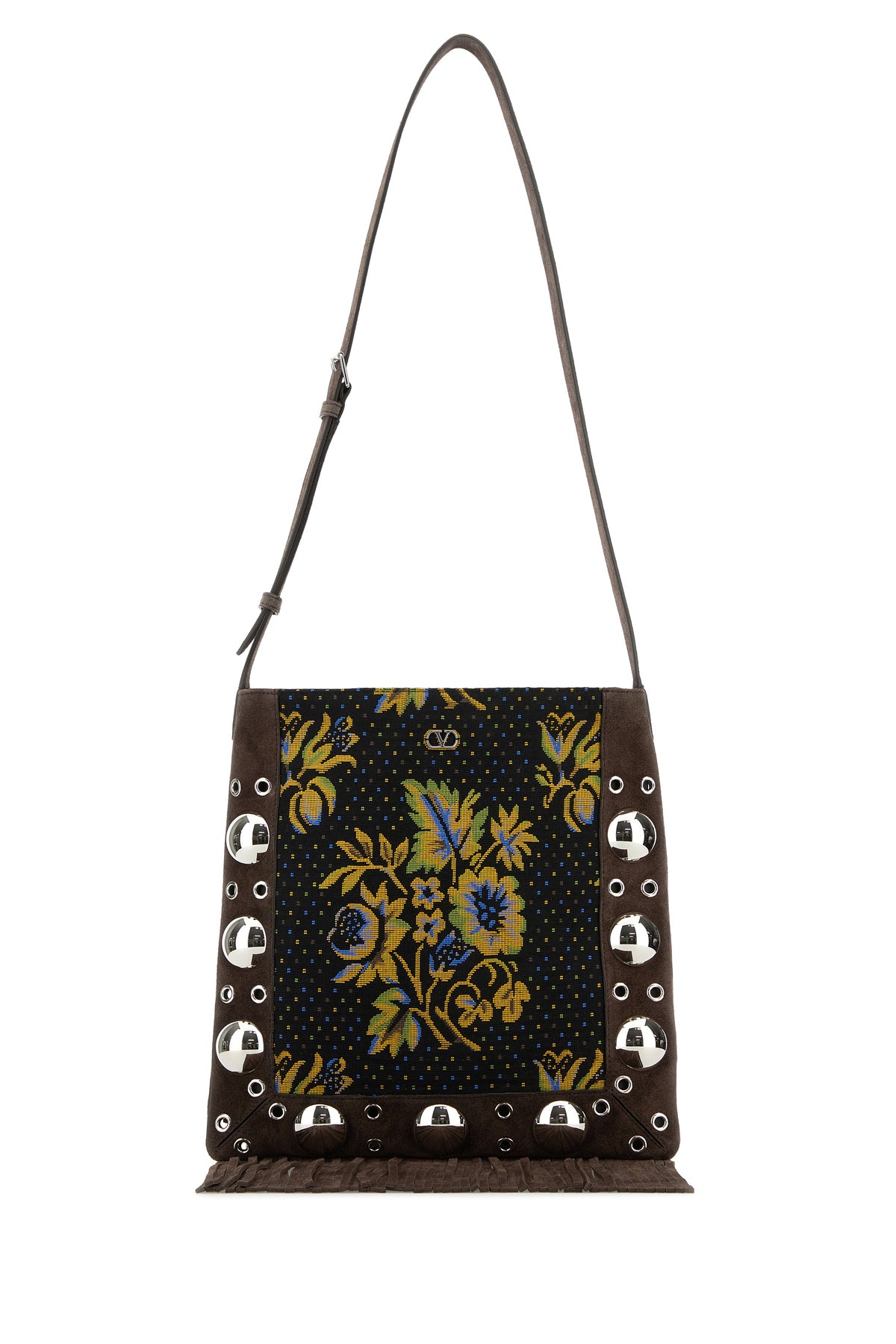 Shoulder bag realized in jacquard with suede inserts on the sides characterized by peculiar floral embroidery at the front and at the back enriched by VLogo Signature metal detail at the top, metal studs at the front and fringes on the hemline.