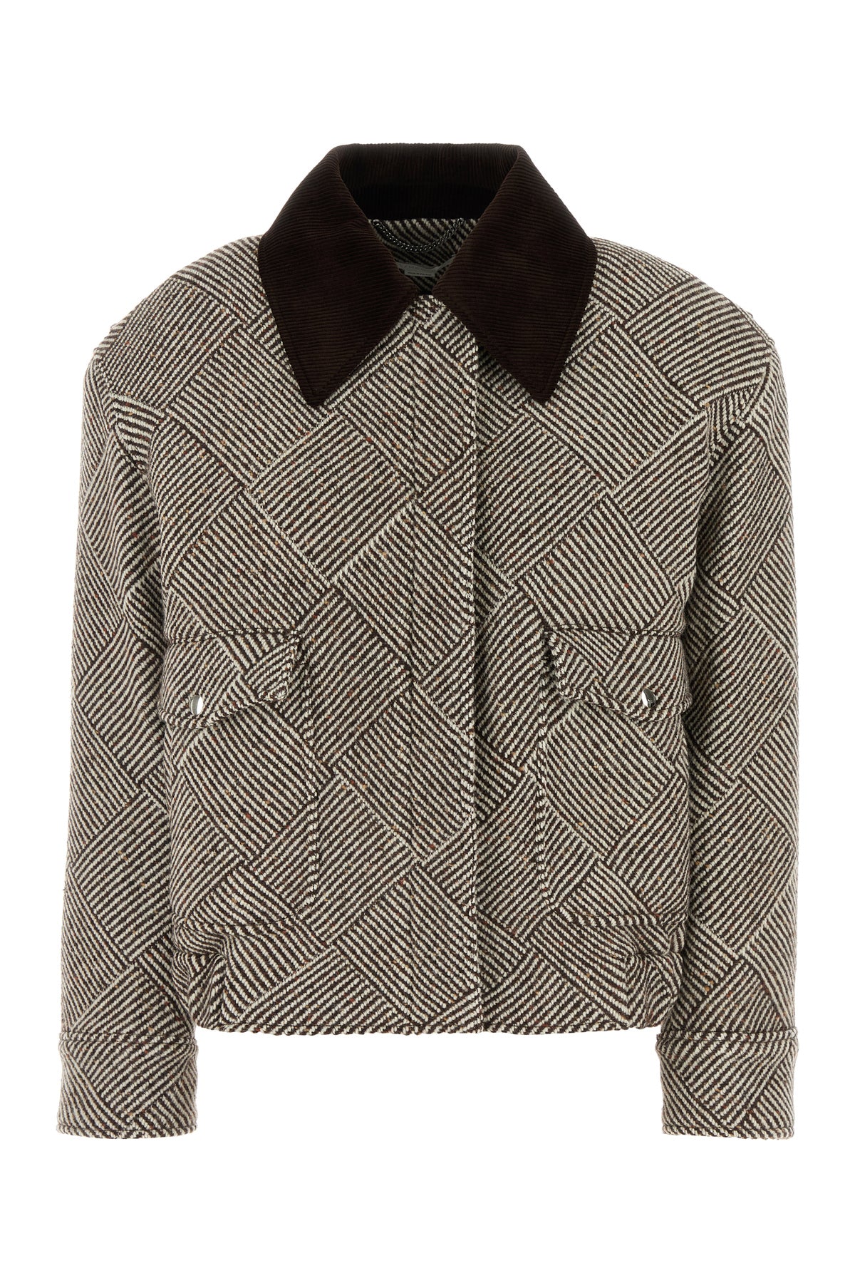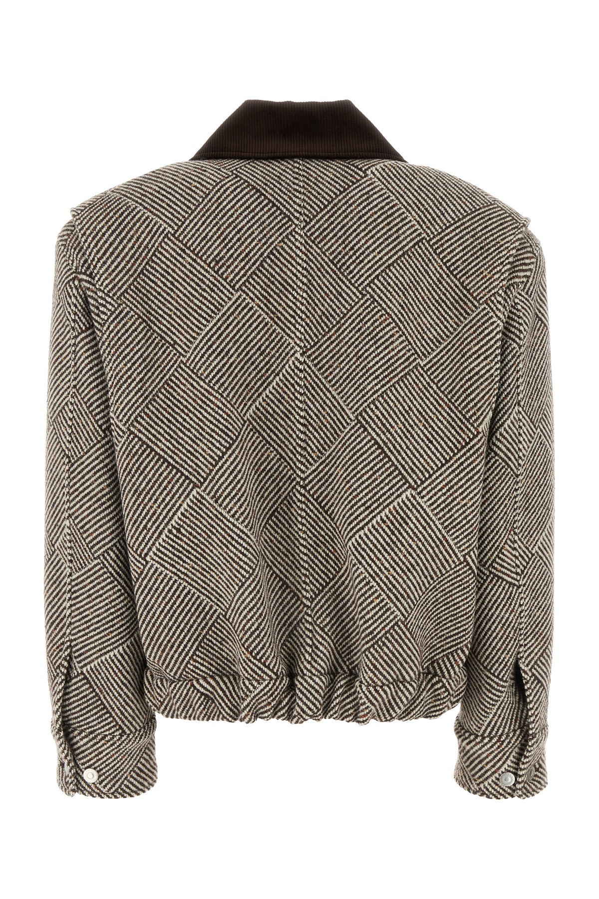 Oversize bomber jacket realized in tweed characterized by peculiar embroidery on the entire surface.