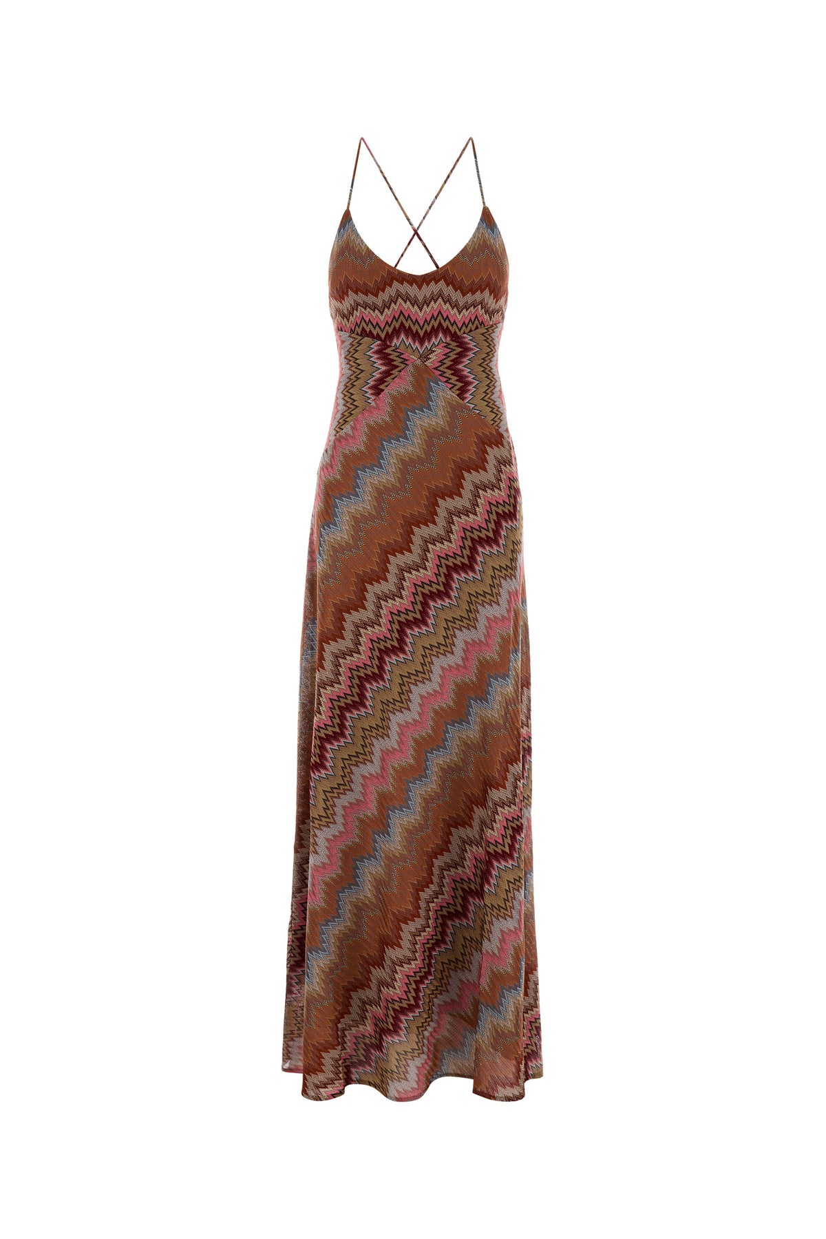 Long dress realized in viscose characterized by chevron motif embroidery on the entire surface.