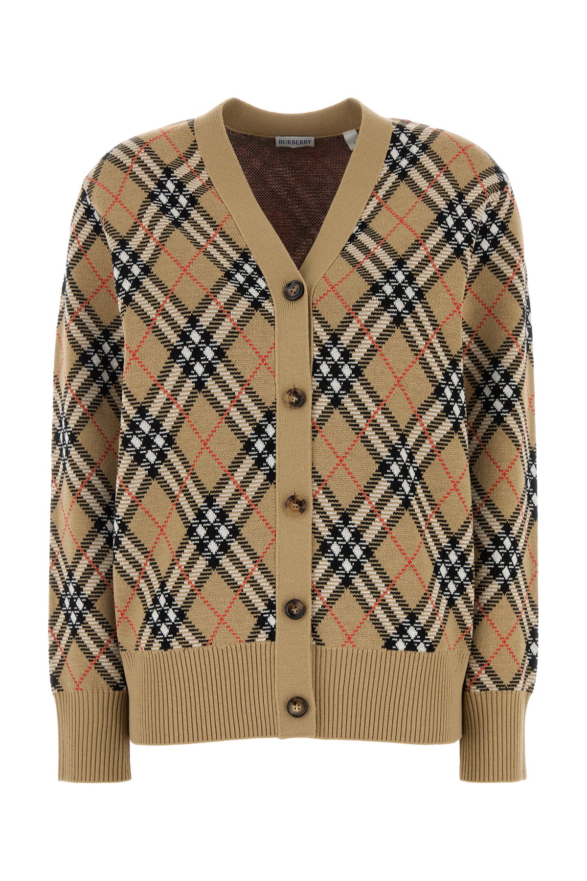 Cardigan realized in wool blend characterized by Burberry Check motif embroidery on the entire surface.