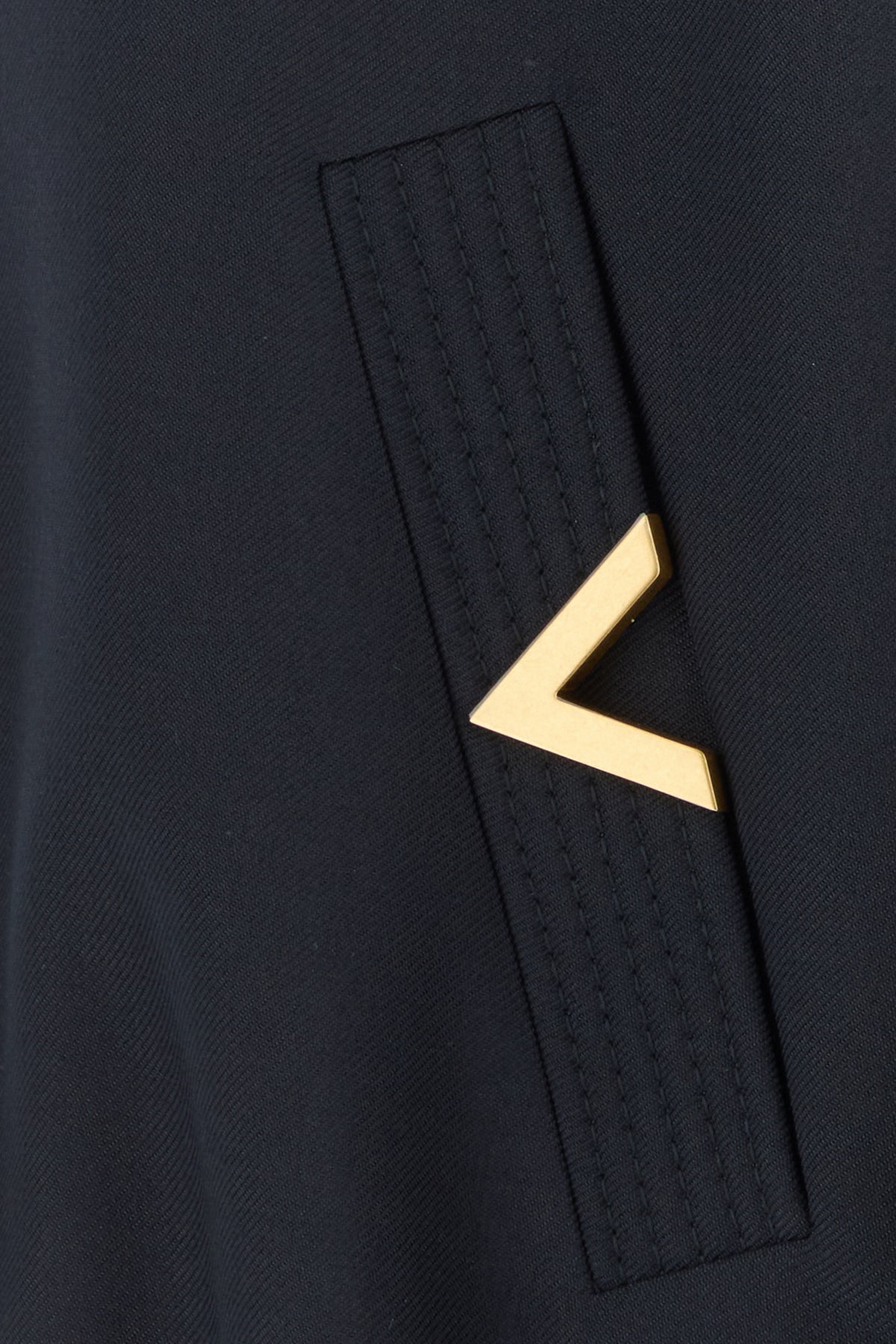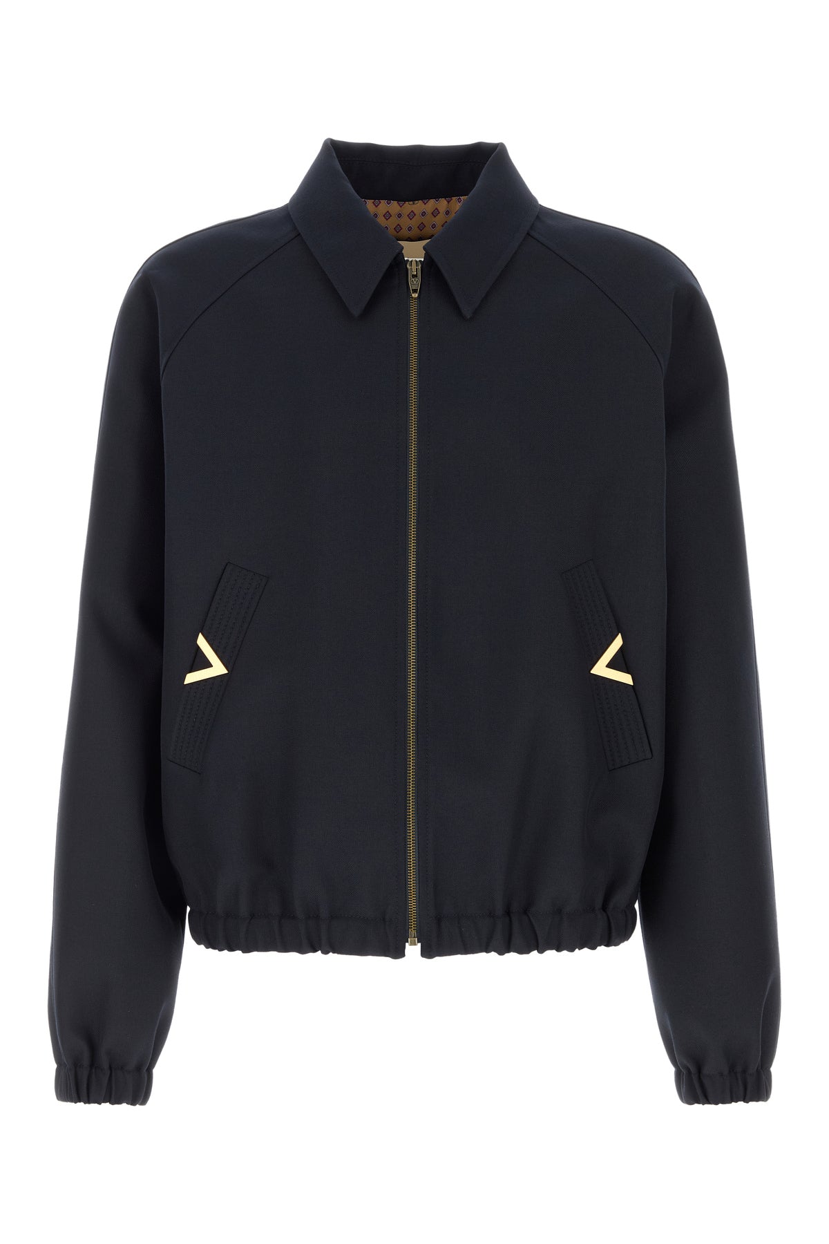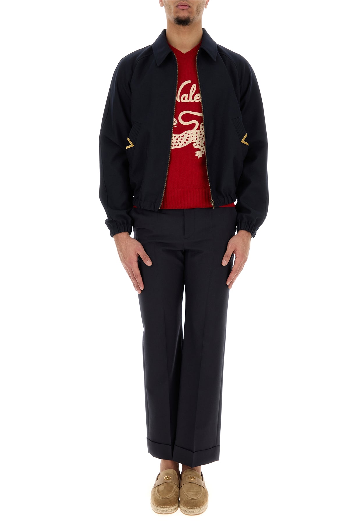 Jacket realized in gabardine enriched by V metal detail at the front.