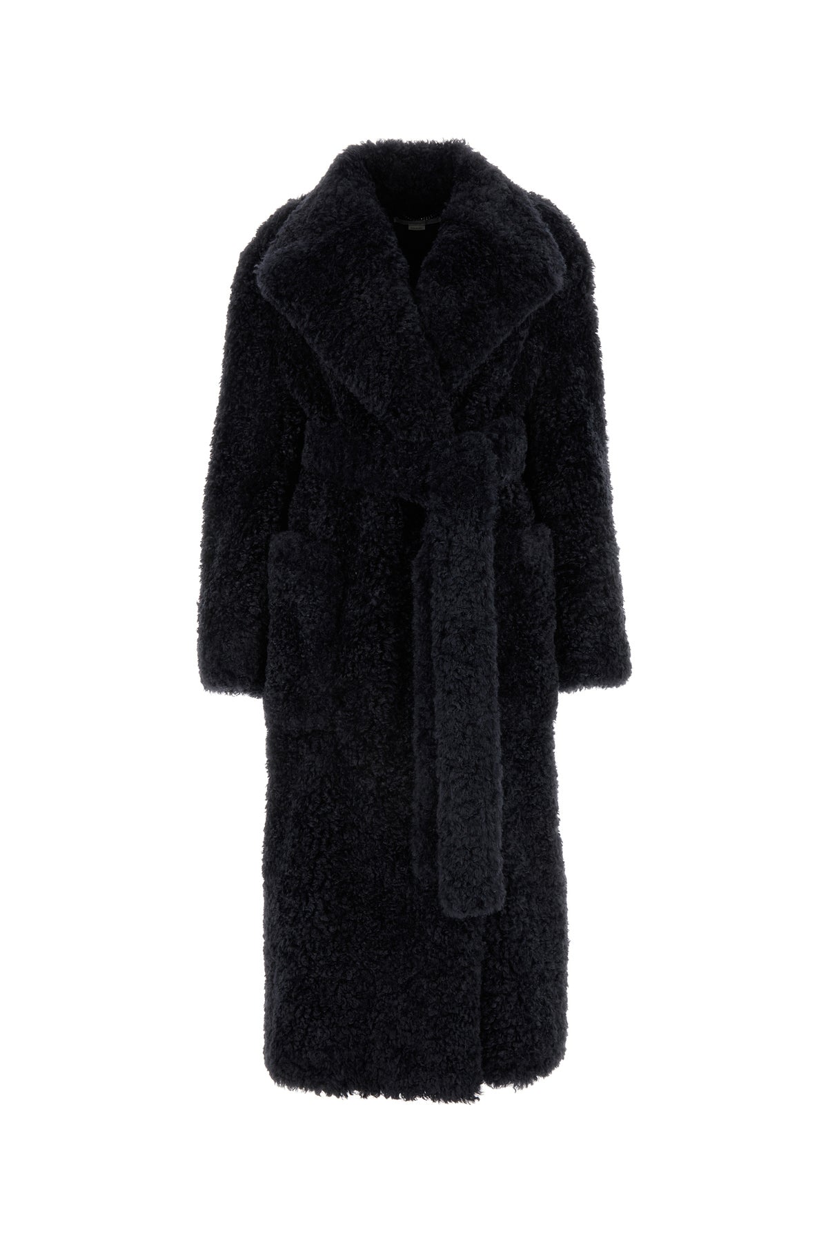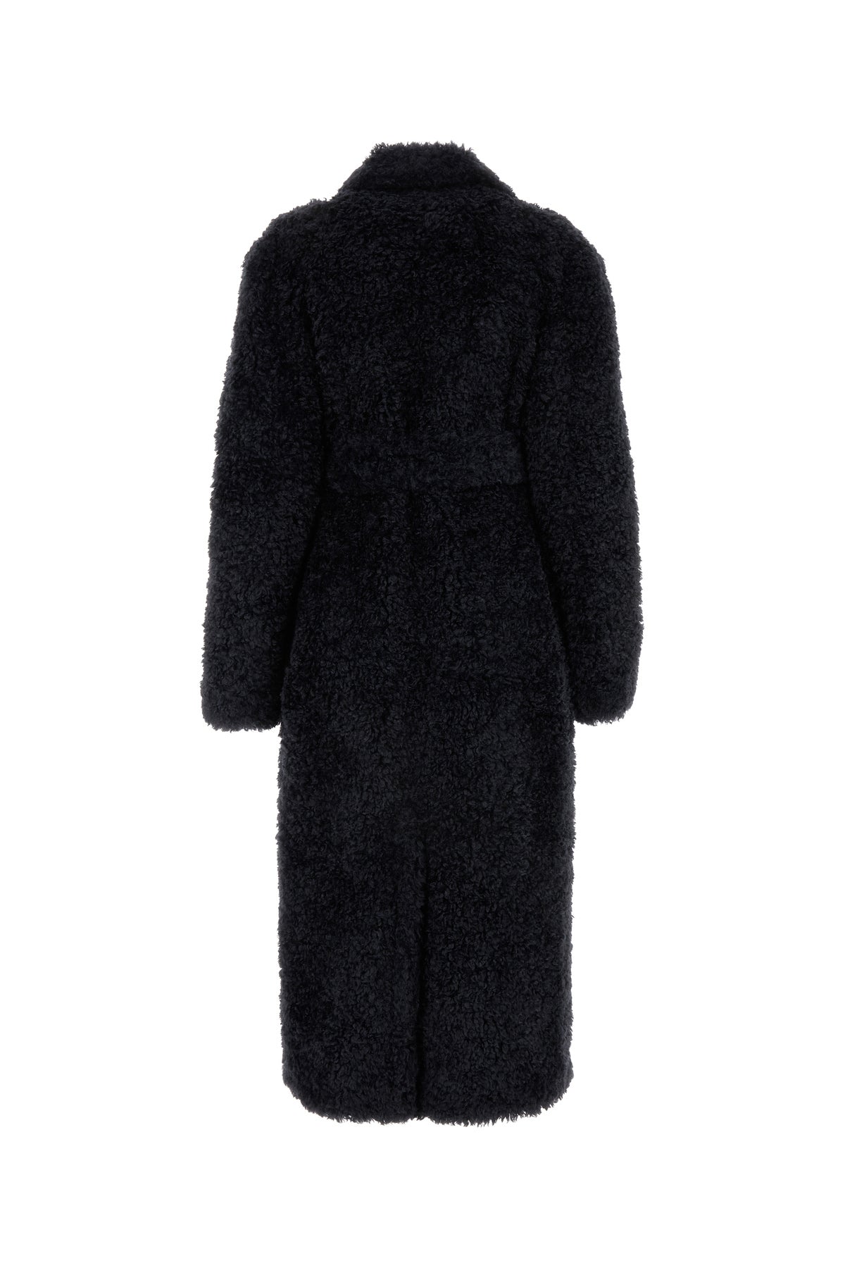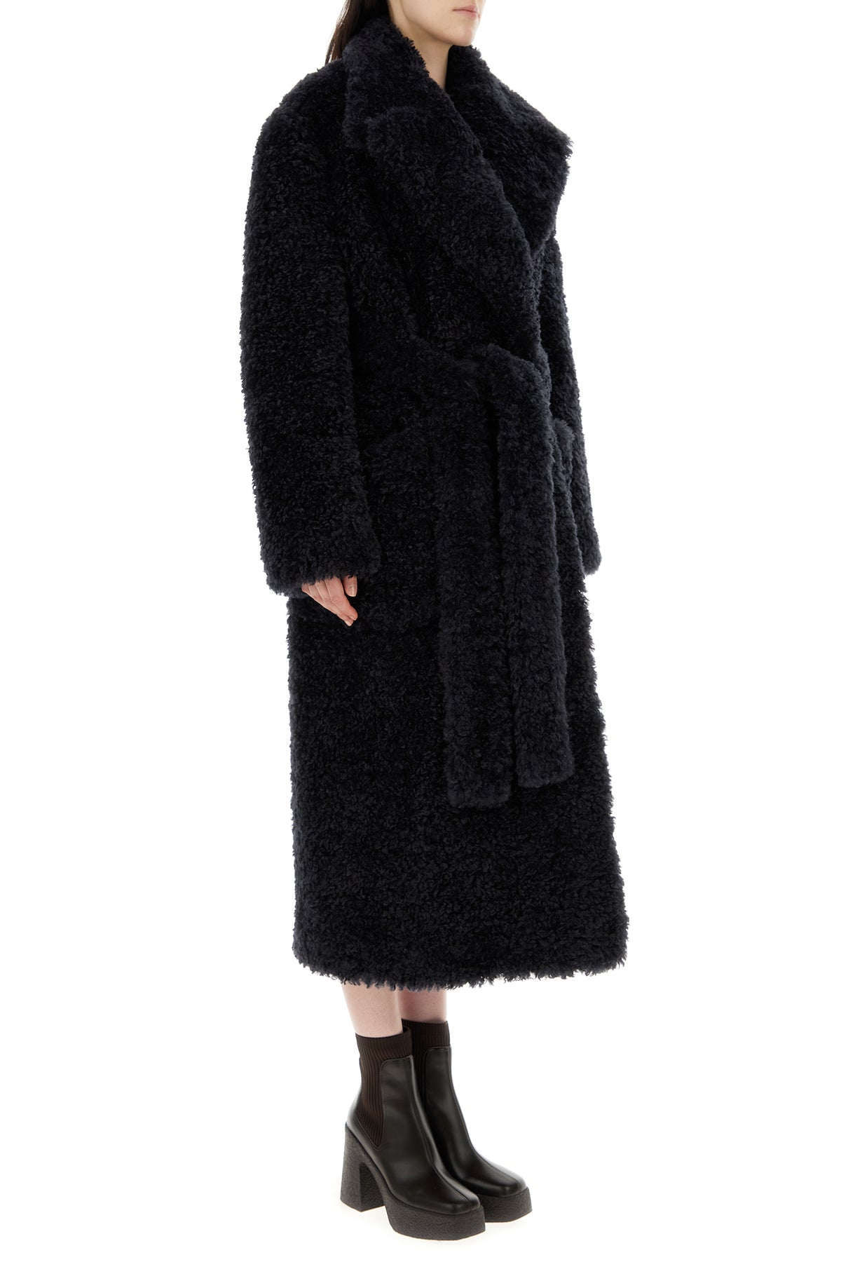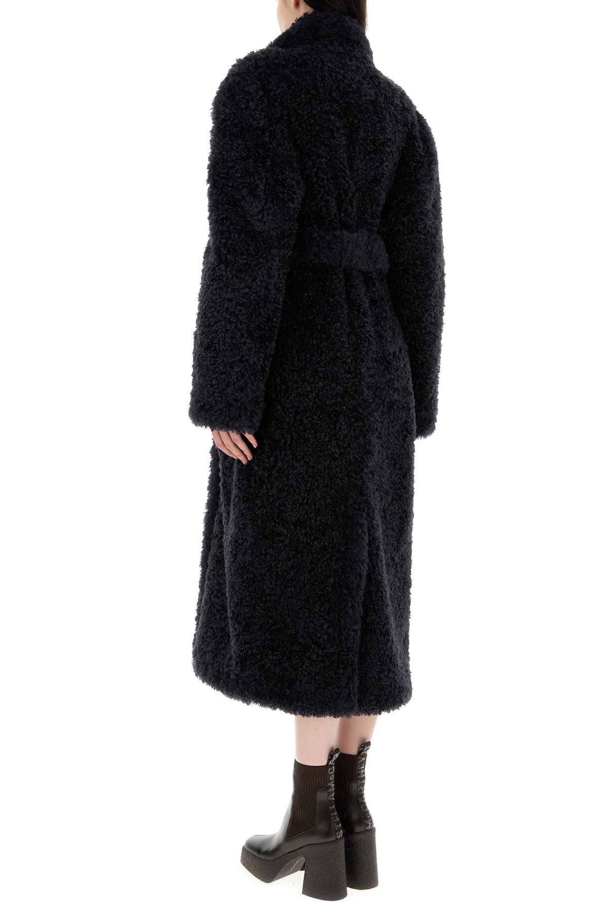 Coat realized in teddy fabric enriched by detachable tonal fabric belt to tie at the waist.