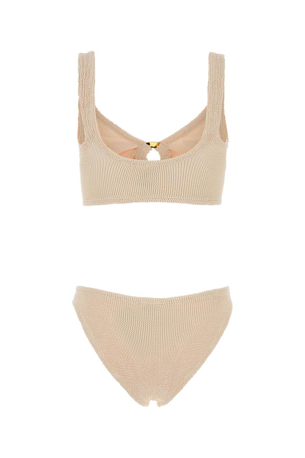 Bikini realized in embossed stretch nylon enriched by decorative detail at the front.