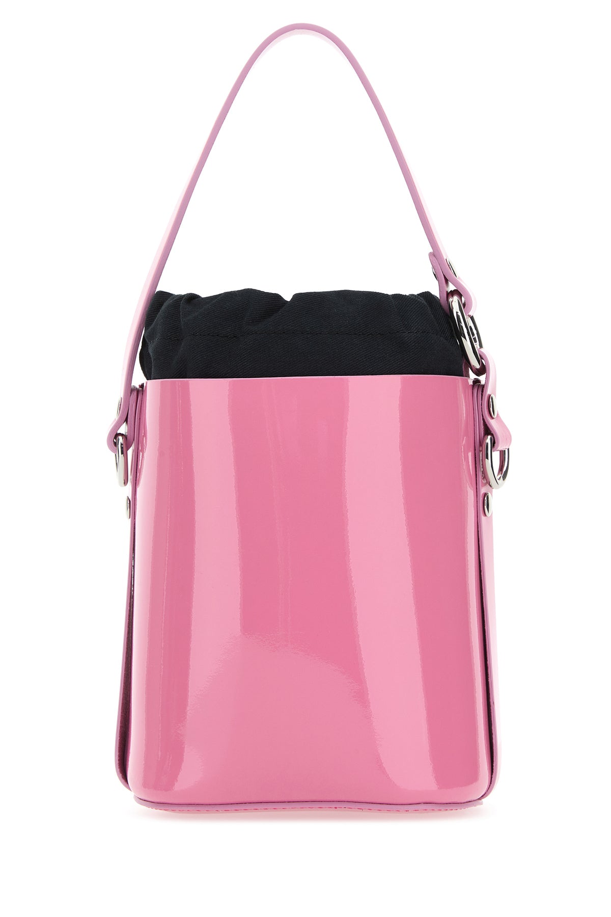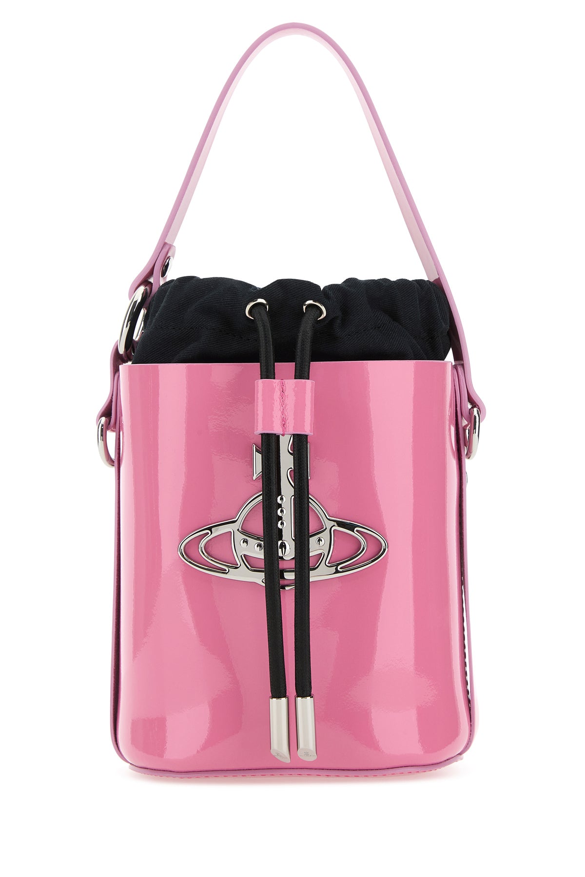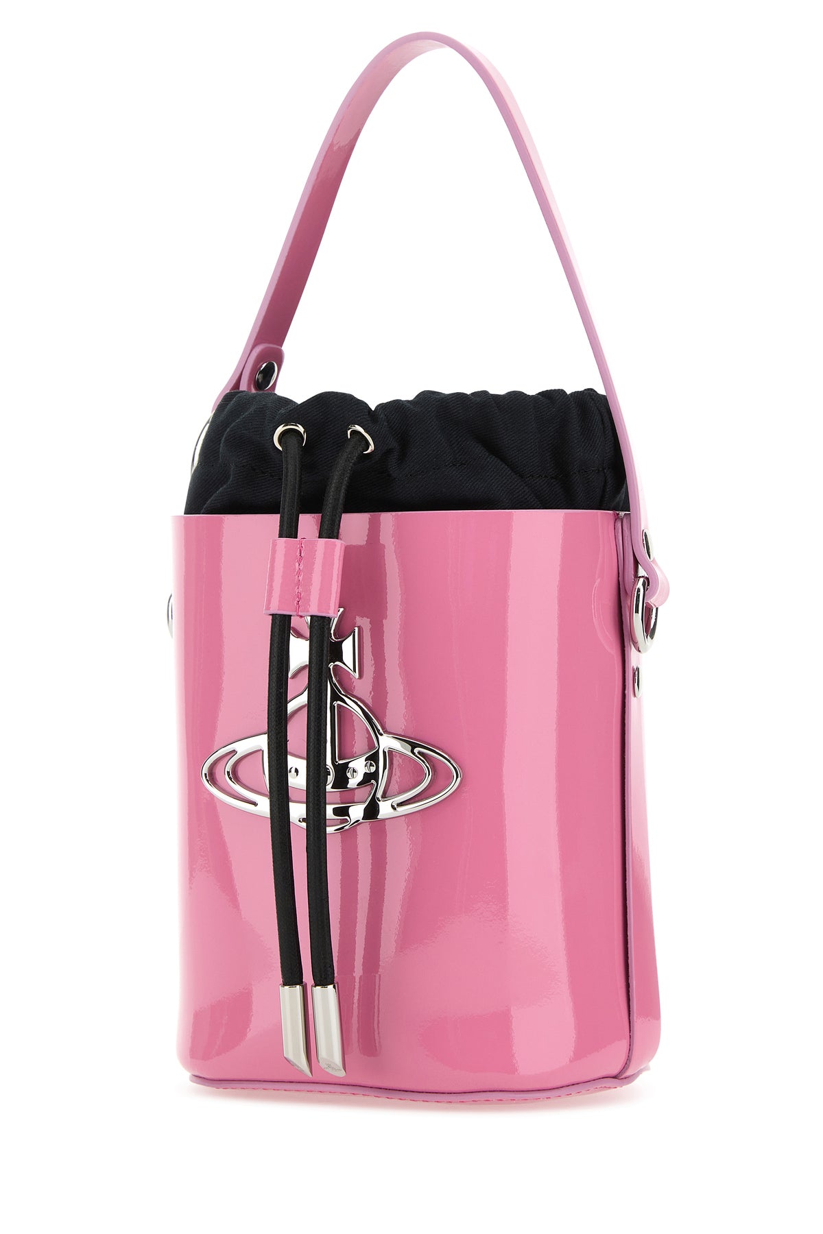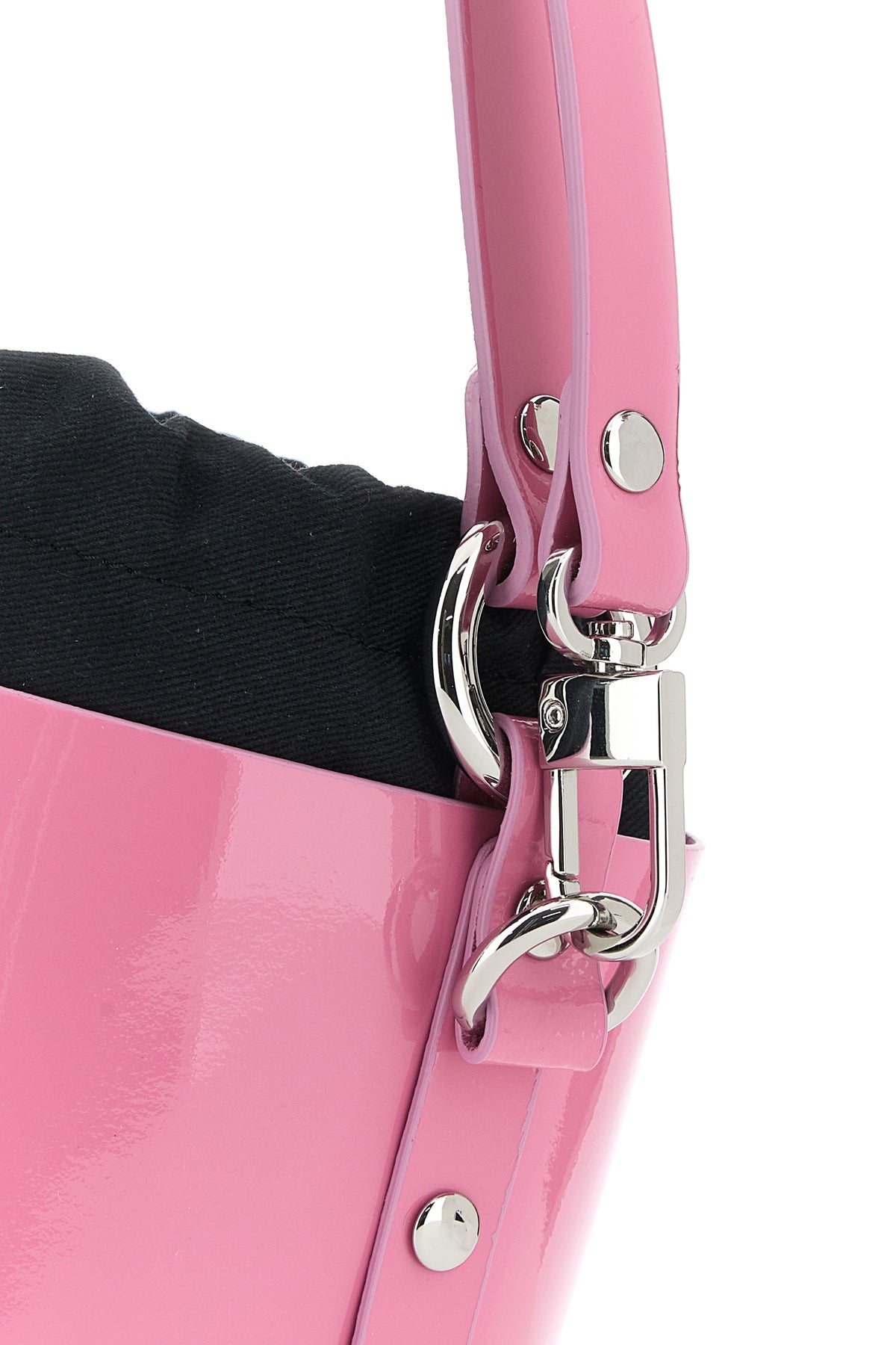 Bucket bag realized in patent bovine leather enriched by metal logo at the front.