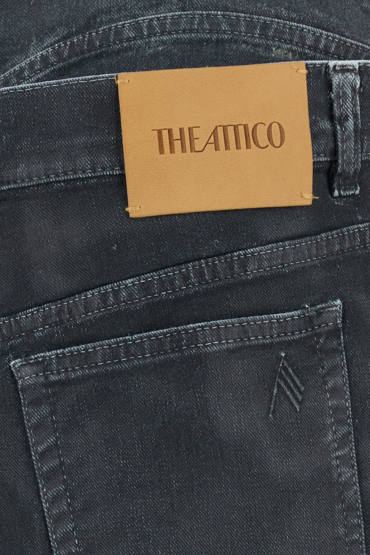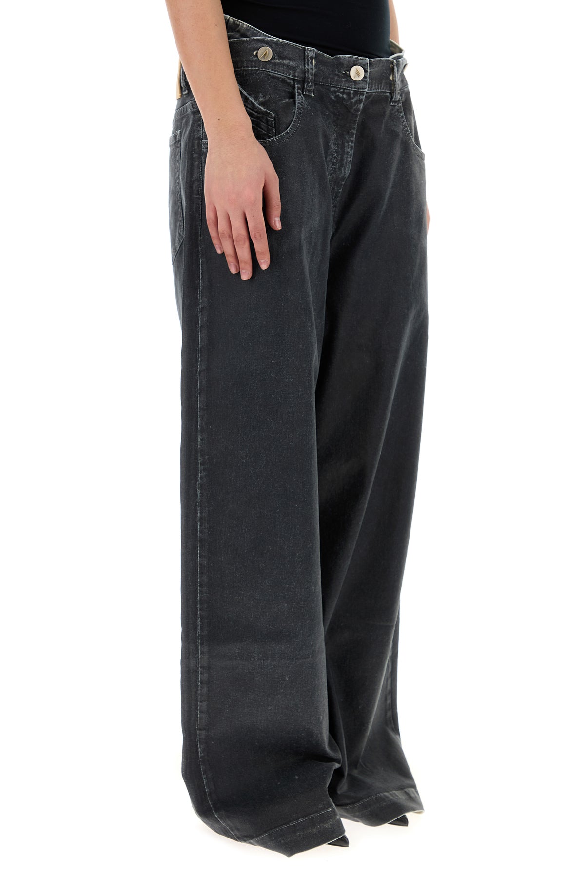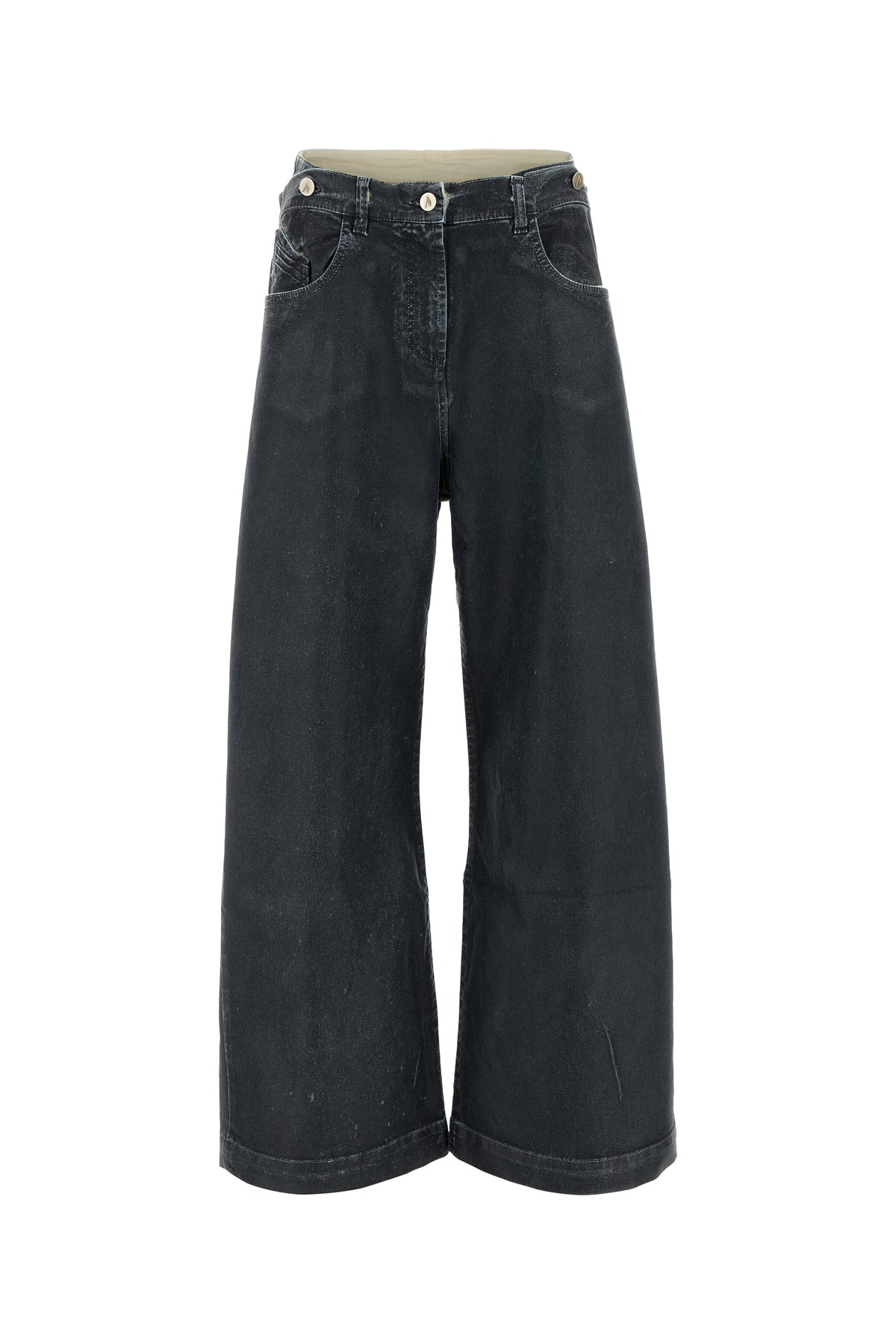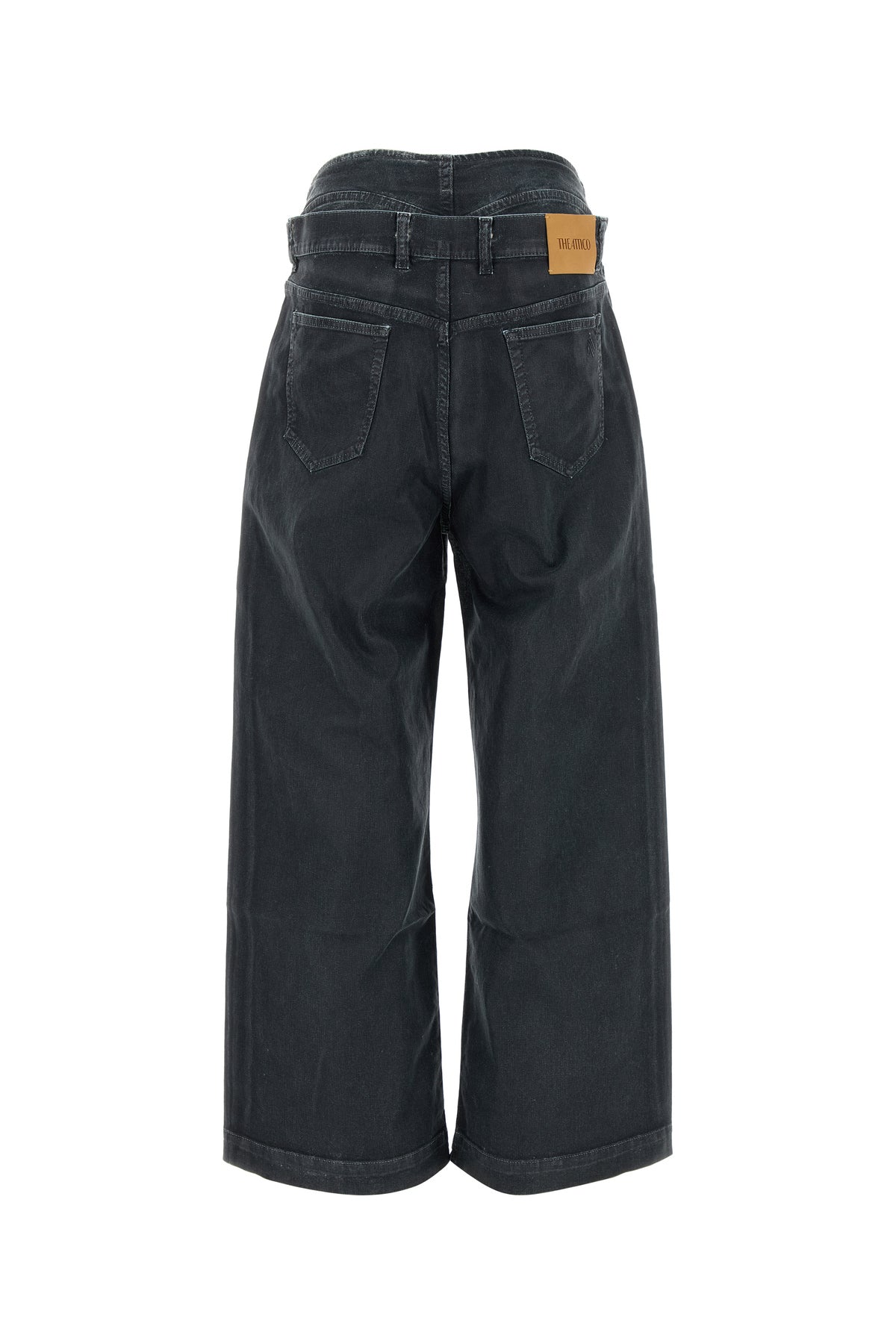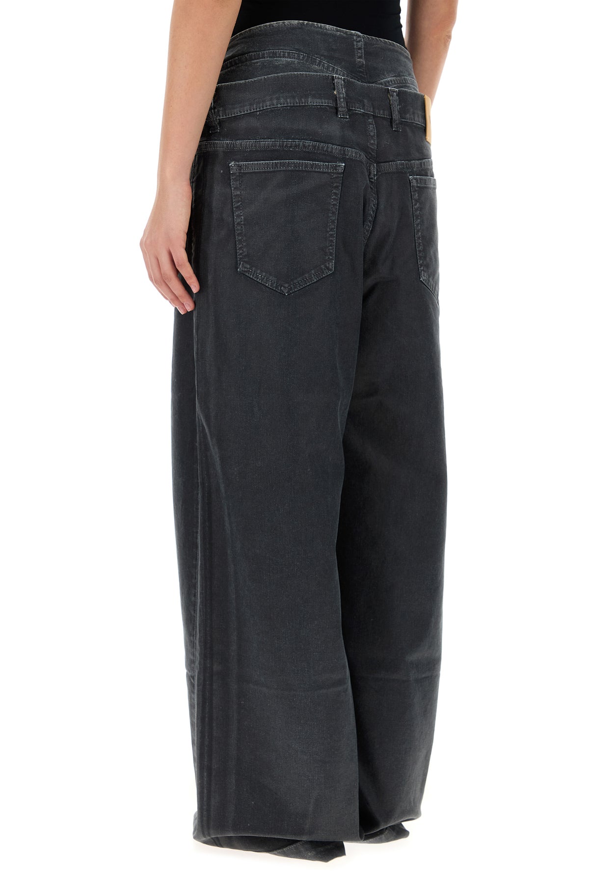 Wide-leg jeans realized in stretch cotton denim with detachable tonal fabric insert at the top characterized by tonal embroidered logo at the back.