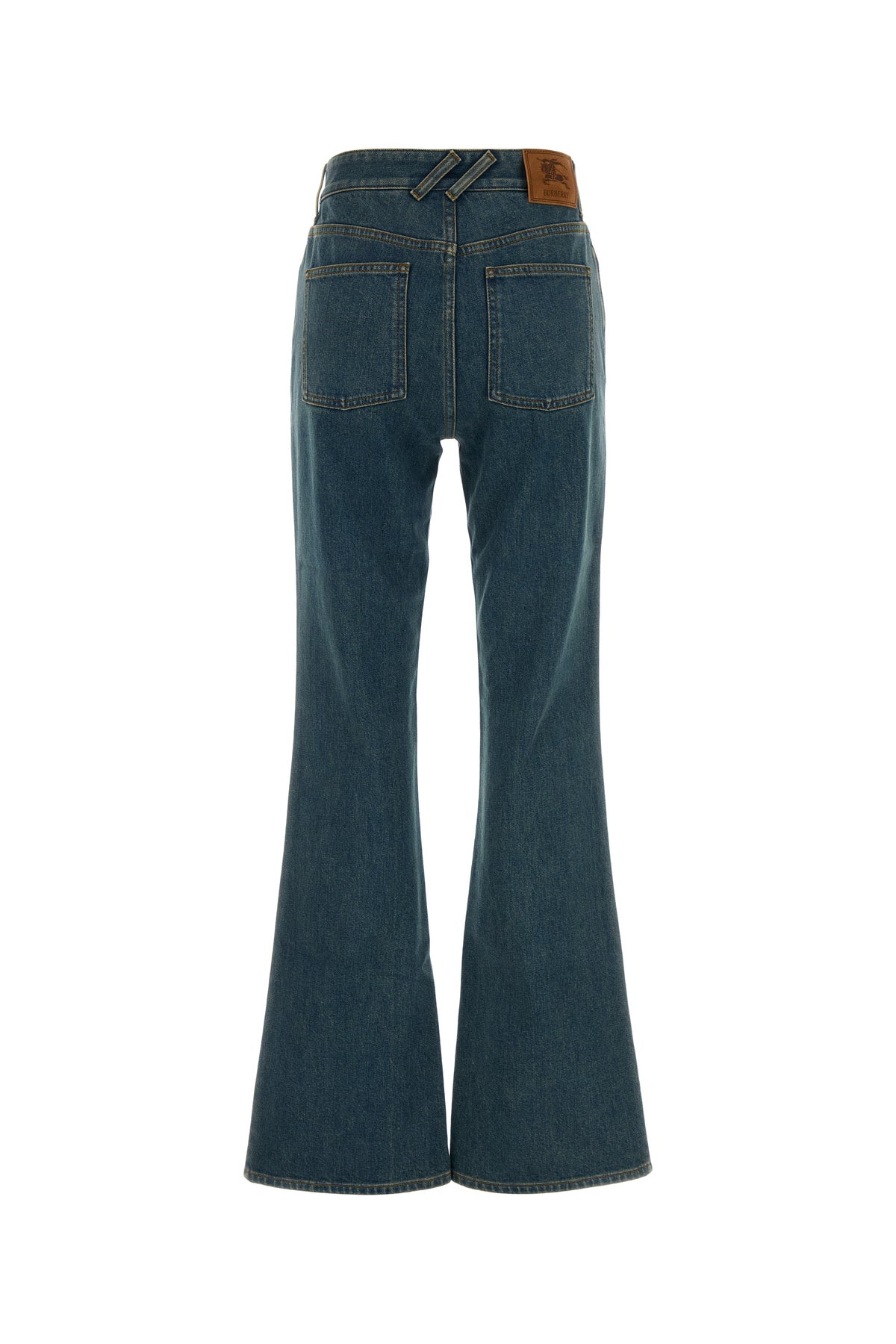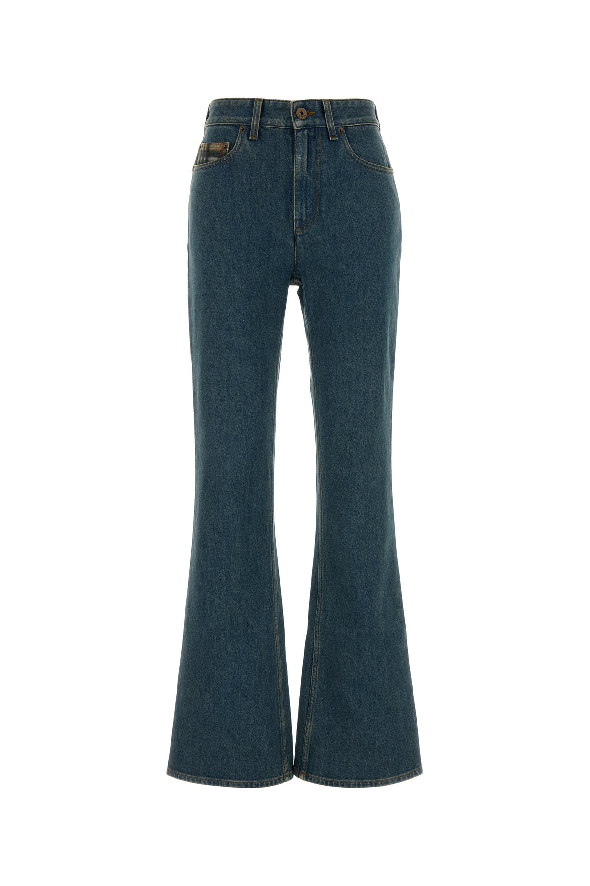 Flared leg jeans realized in stonewashed stretch cotton denim enriched by logoed label on the hemline.