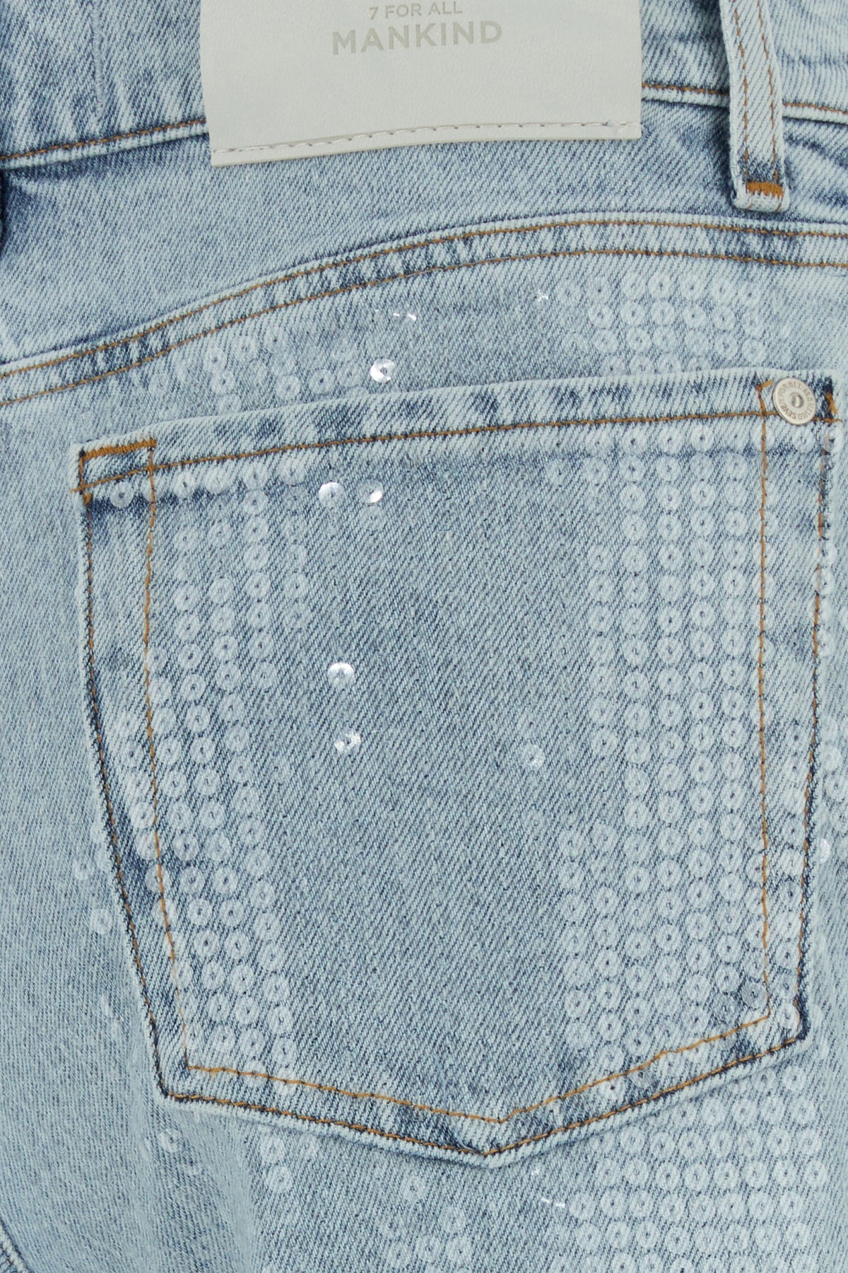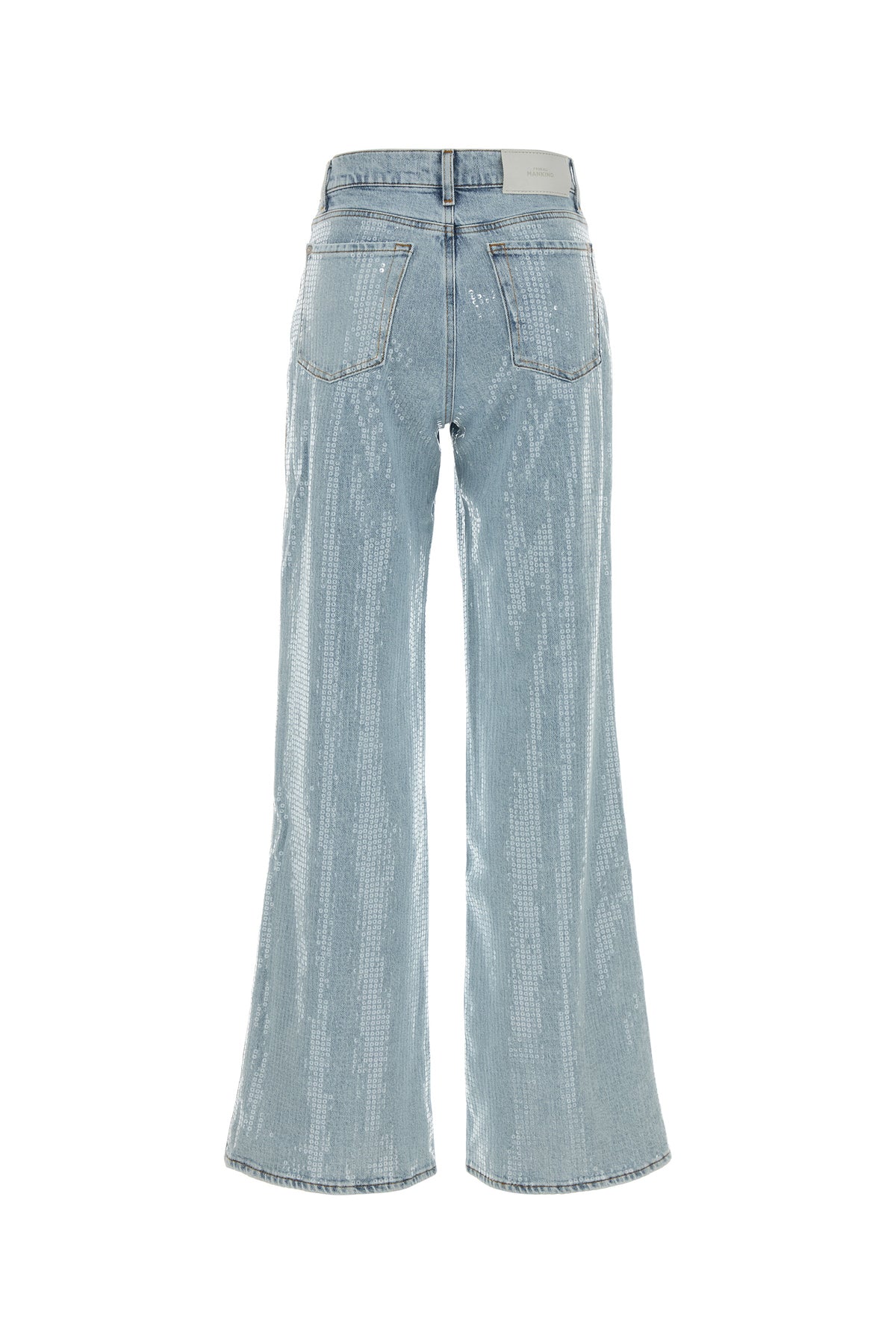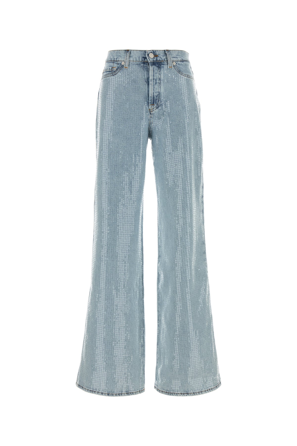 Flared jeans realized in bleached-effect stonewashed stretch cotton denim entirely covered by sequins enriched by logoed label at the back.