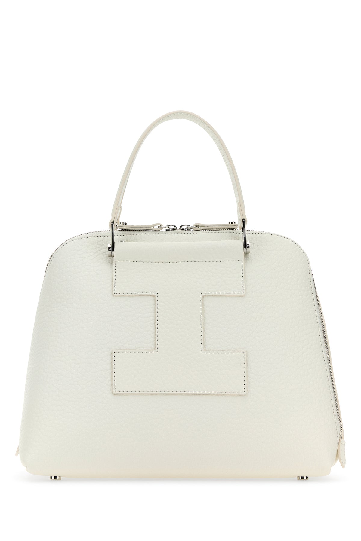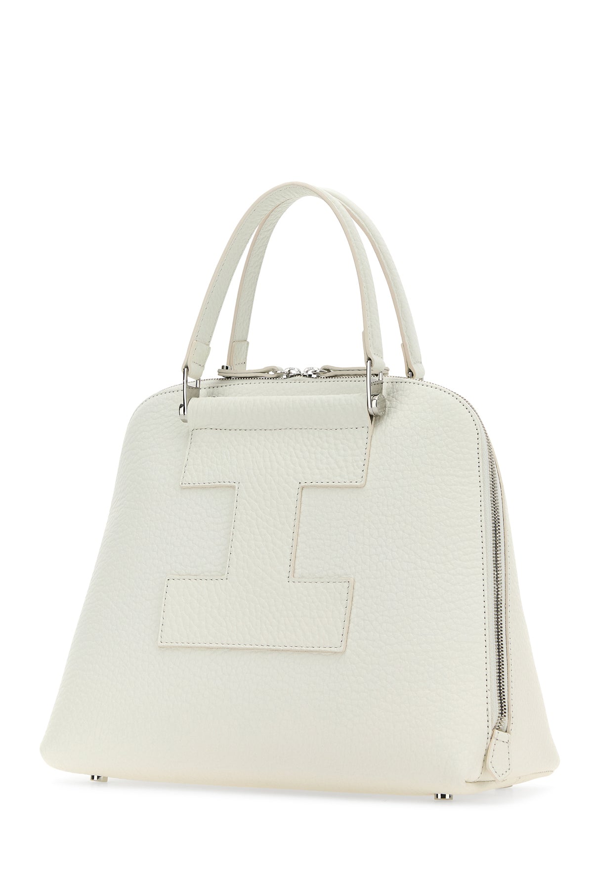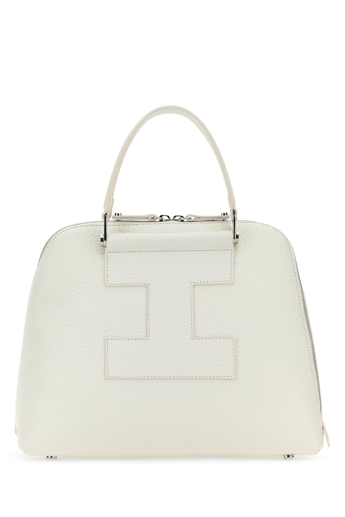 Handbag realized in pebble leather enriched by tonal leather logoed patch at the front and at the back.