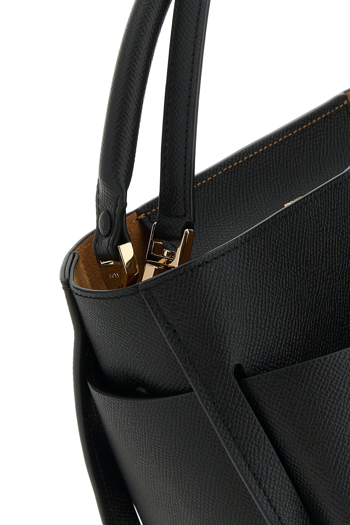 Handbag realized in grained leather enriched by decorative buckle at the front.