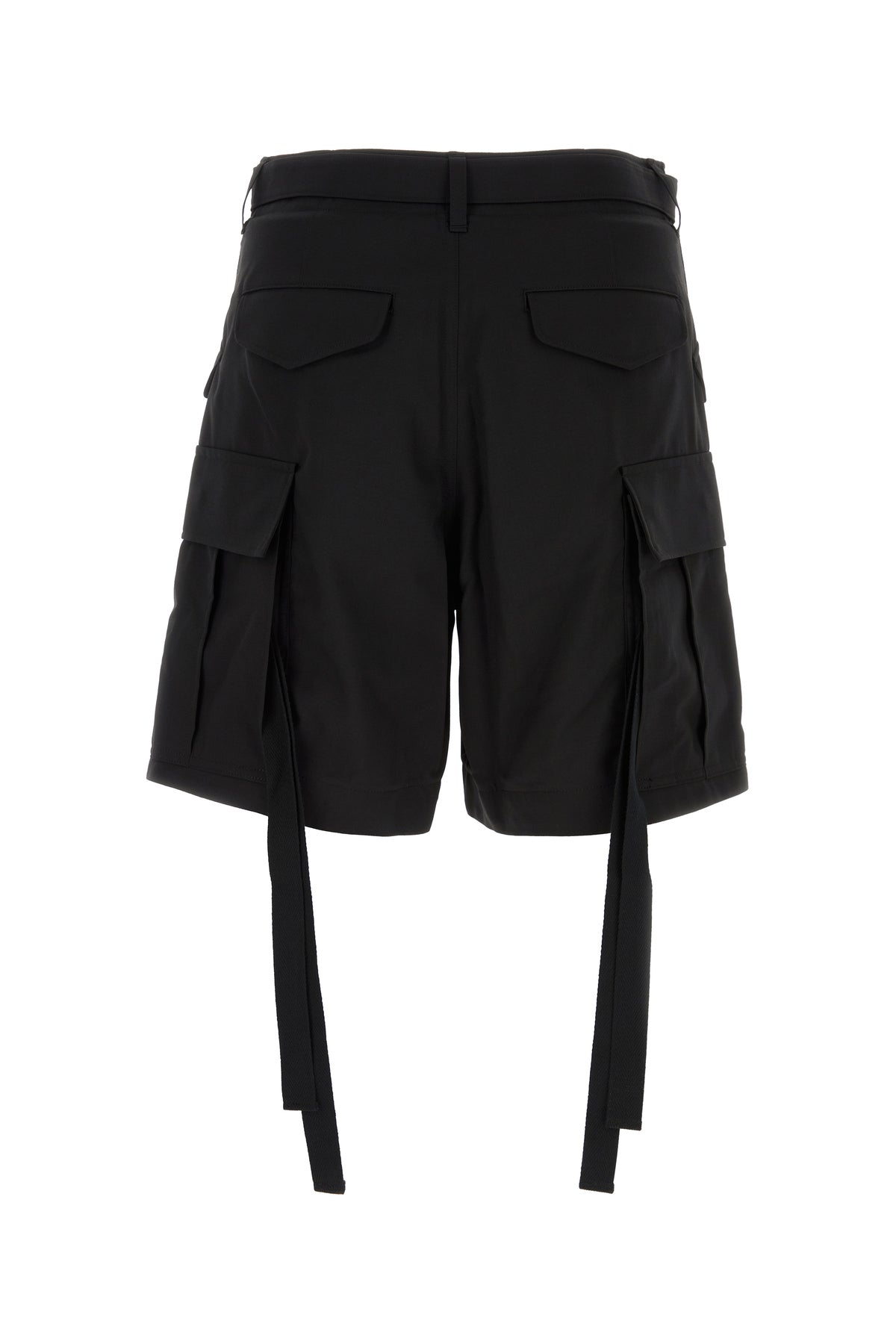 Shorts realized in polyester and wool enriched by detachable tonal fabric belt at the waist and tonal fabric decorative straps at the back.