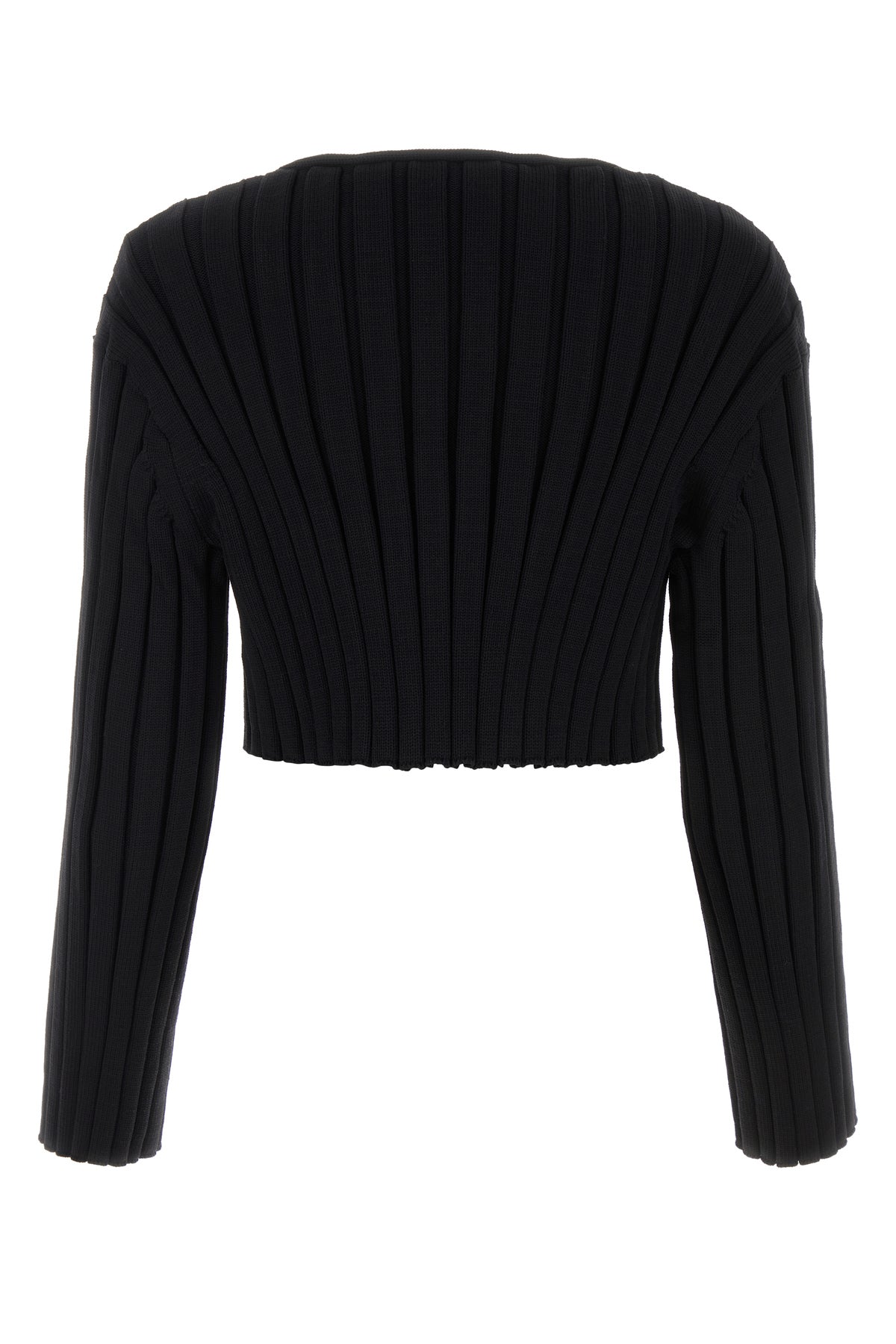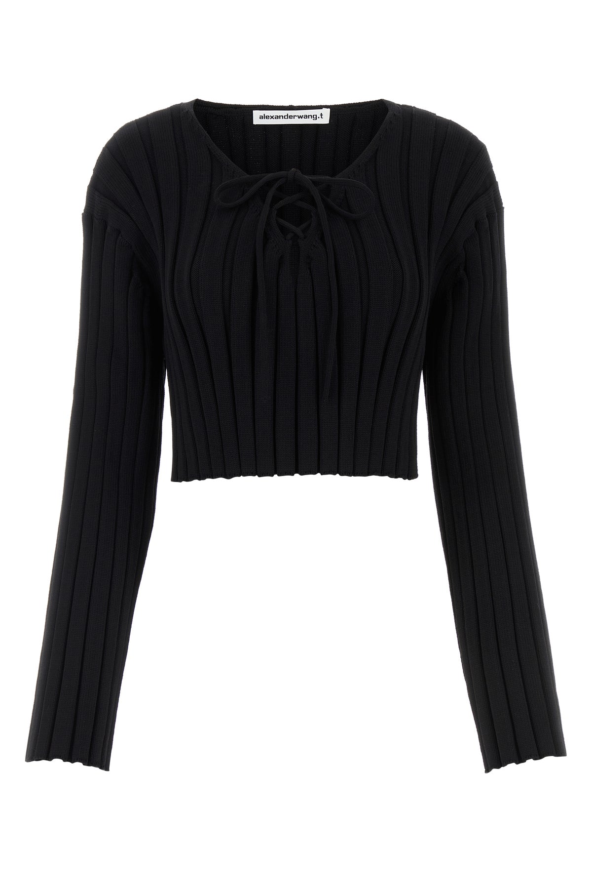 Sweater realized in ribbed stretch nylon characterized by laces to tie at the front.