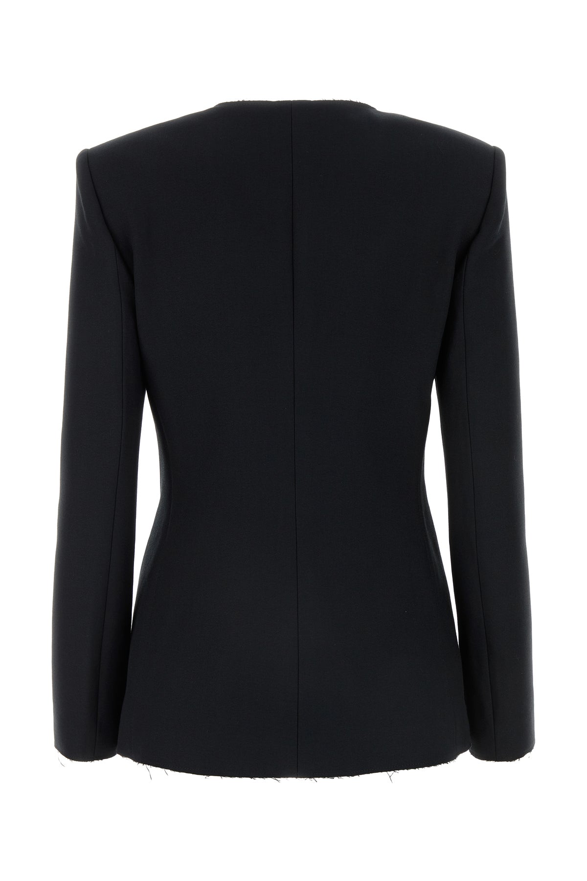 Blazer realized in stretch polyester blend characterized by raw-cut effect trimmings.