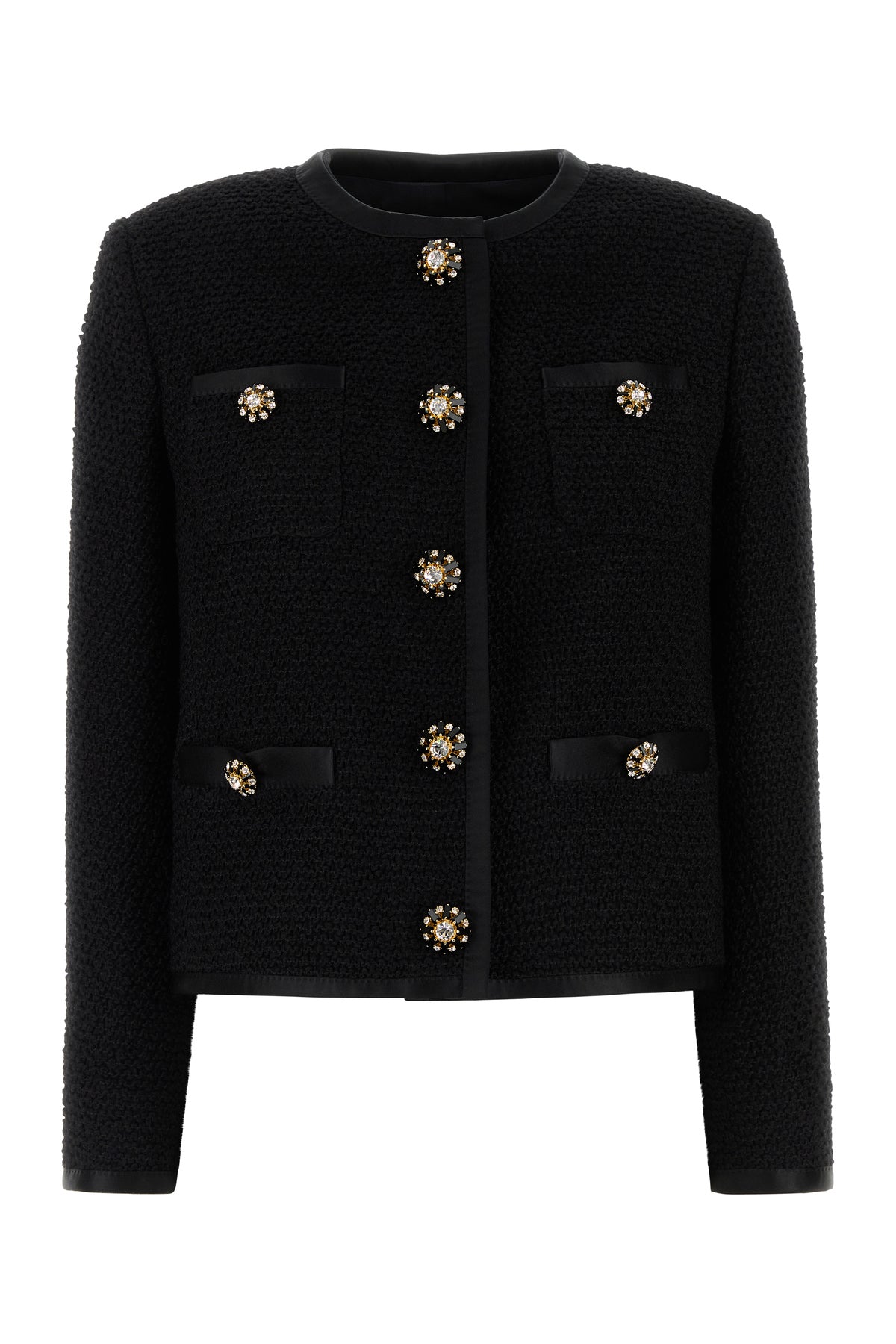 Short-cut blazer realized in virgin wool blend with tonal satin trimmings enriched by jewel buttons at the front.