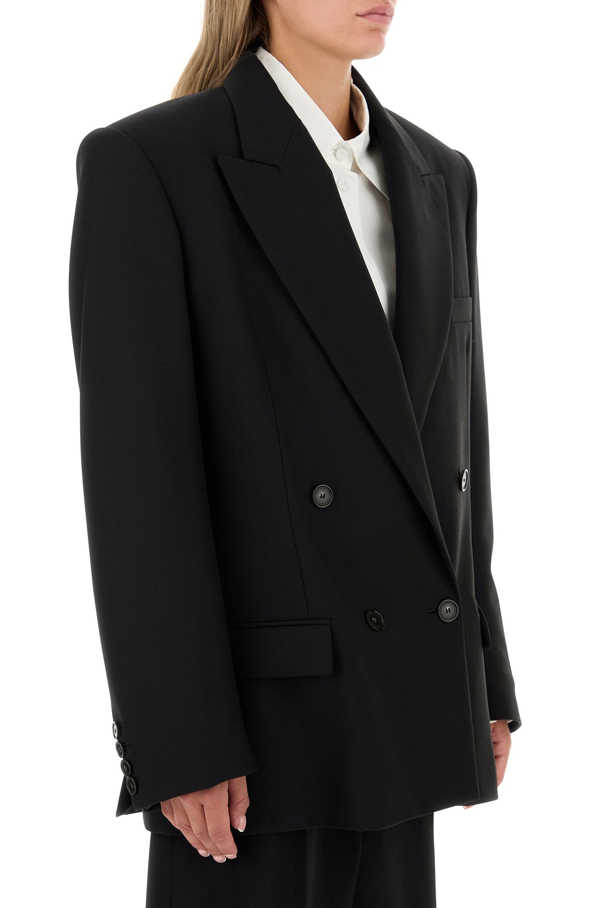 Oversize blazer realized in pure wool characterized by peak lapels.
