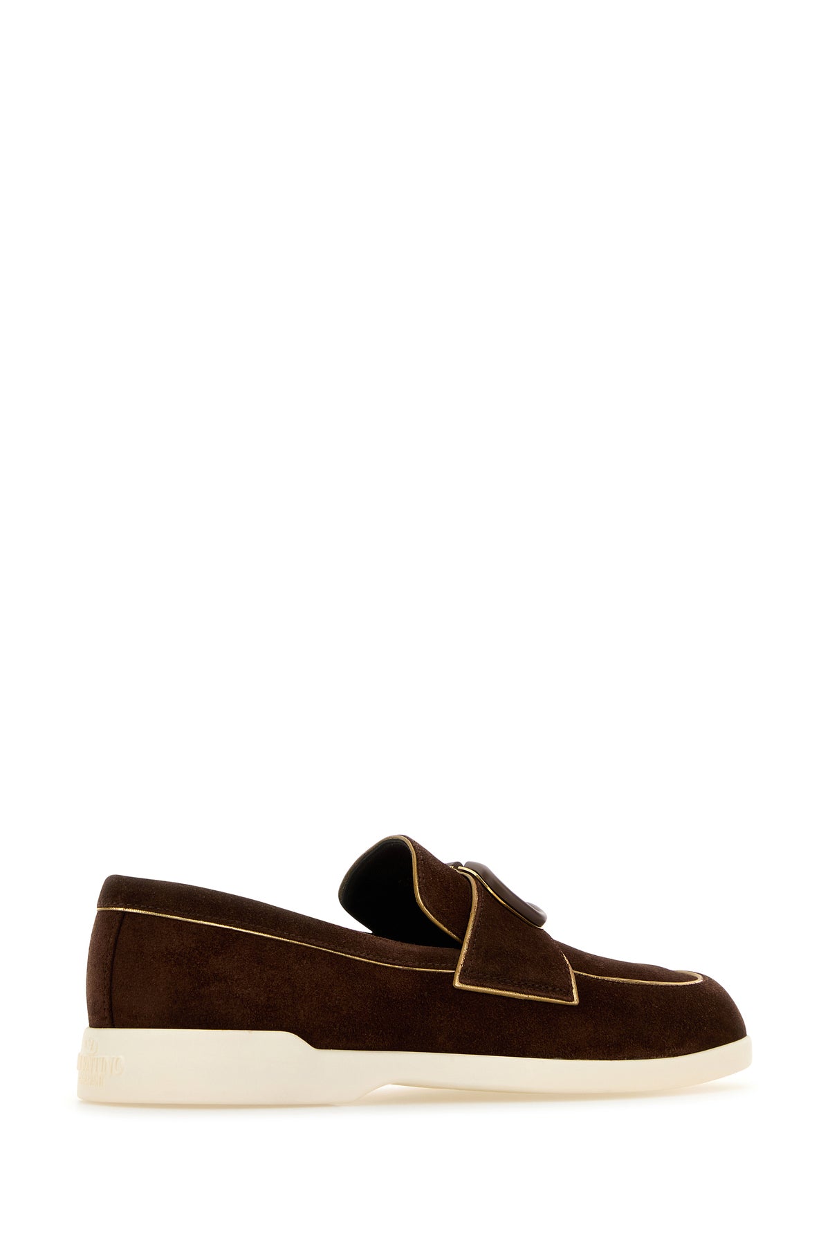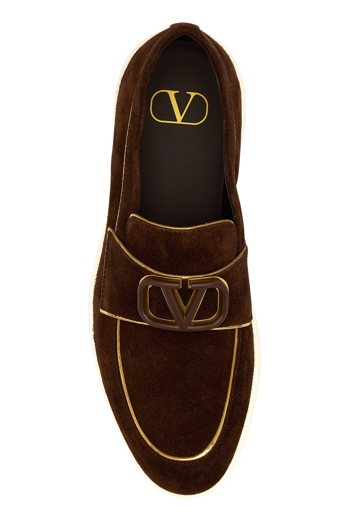 Loafers realized in suede with laminated leather trimmings enriched by tonal VLogo detail on the vamp.