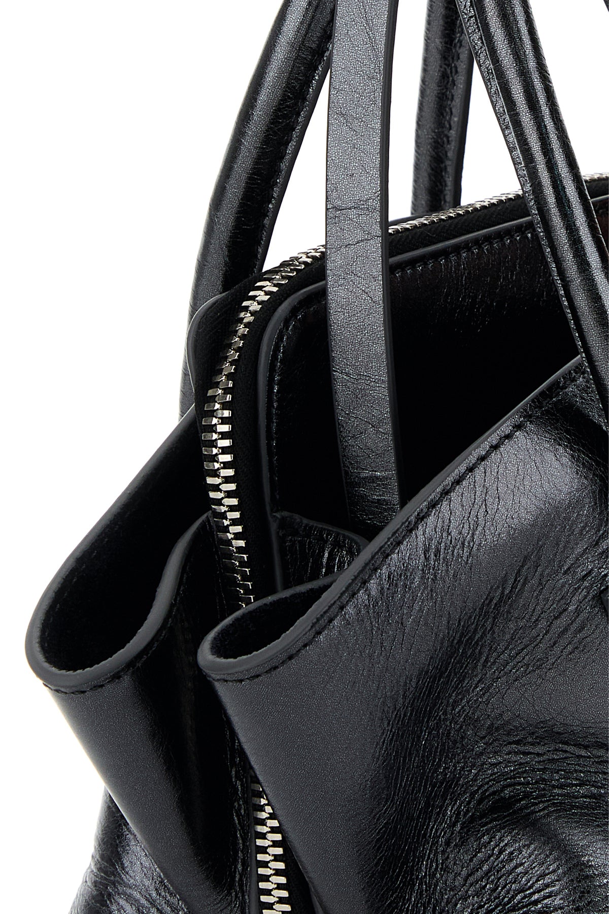 Handbag realized in craquele motif laminated leather characterized by embossed logo at the front.