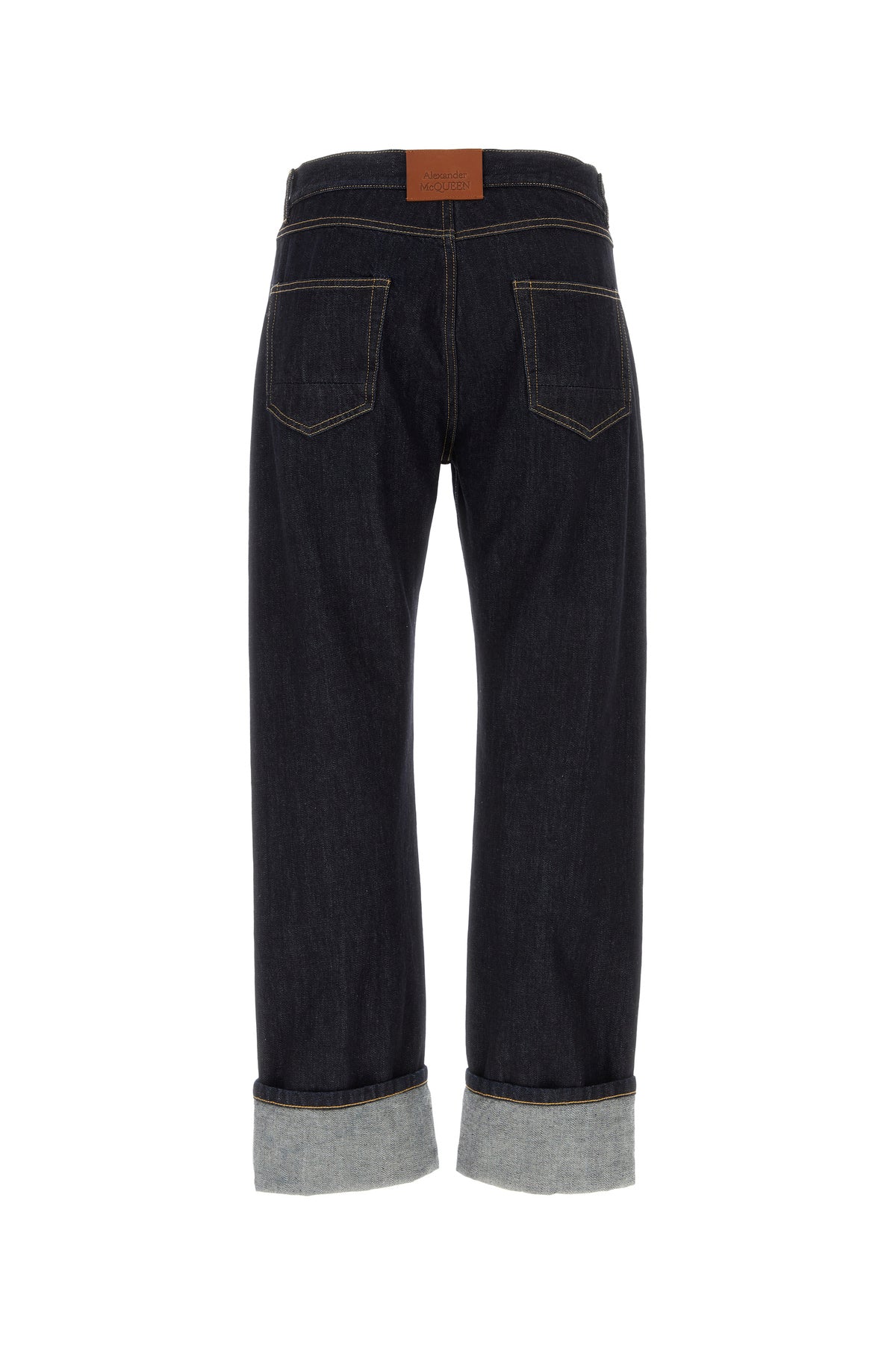 Jeans realized in pure cotton denim characterized by contrasting stitchings enriched by contrasting leather logoed label at the back.