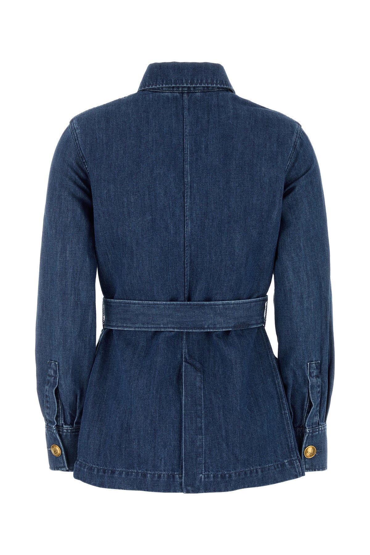 Blazer realized in cotton and linen denim enriched by metal V-Gold buttons and detachable belt to tie at the waist.