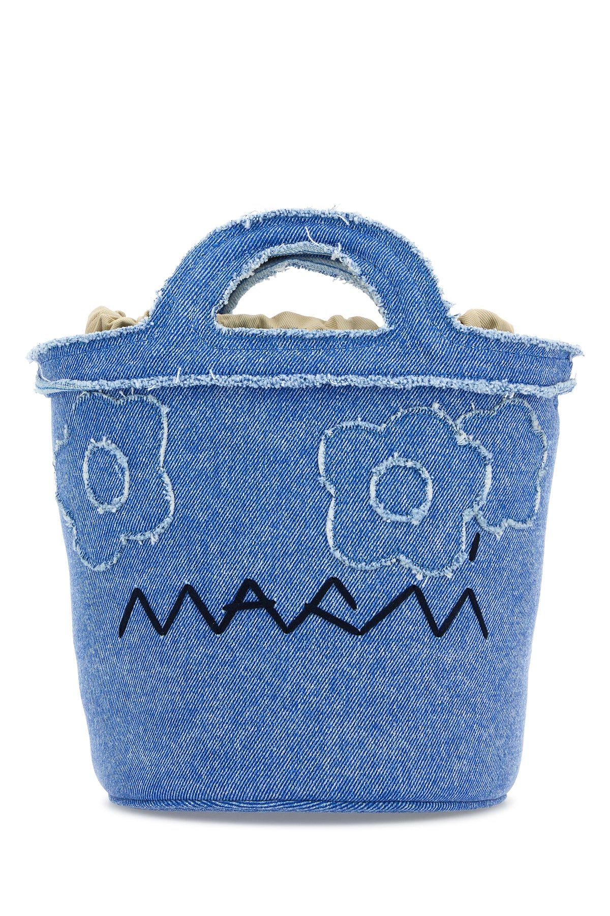 Bucket bag realized in denim characterized by contrasting embroidered logo and floral embroideries at the front.